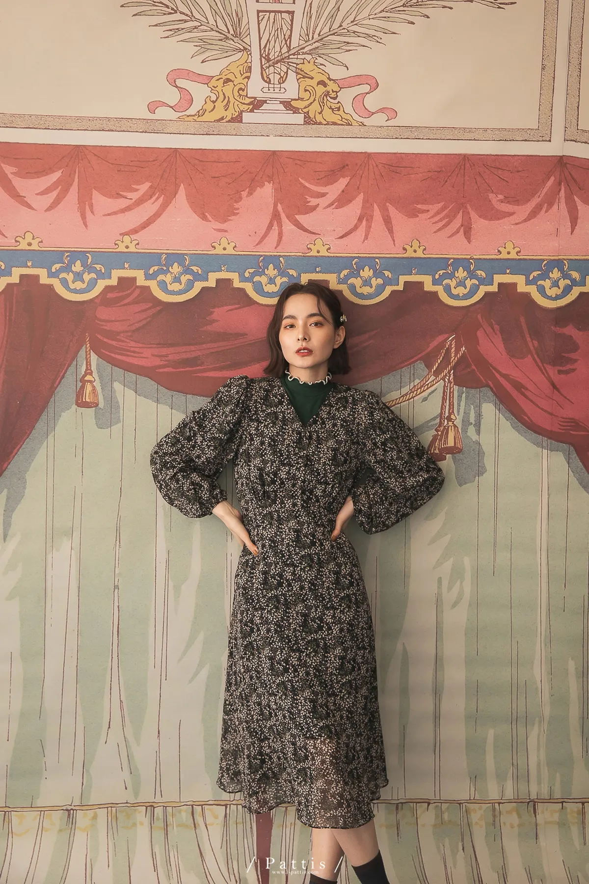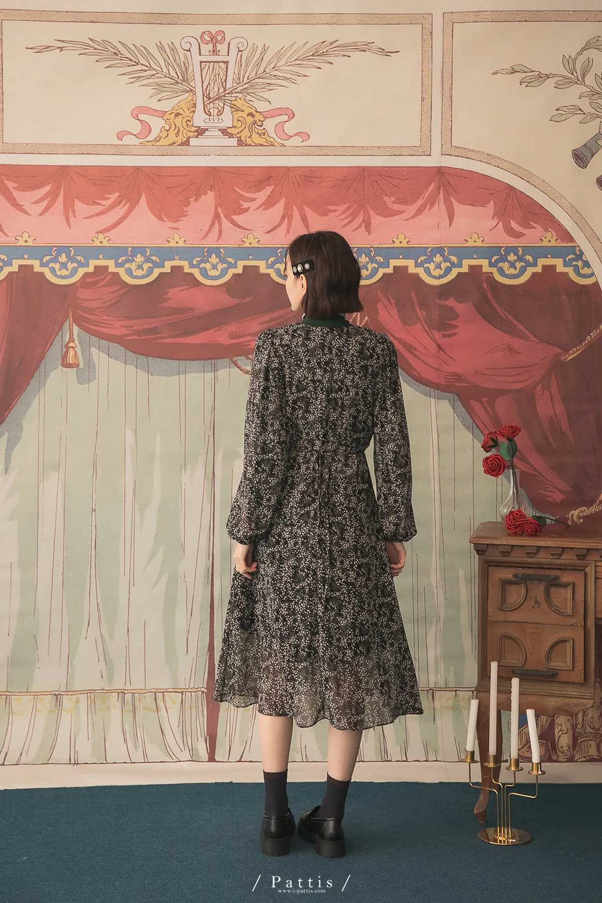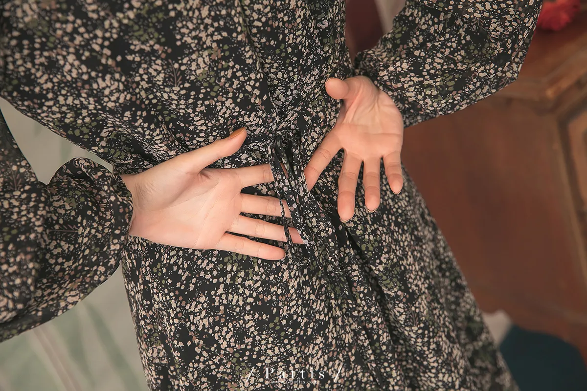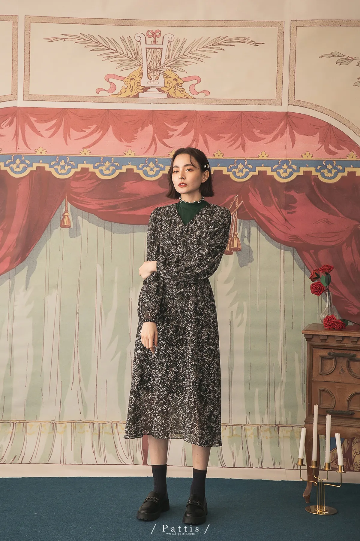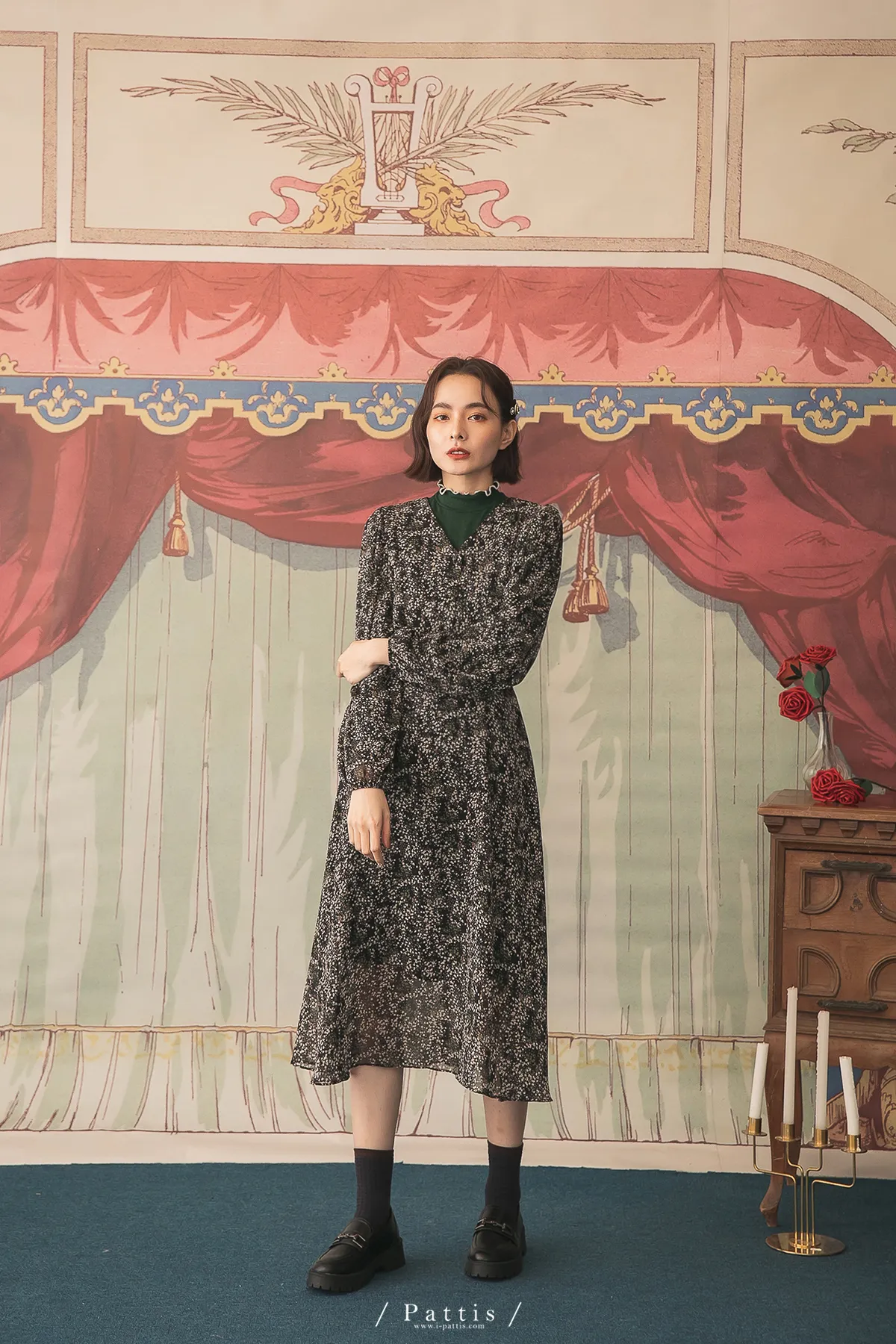 落花碎成星光 | V領滿天星碎花綁帶洋裝(黑)
