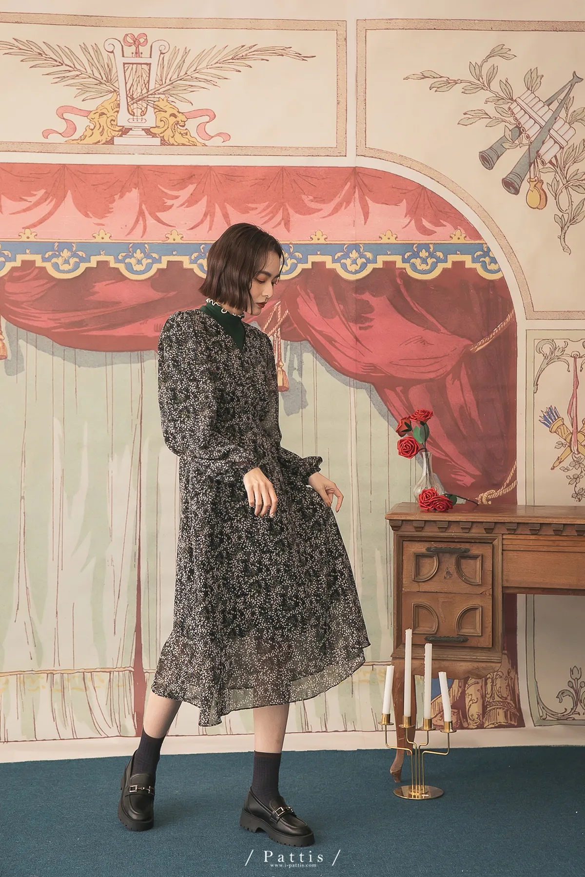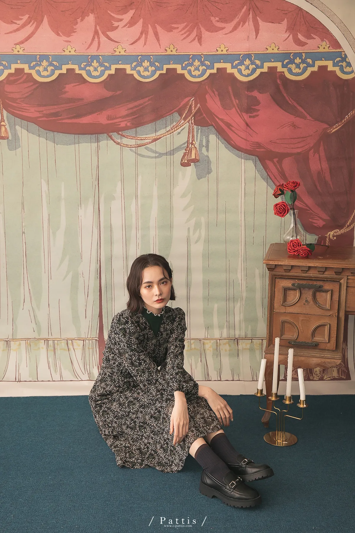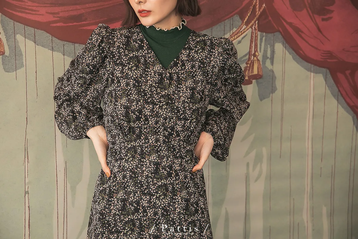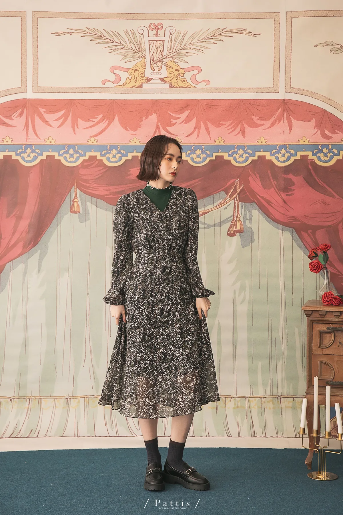 落花碎成星光 | V領滿天星碎花綁帶洋裝(黑)