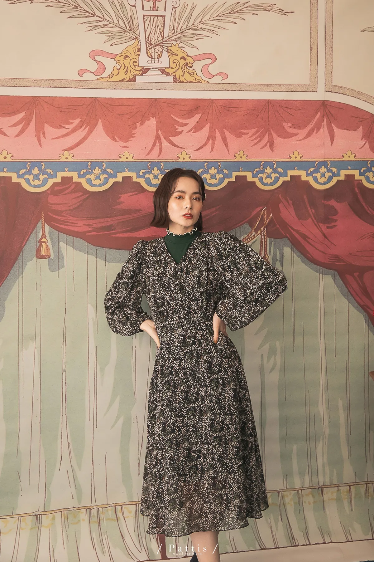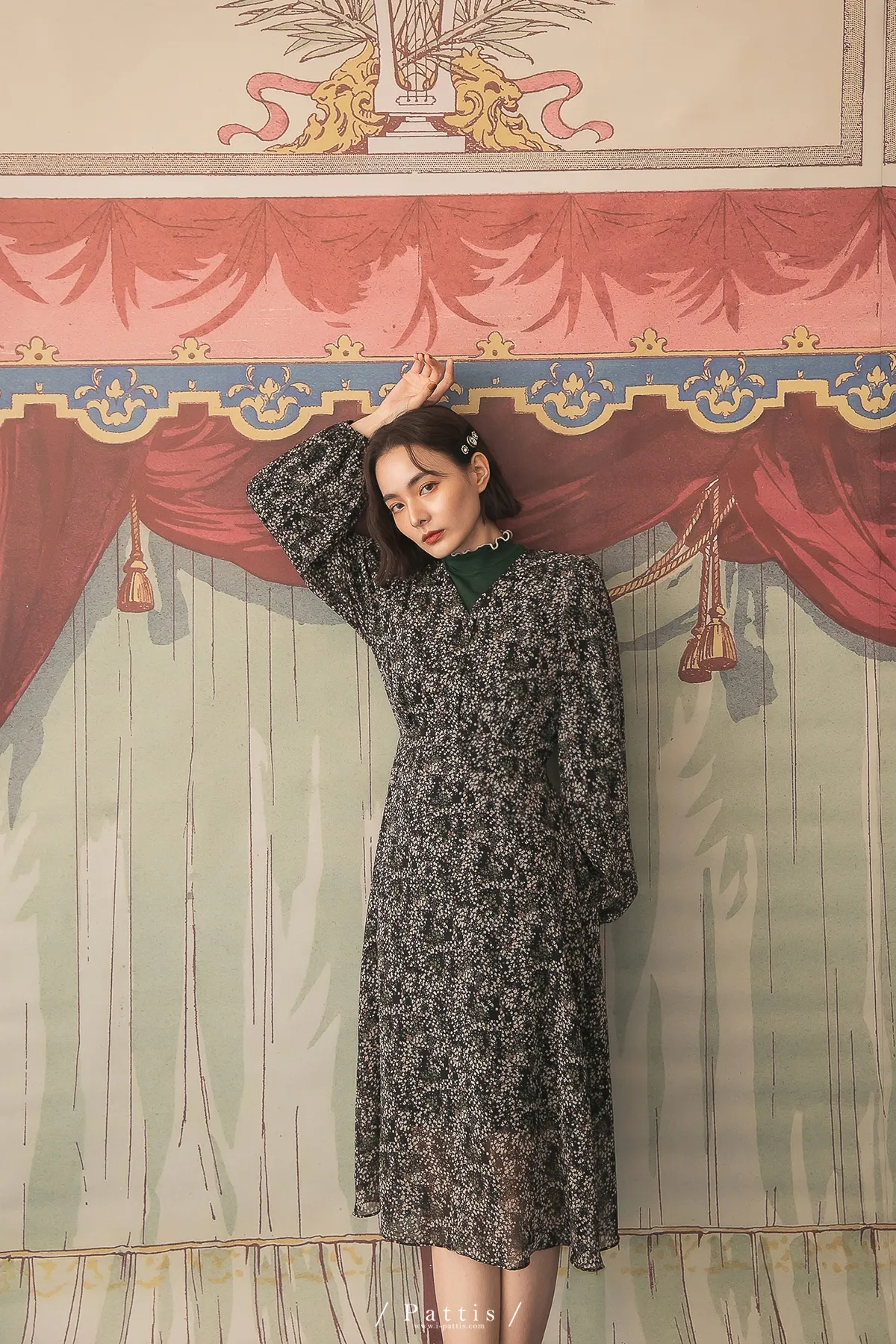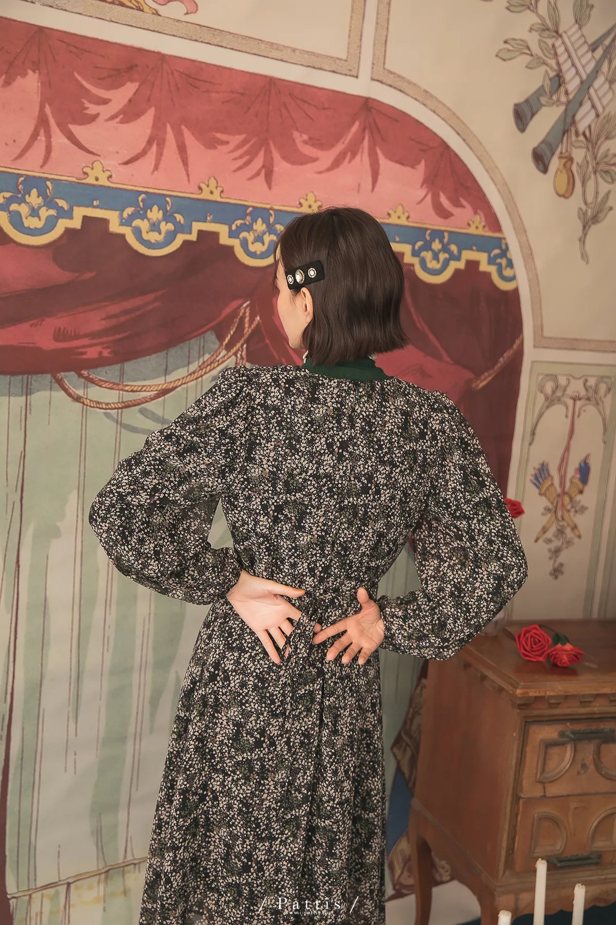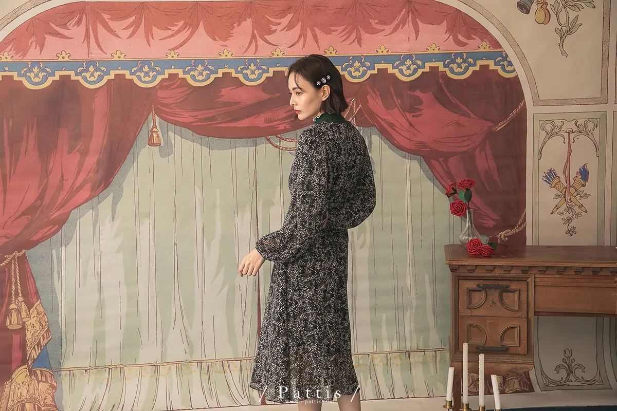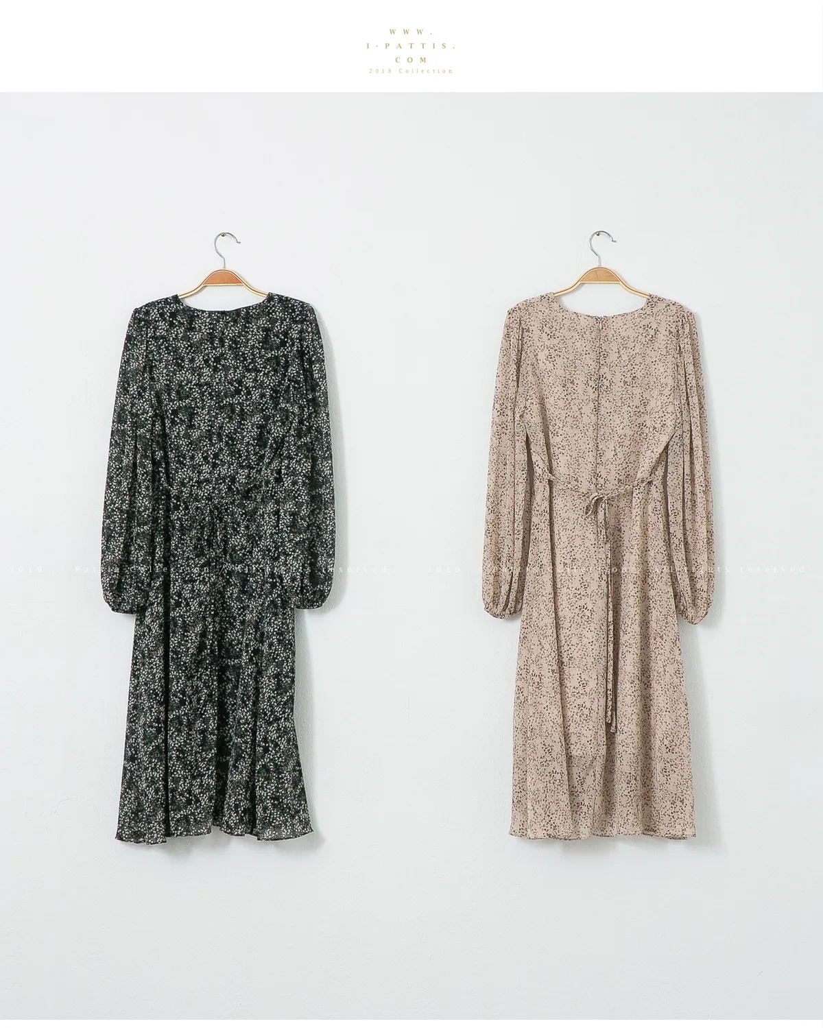 落花碎成星光 | V領滿天星碎花綁帶洋裝(黑)