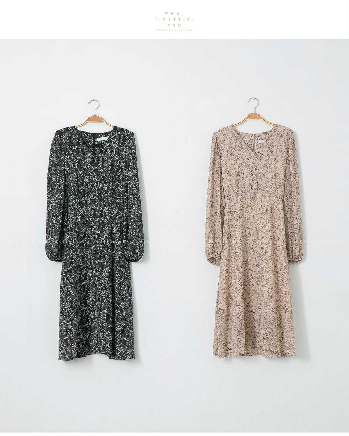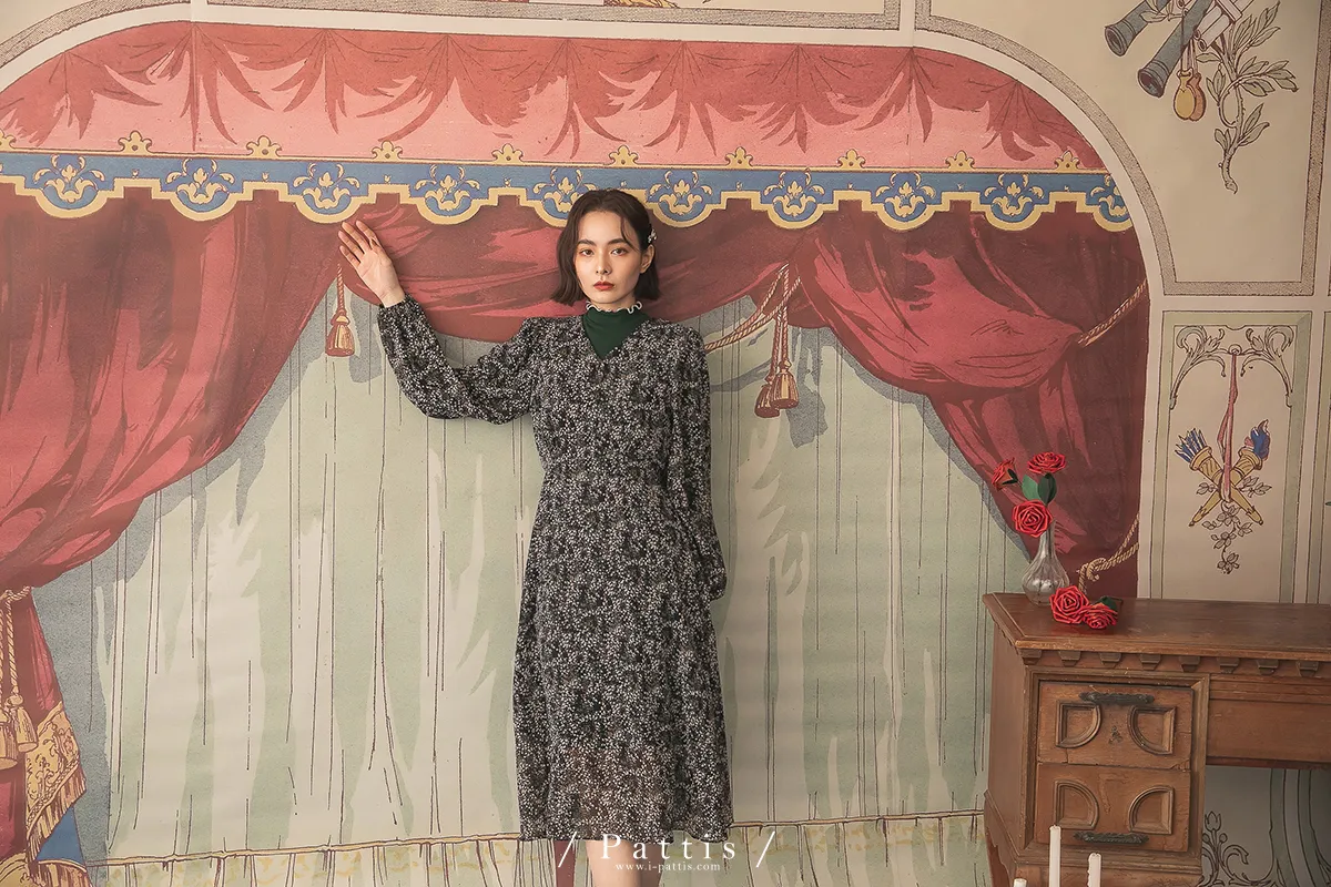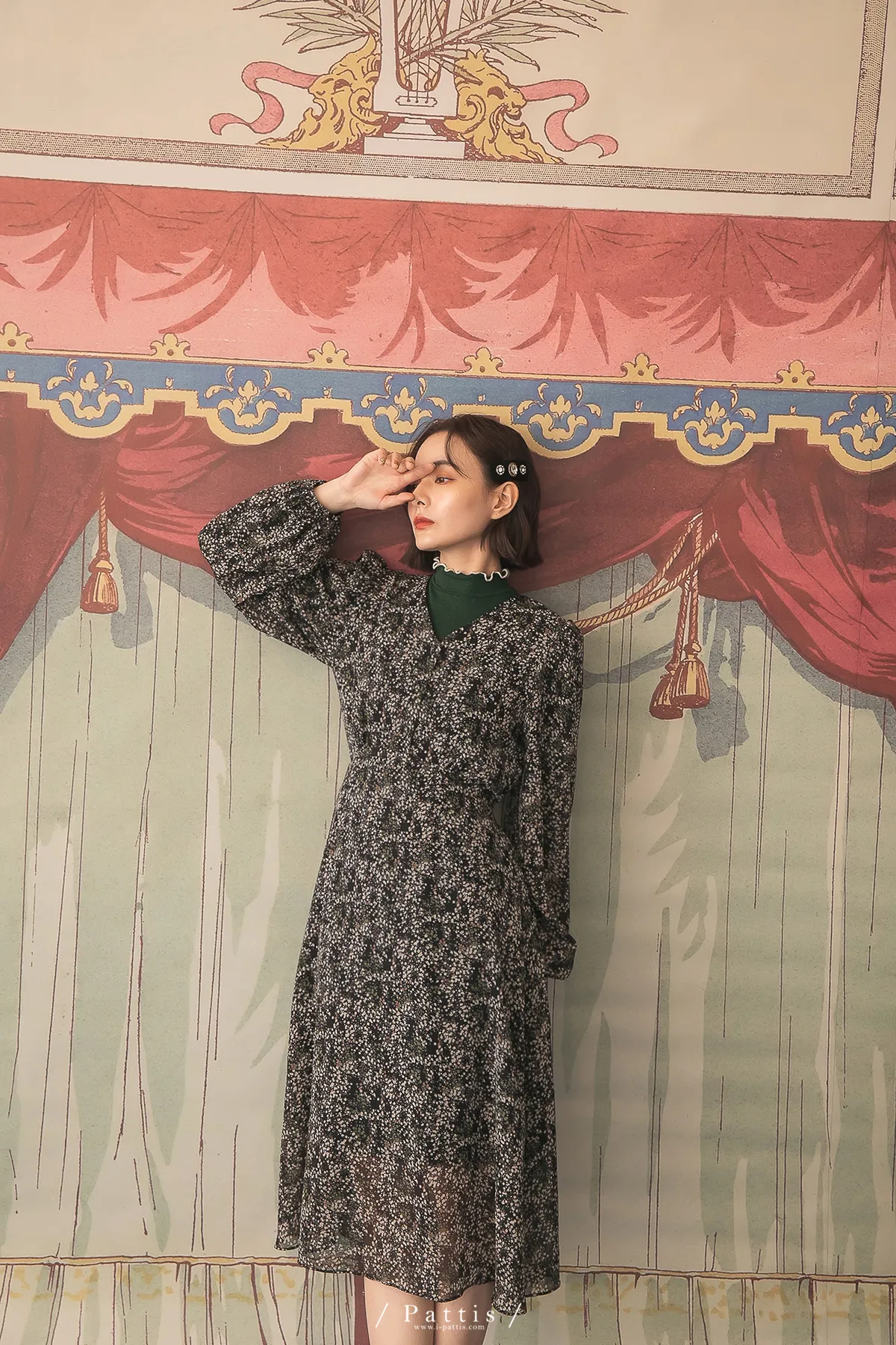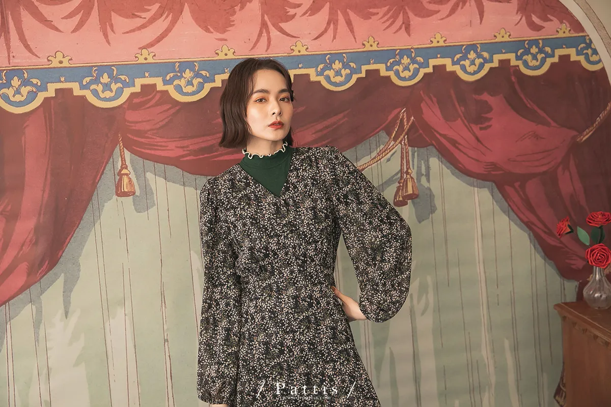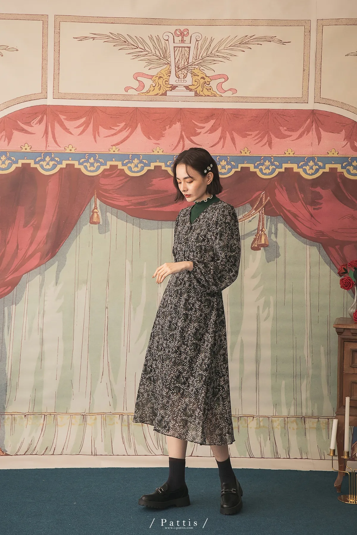 落花碎成星光 | V領滿天星碎花綁帶洋裝(黑)