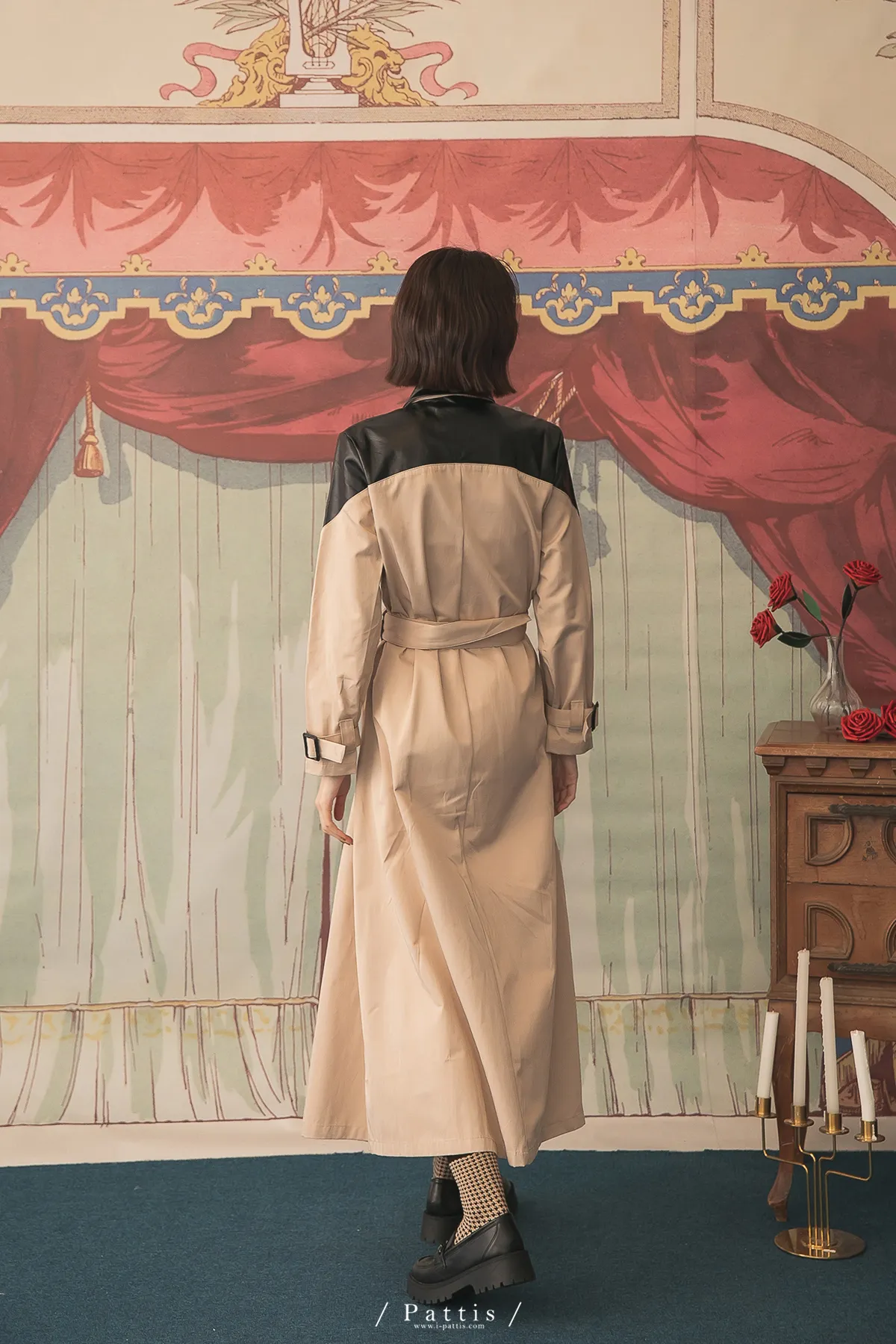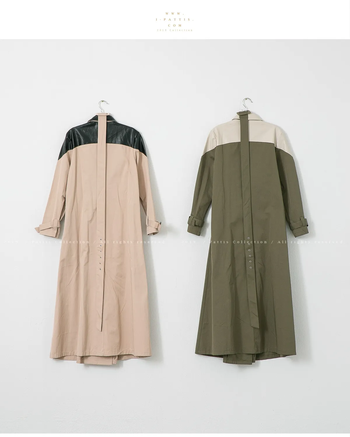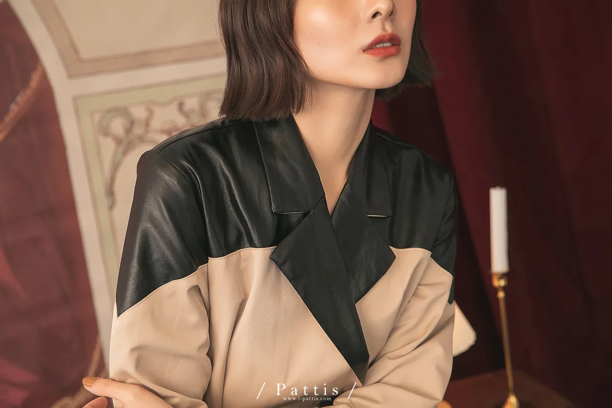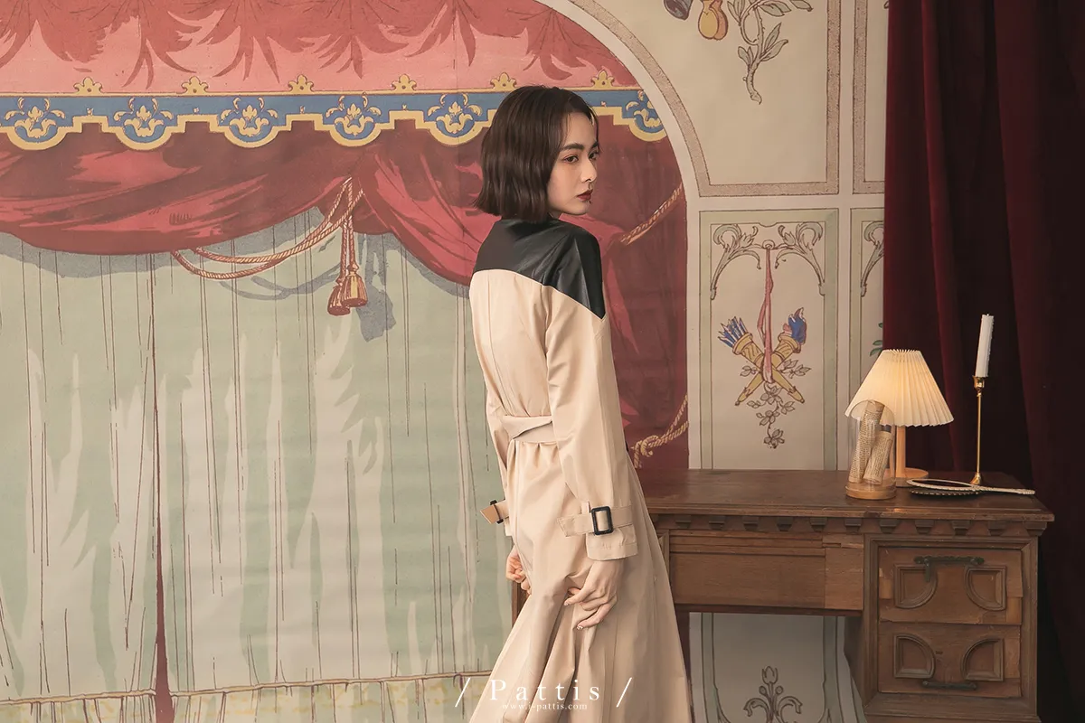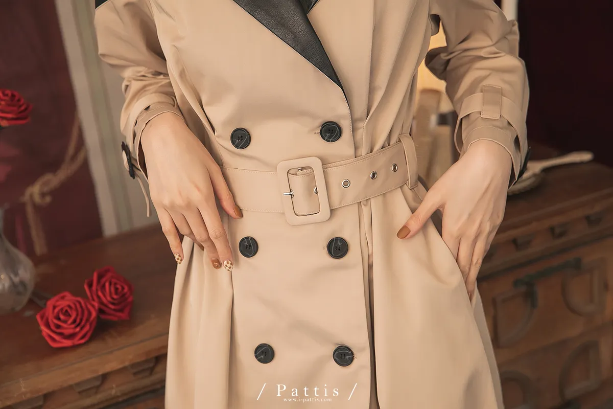 色盲的富士山 | 皮革拼接繫帶2way洋裝風衣(黑杏)