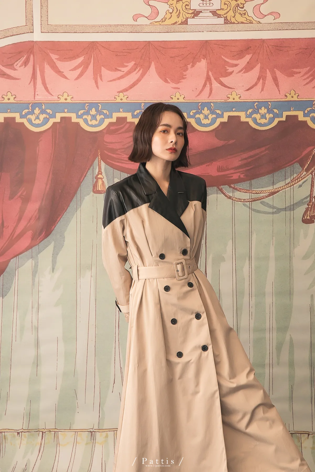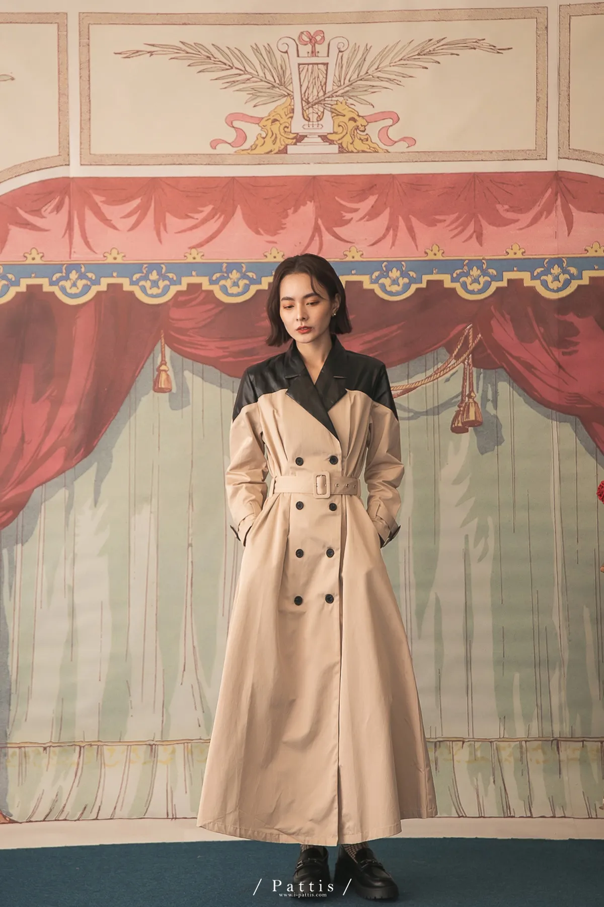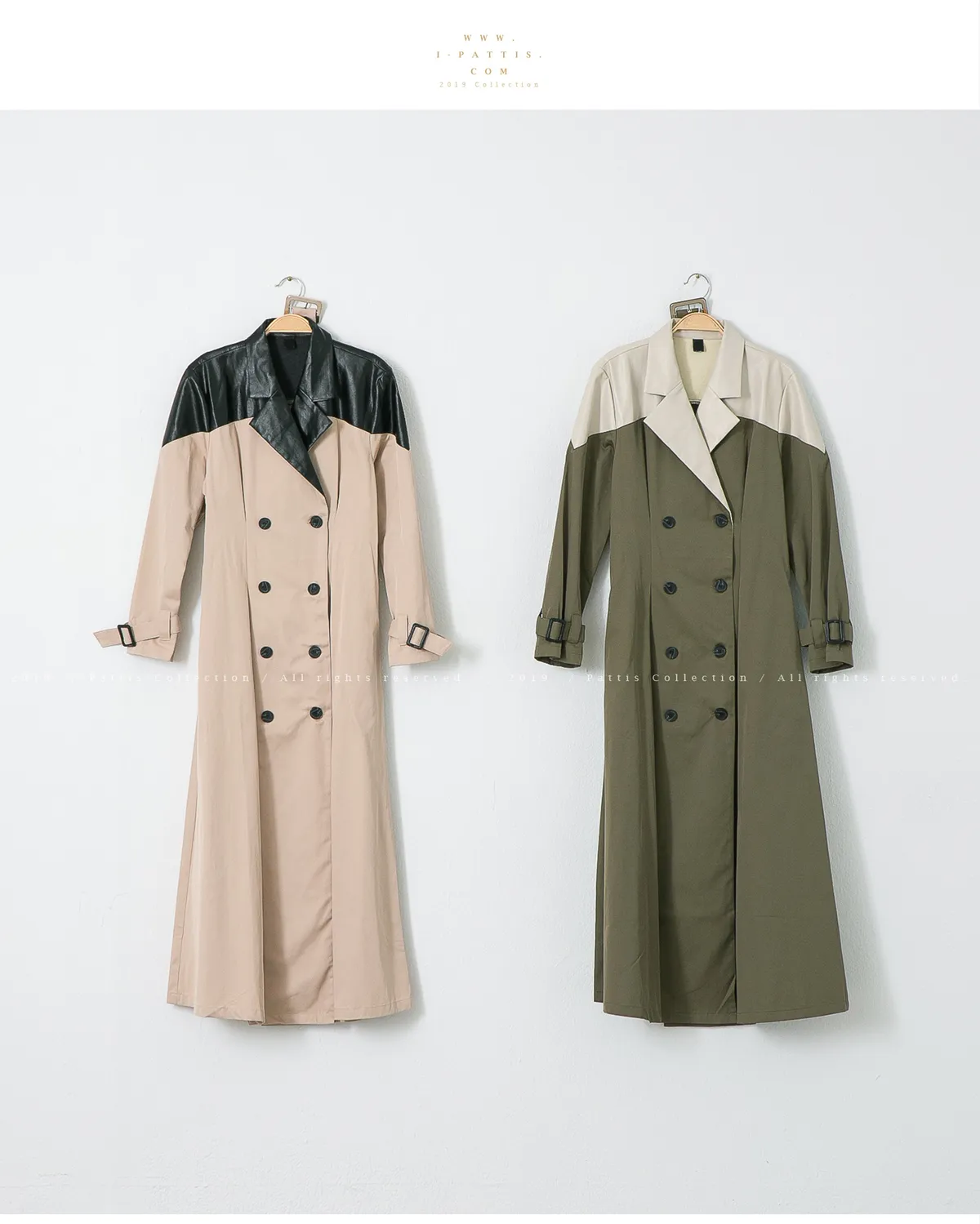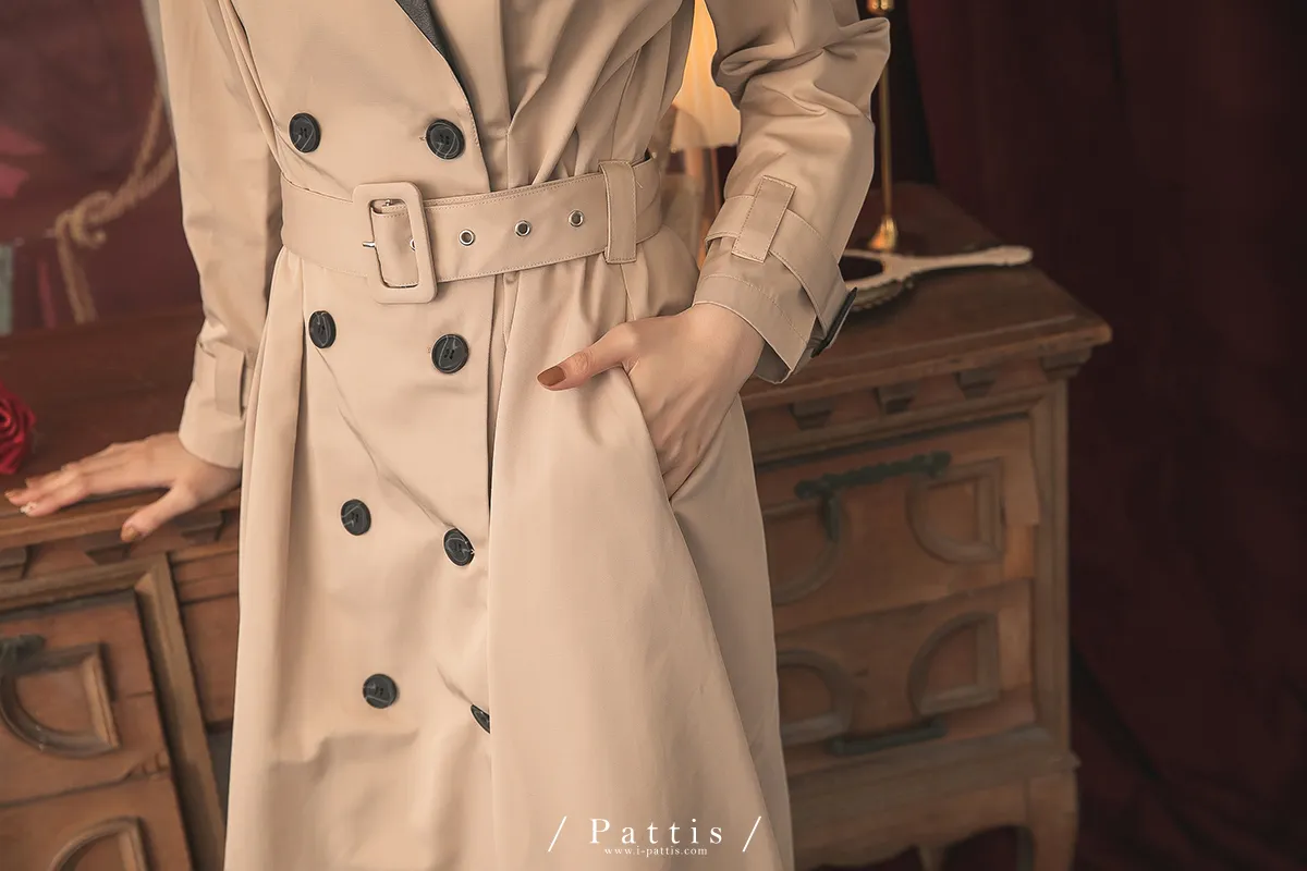 色盲的富士山 | 皮革拼接繫帶2way洋裝風衣(黑杏)