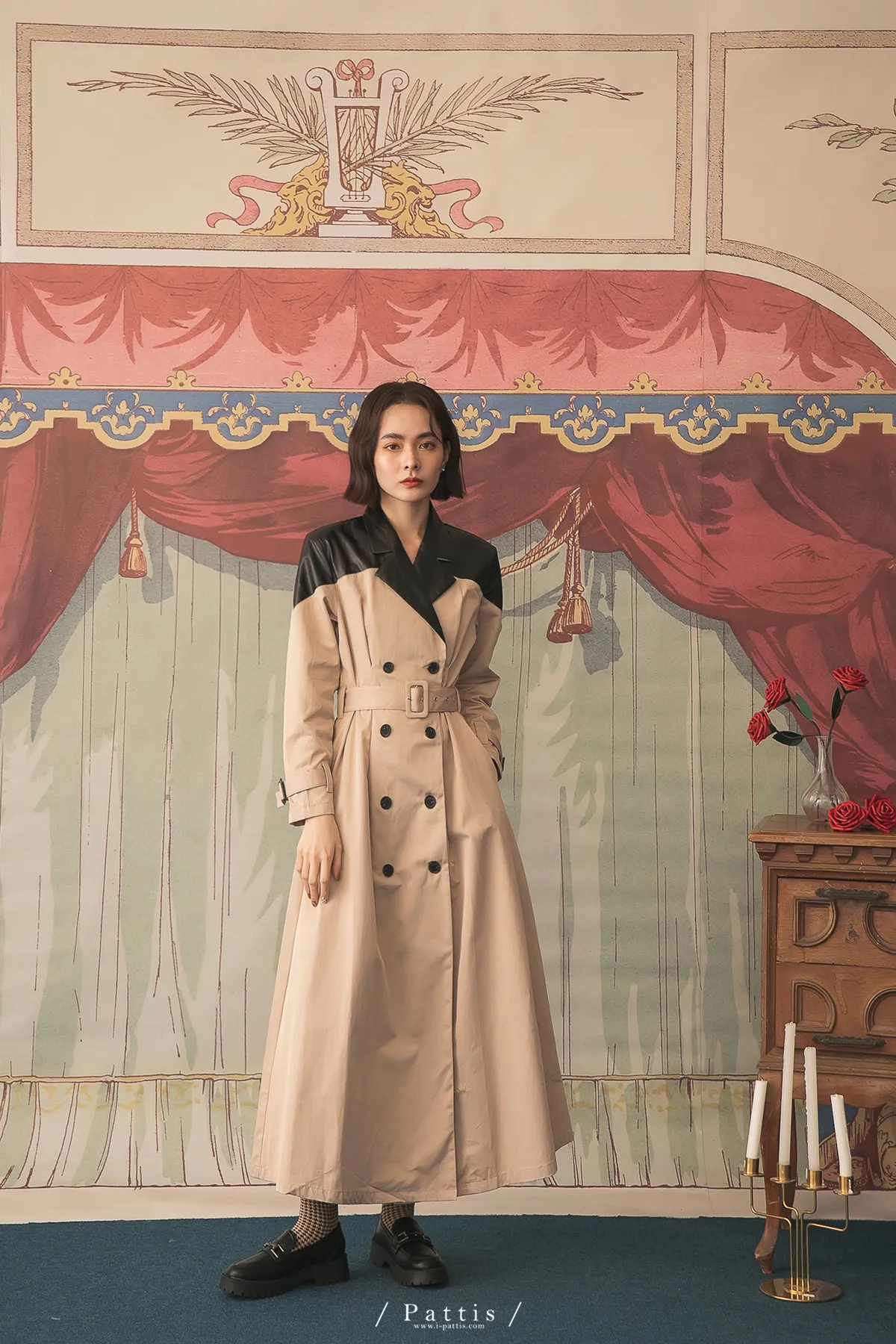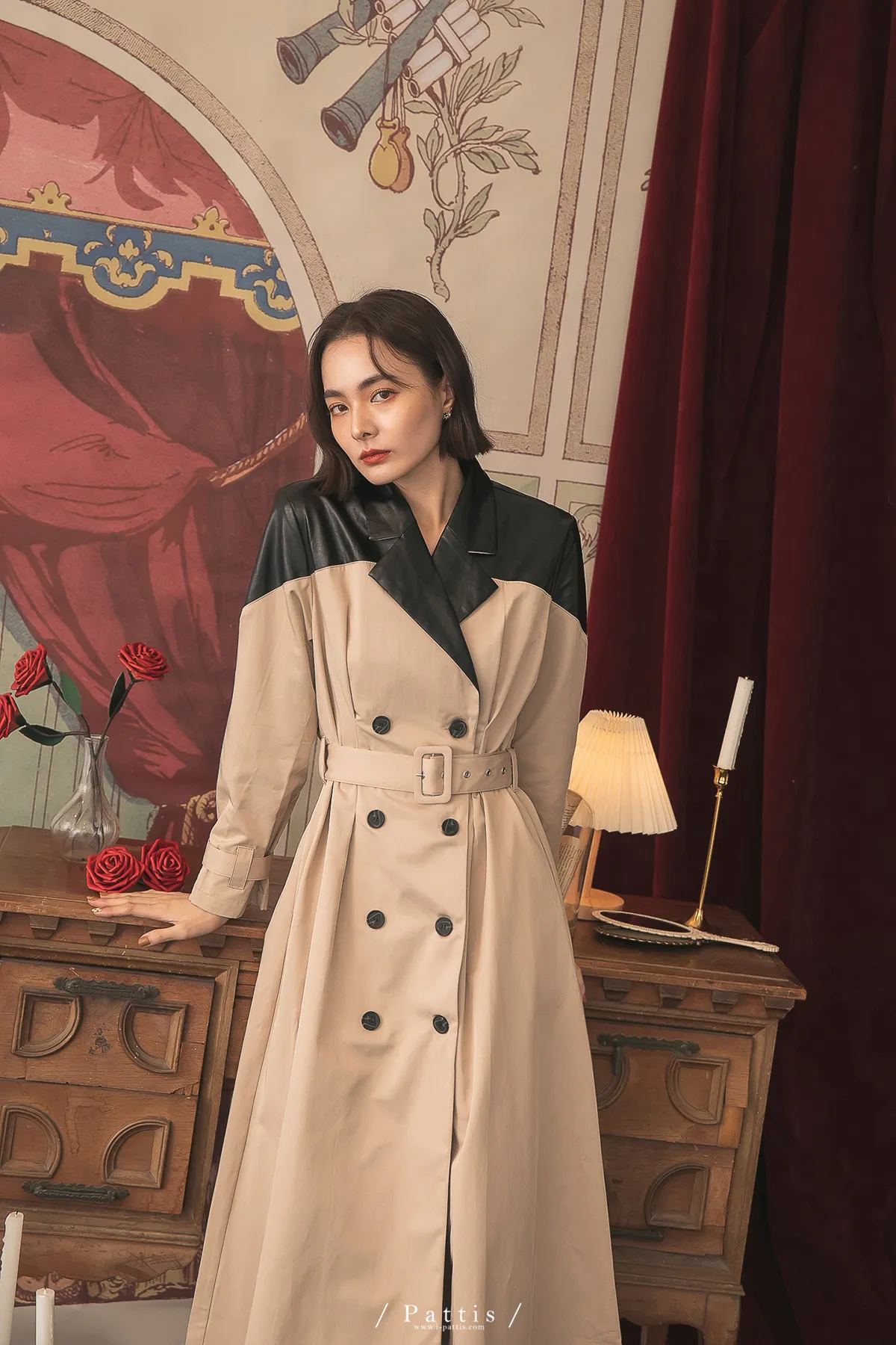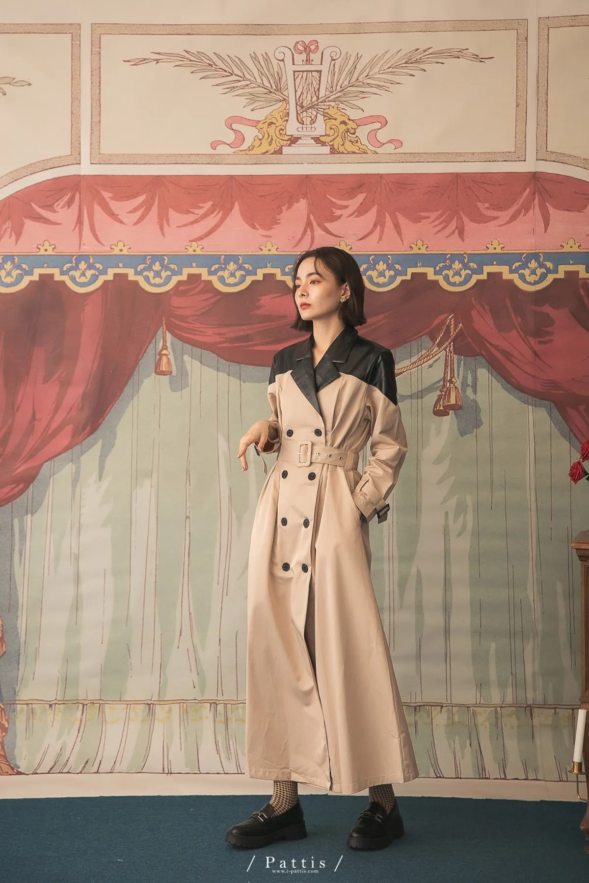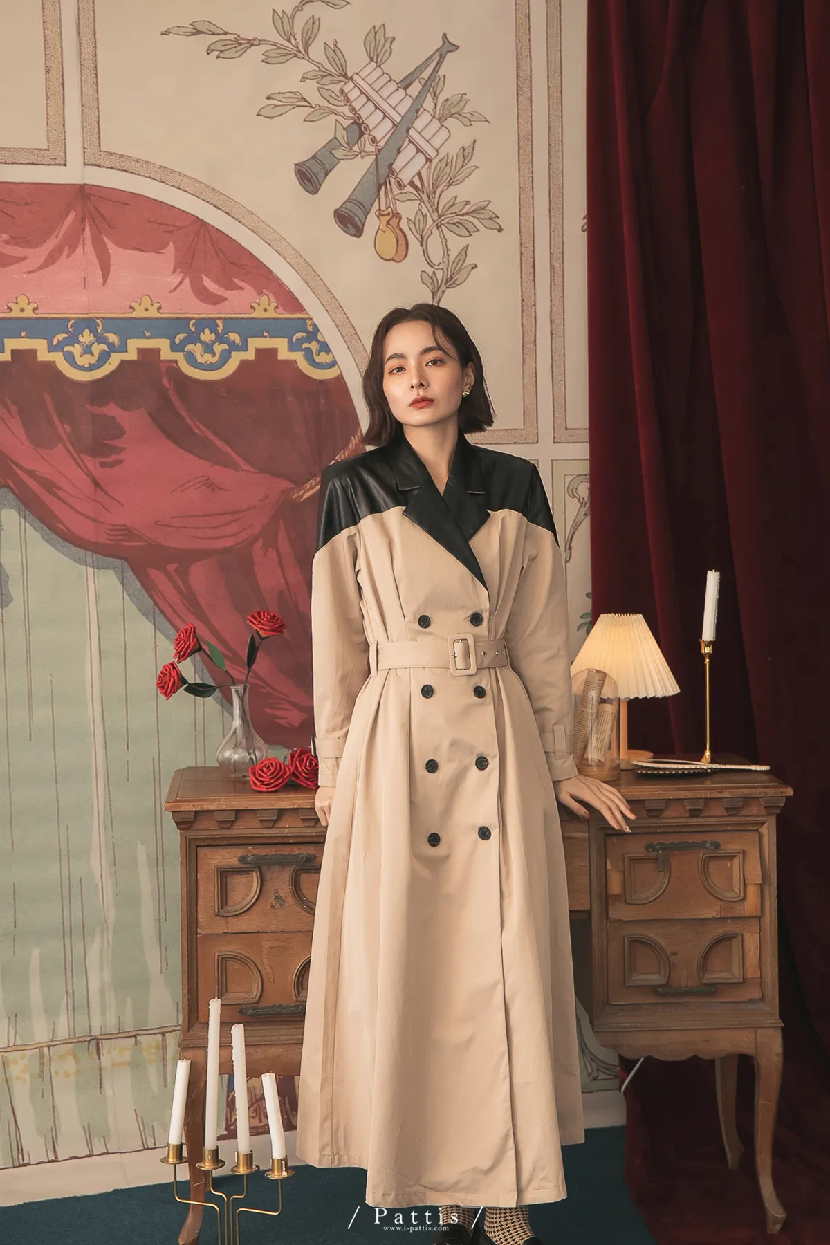 色盲的富士山 | 皮革拼接繫帶2way洋裝風衣(黑杏)