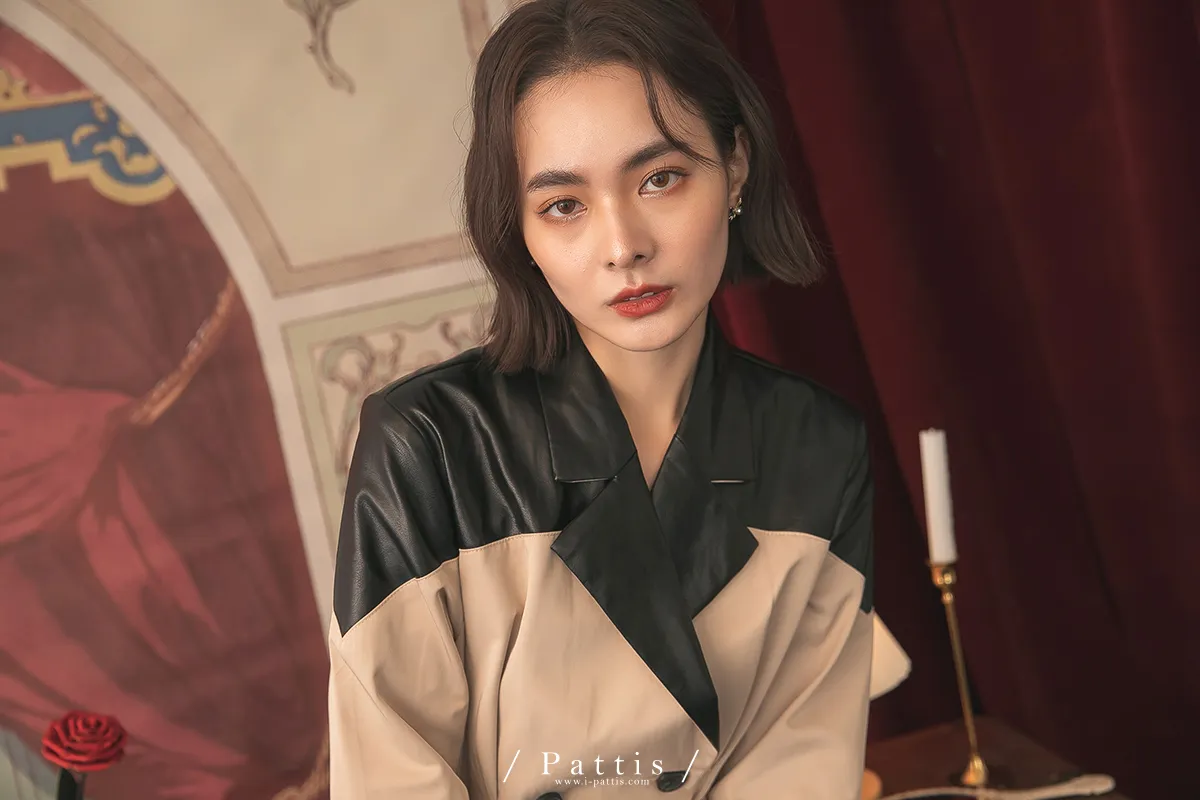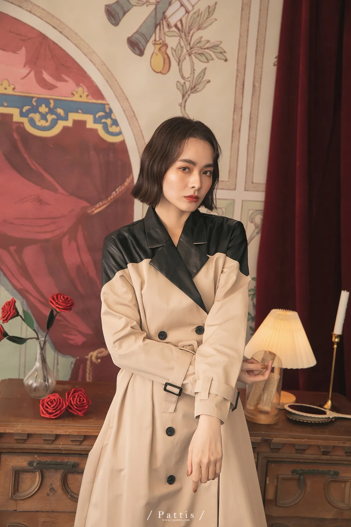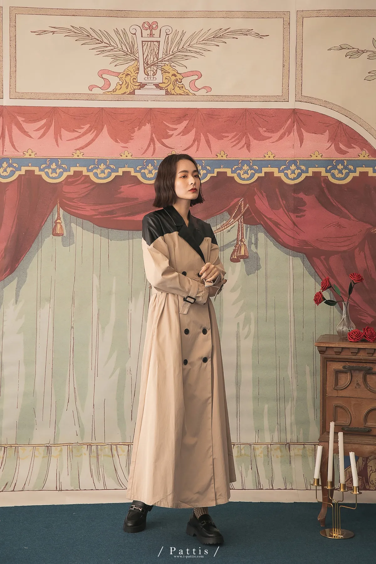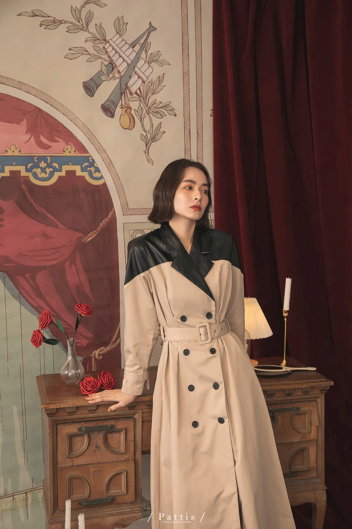 色盲的富士山 | 皮革拼接繫帶2way洋裝風衣(黑杏)