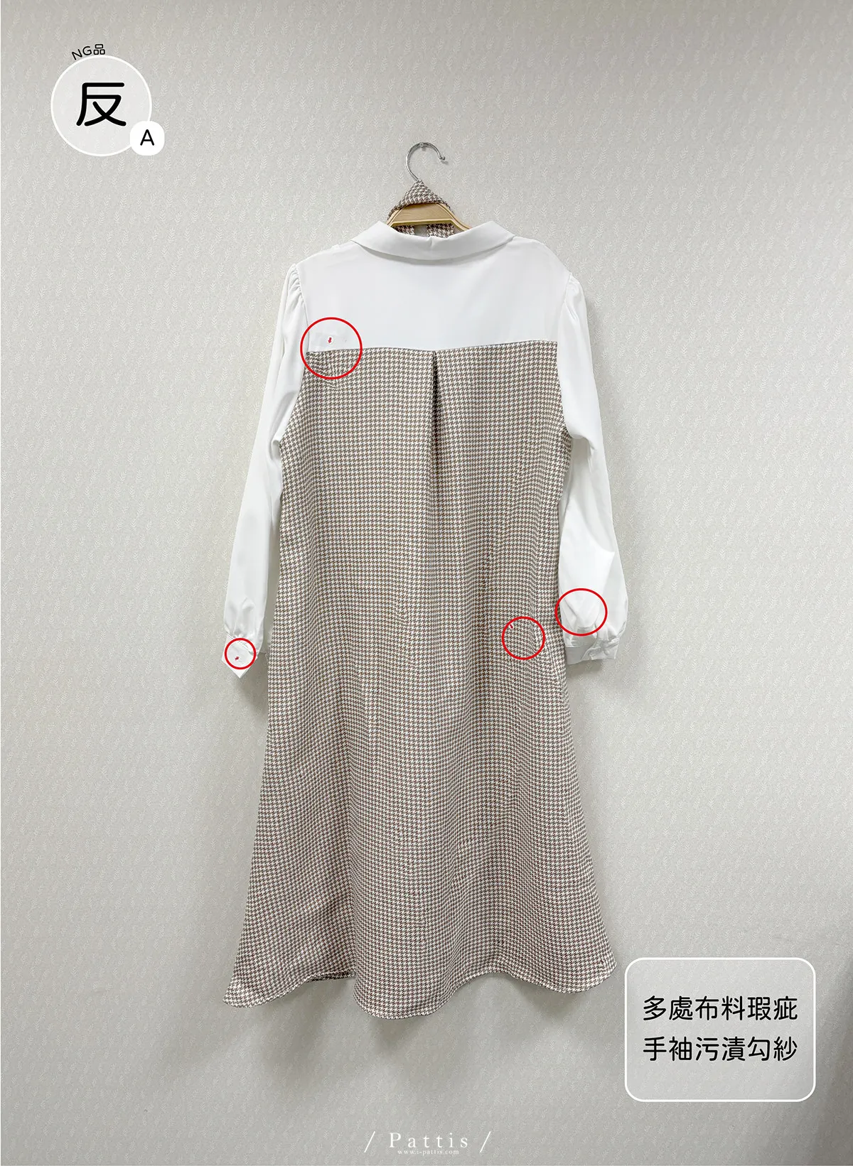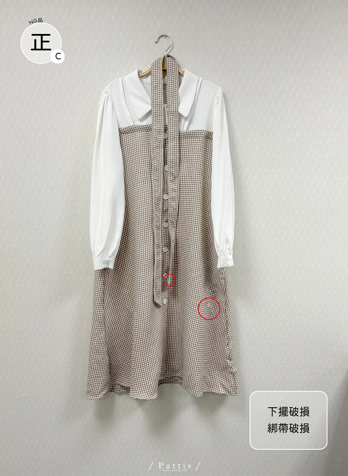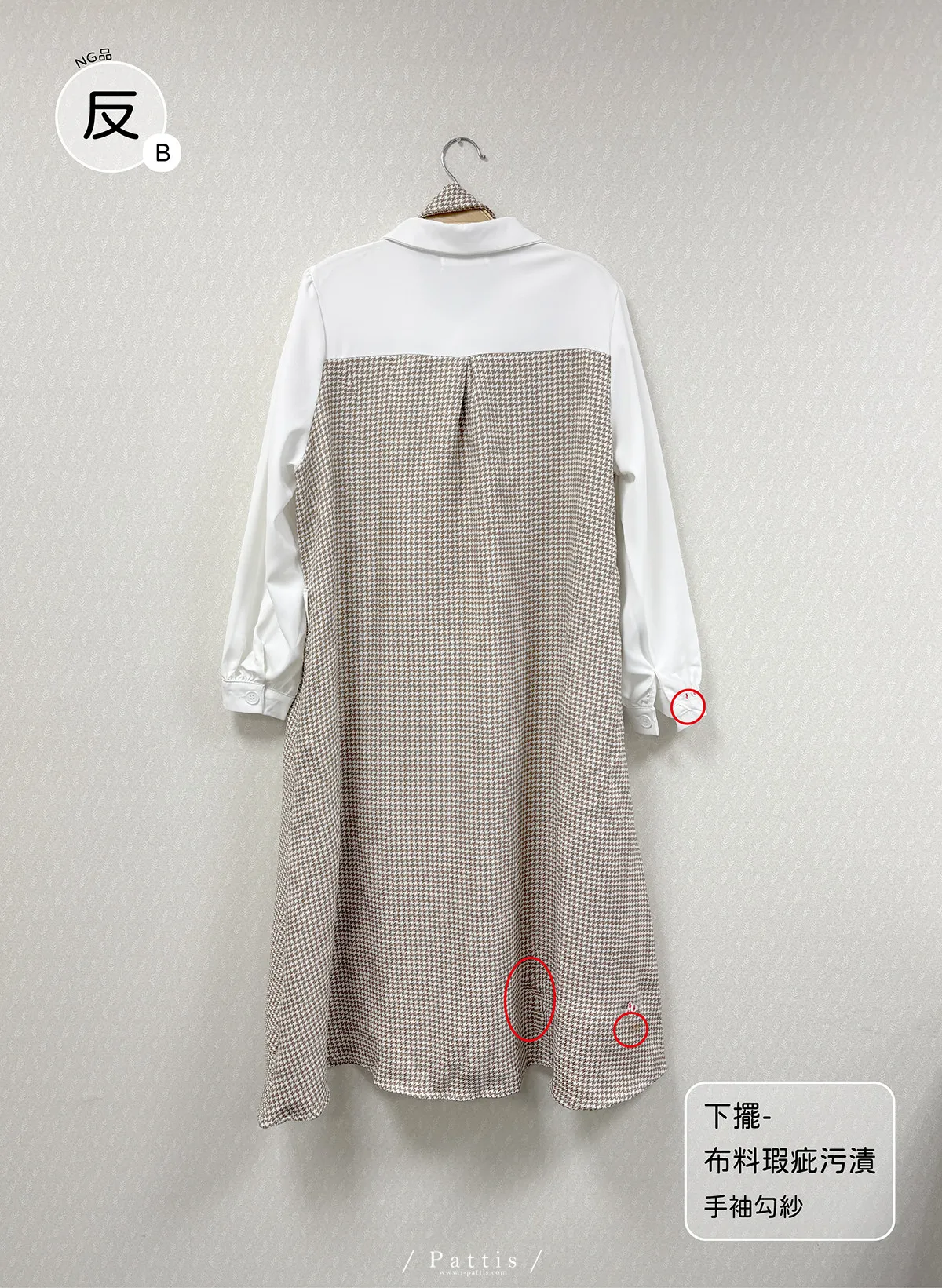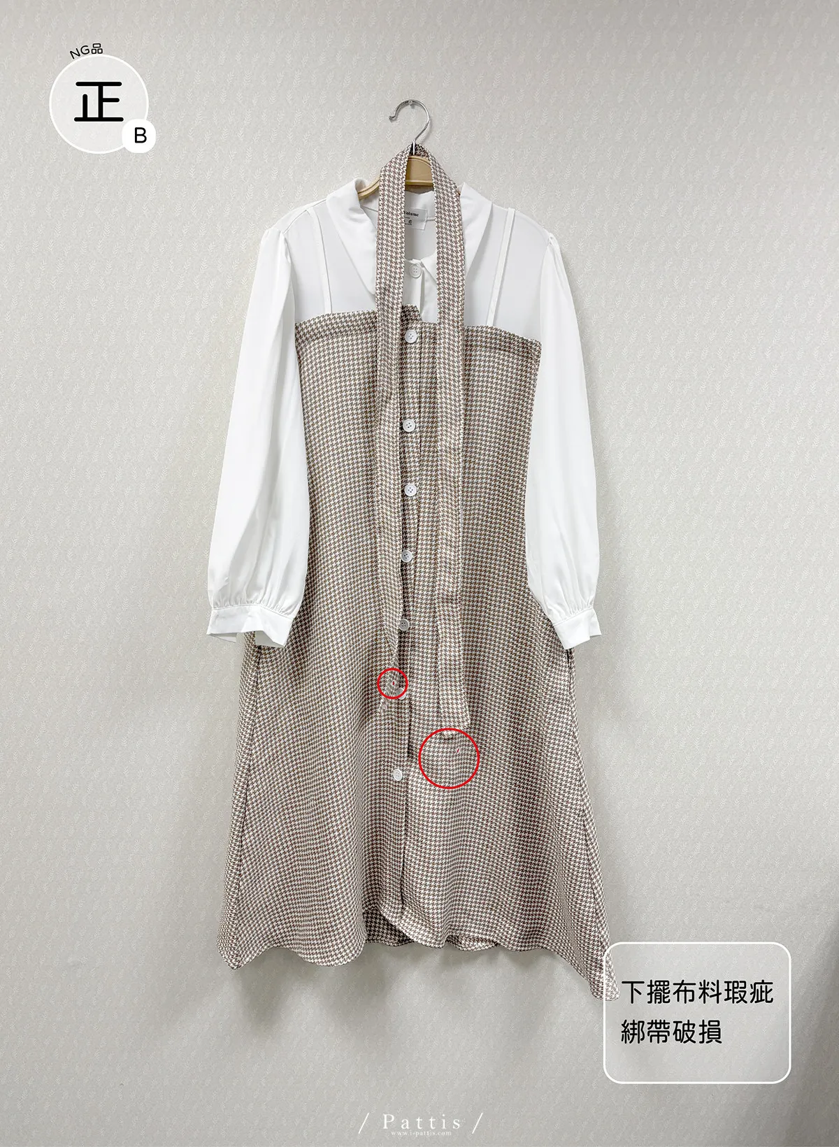 / NG品 原價$1390 / 拼接格紋不對稱綁帶襯衫洋裝(米白)