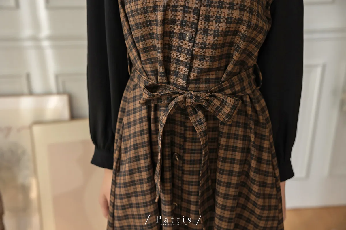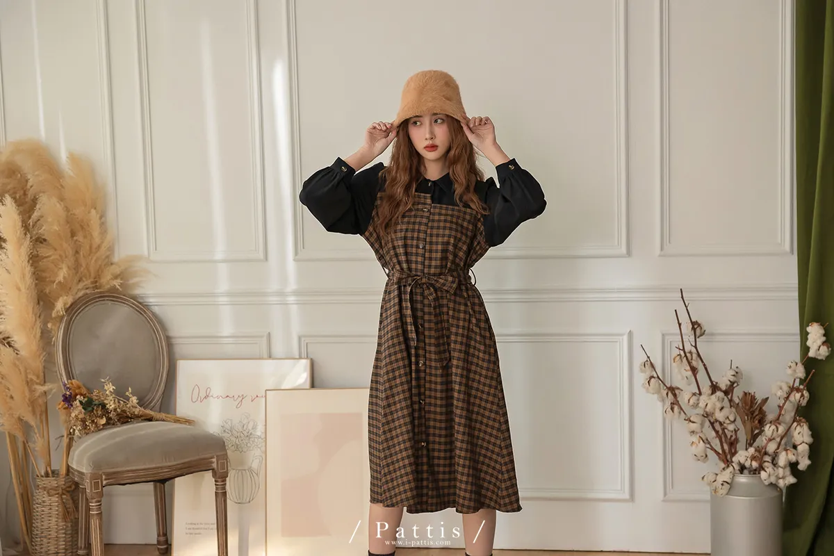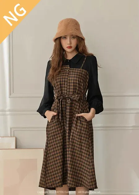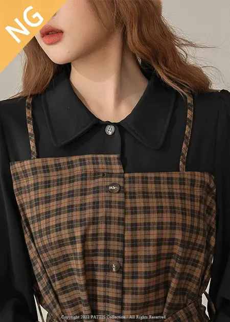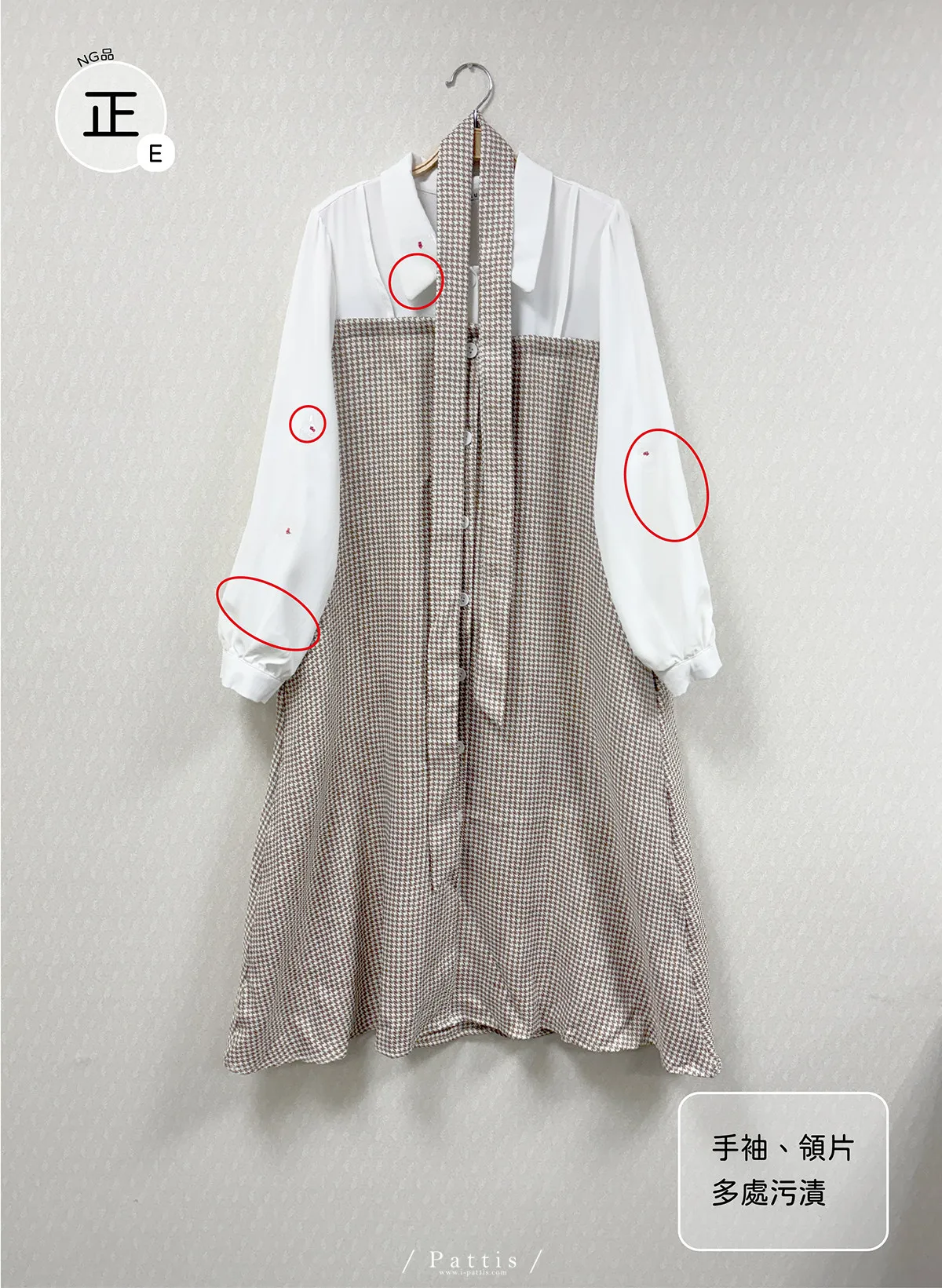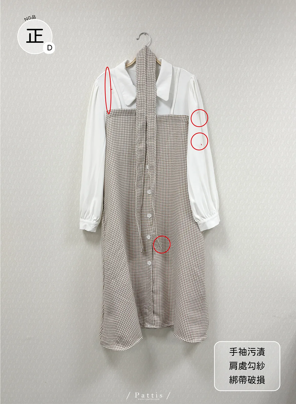 / NG品 原價$1390 / 拼接格紋不對稱綁帶襯衫洋裝(米白)