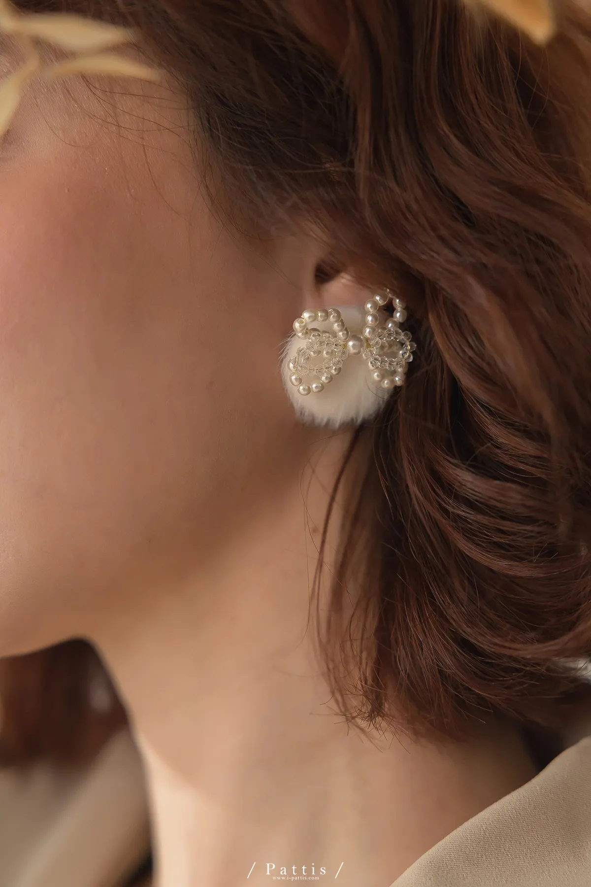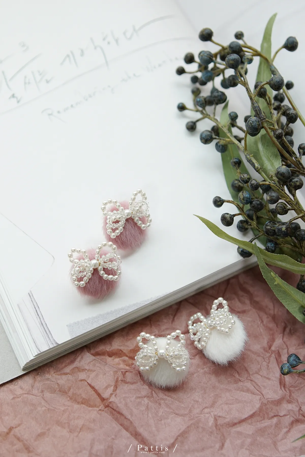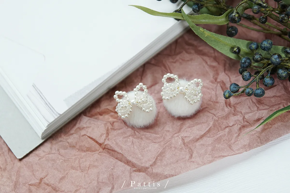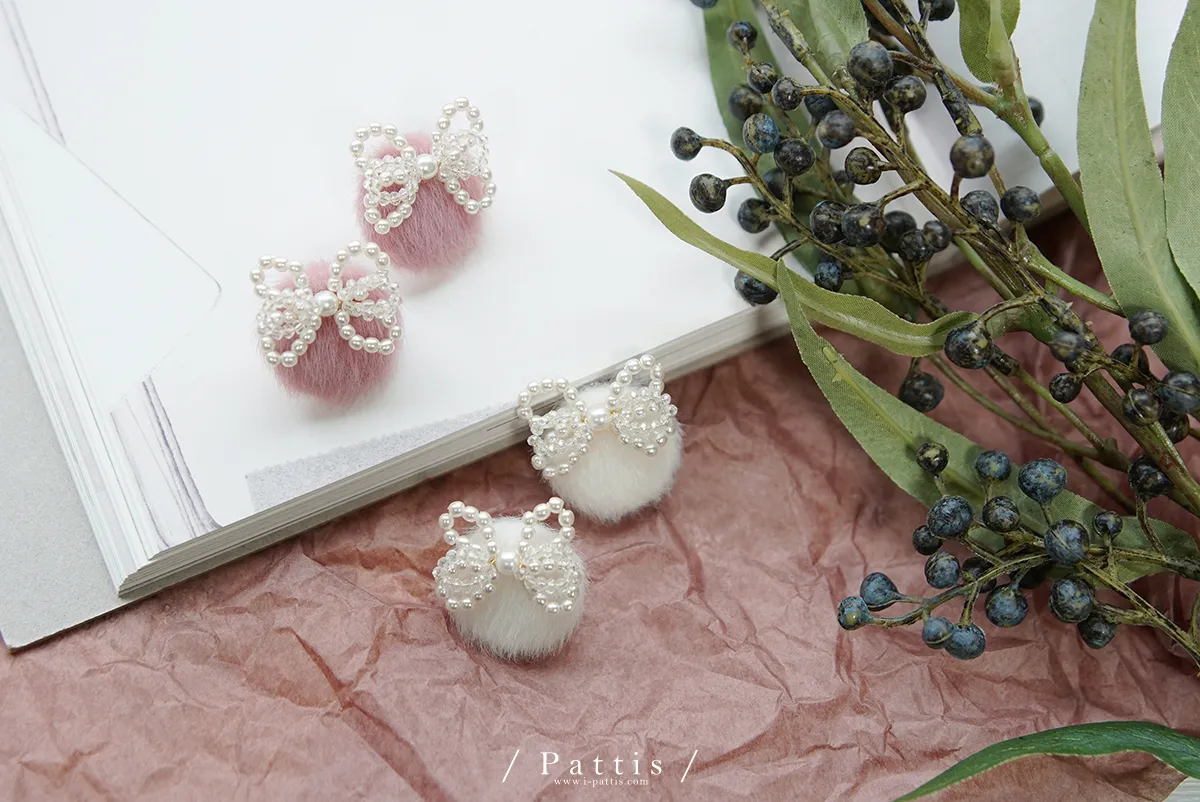 珍珠蝴蝶結毛球耳環(白/粉)