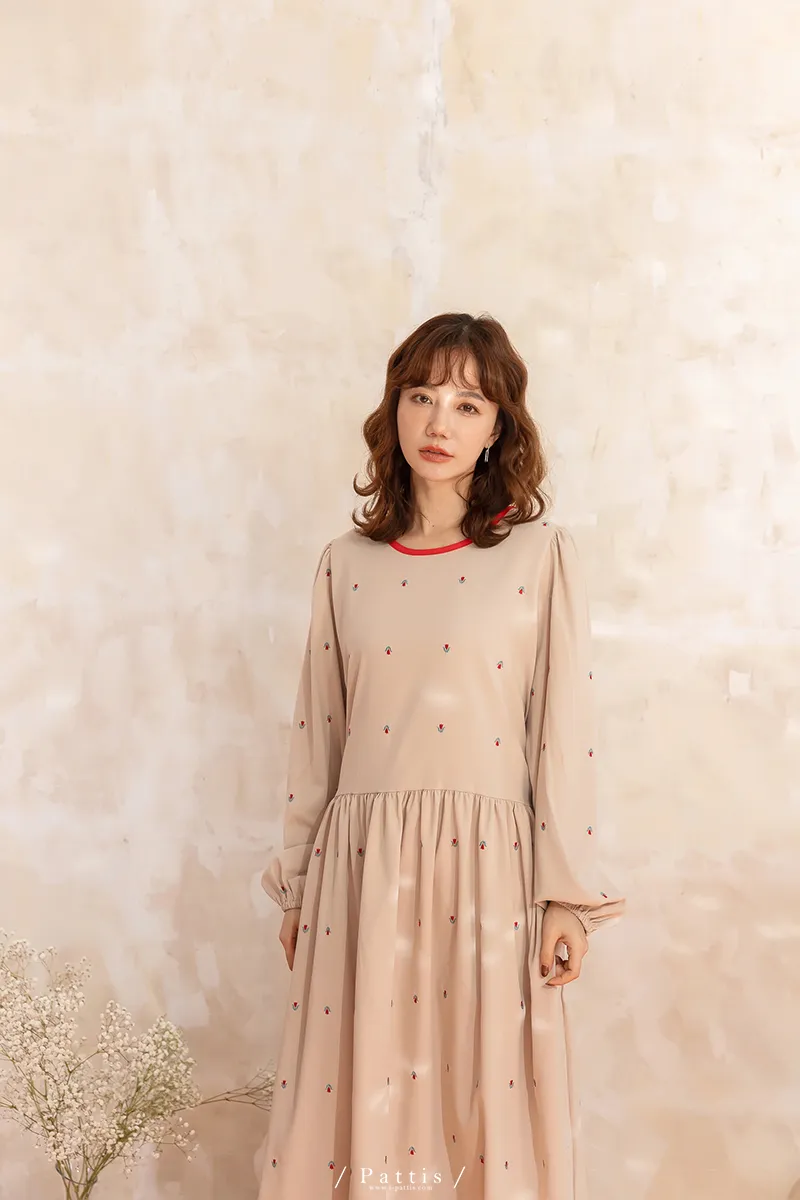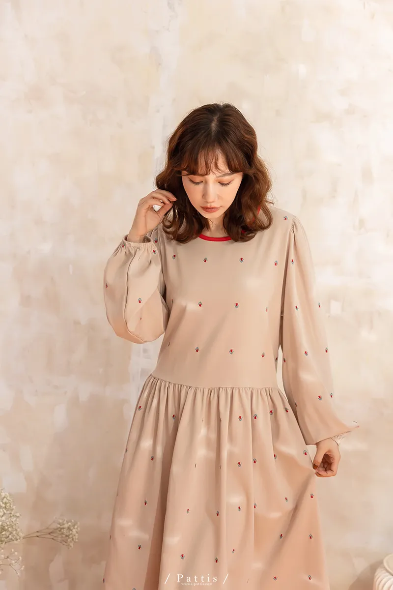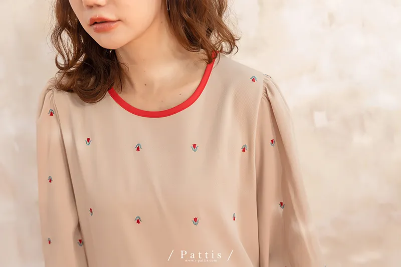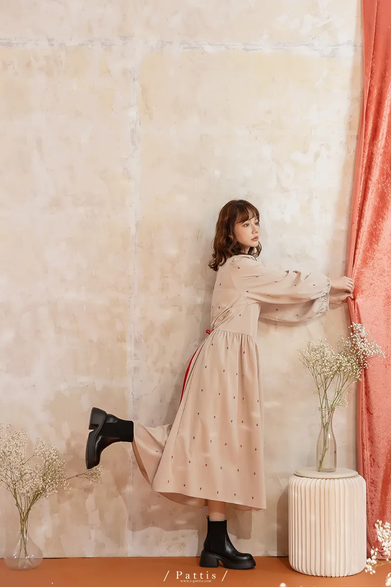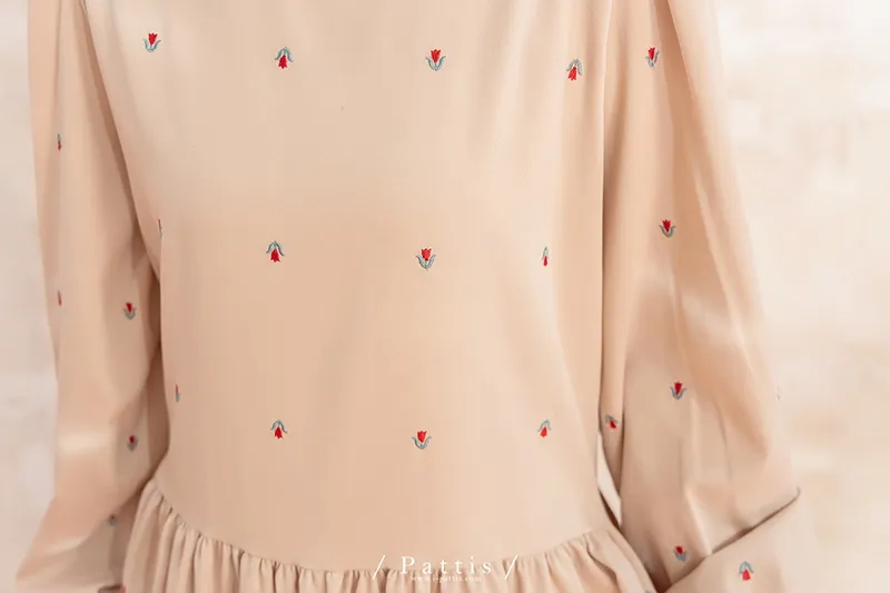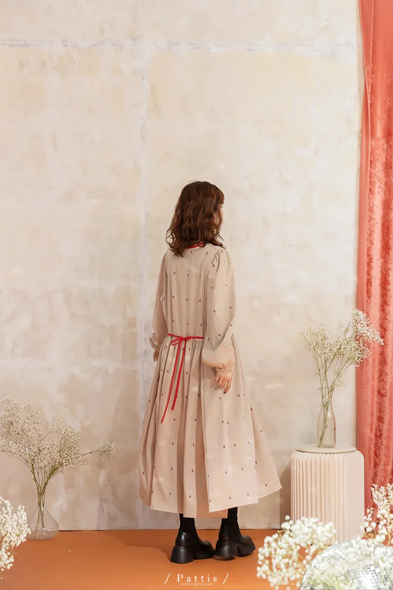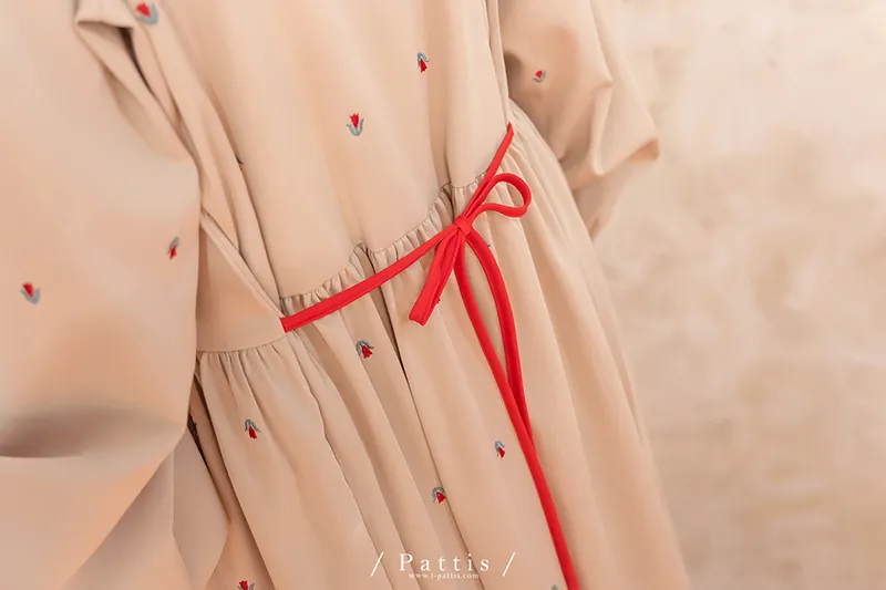 隱藏花語 | 鬱金香刺繡滾邊雙色綁帶洋裝(卡其杏)