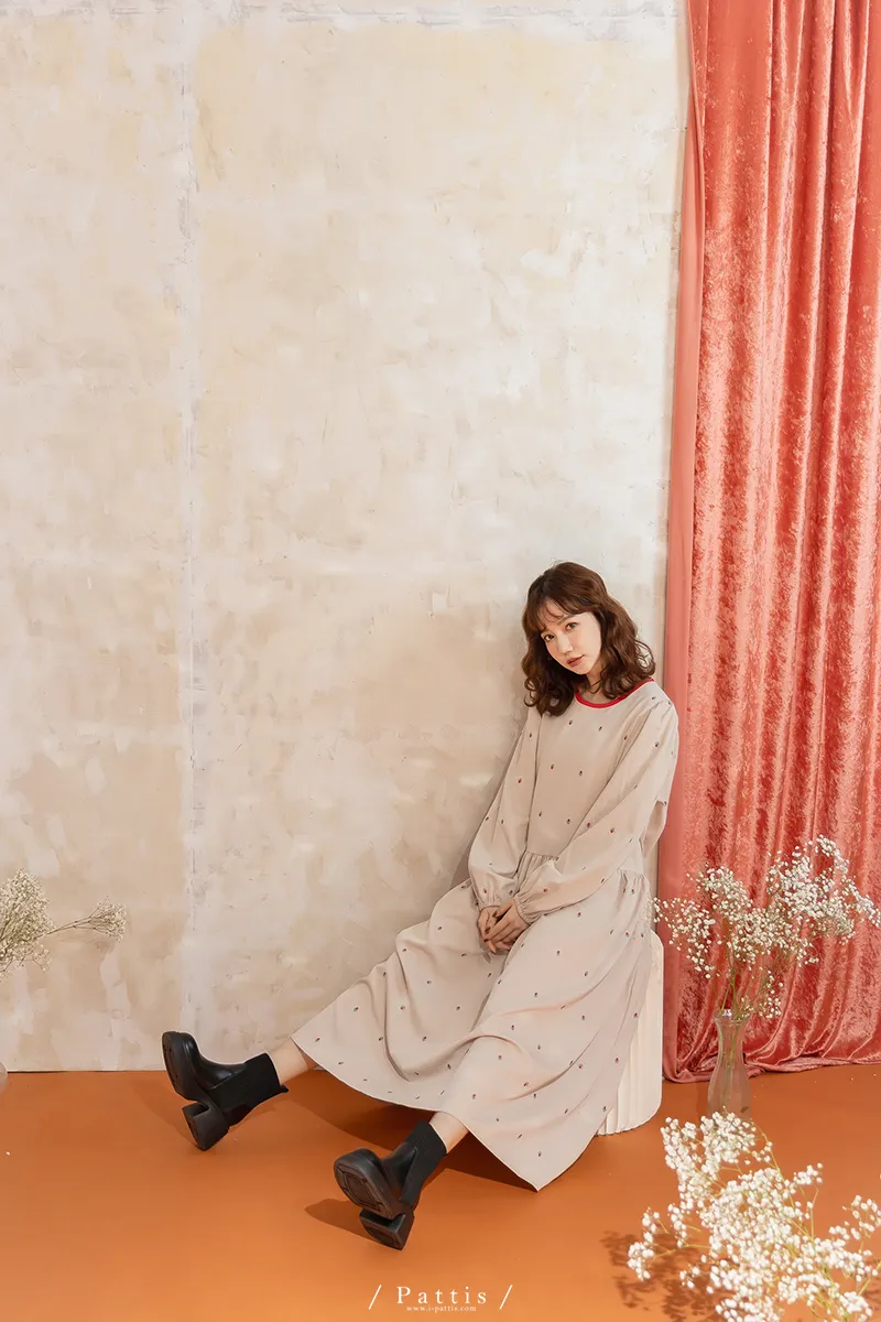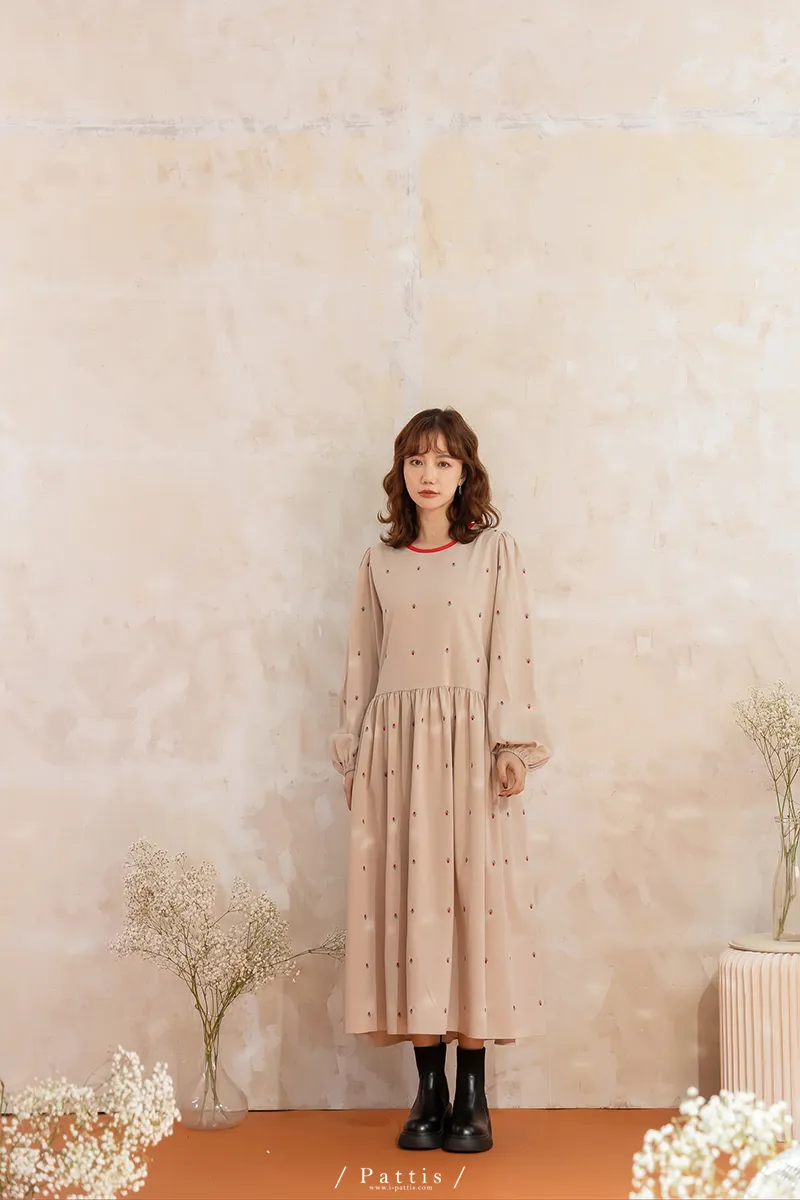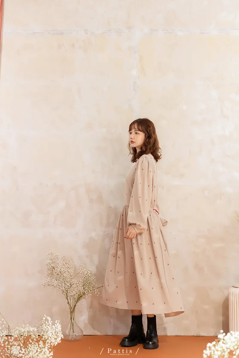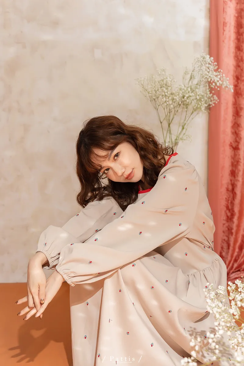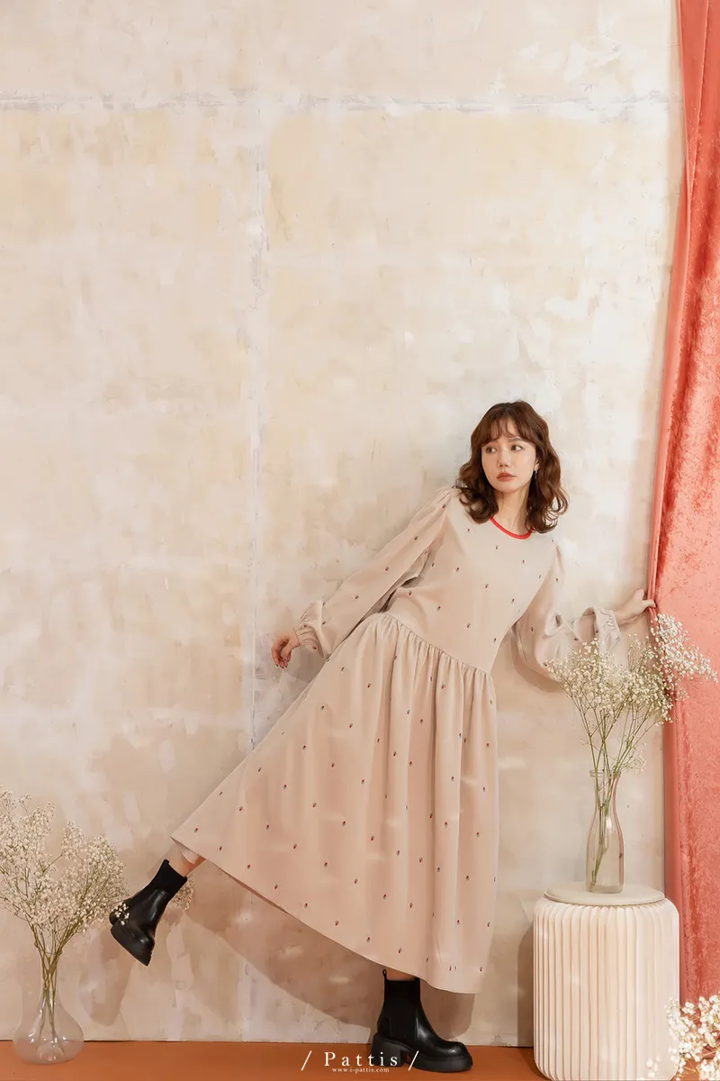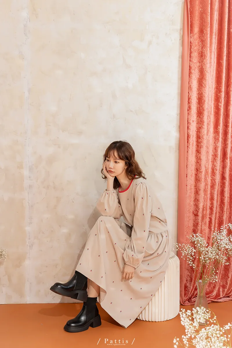 隱藏花語 | 鬱金香刺繡滾邊雙色綁帶洋裝(卡其杏)