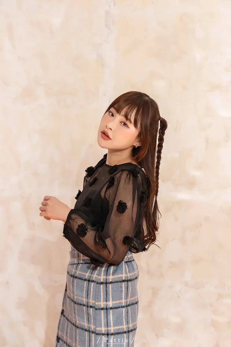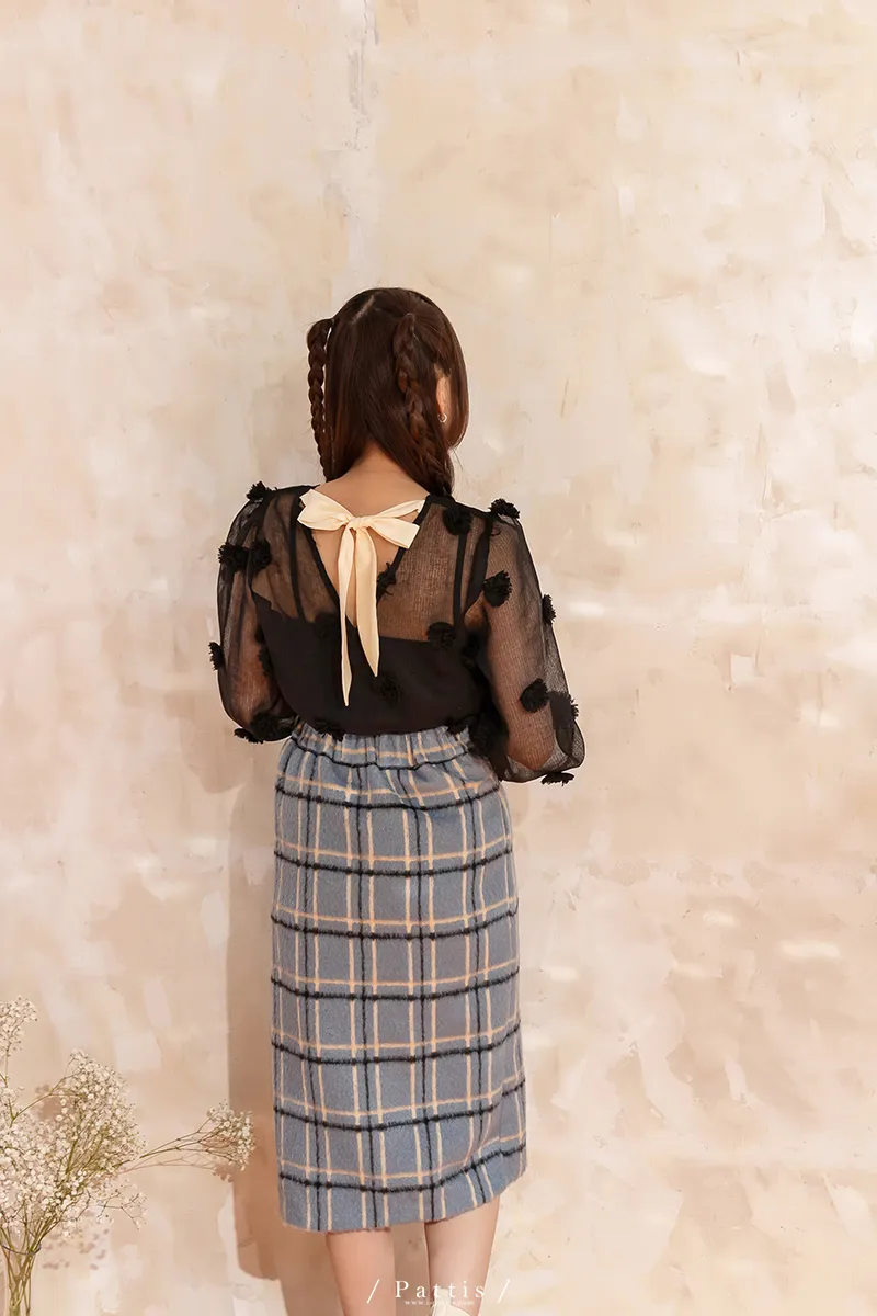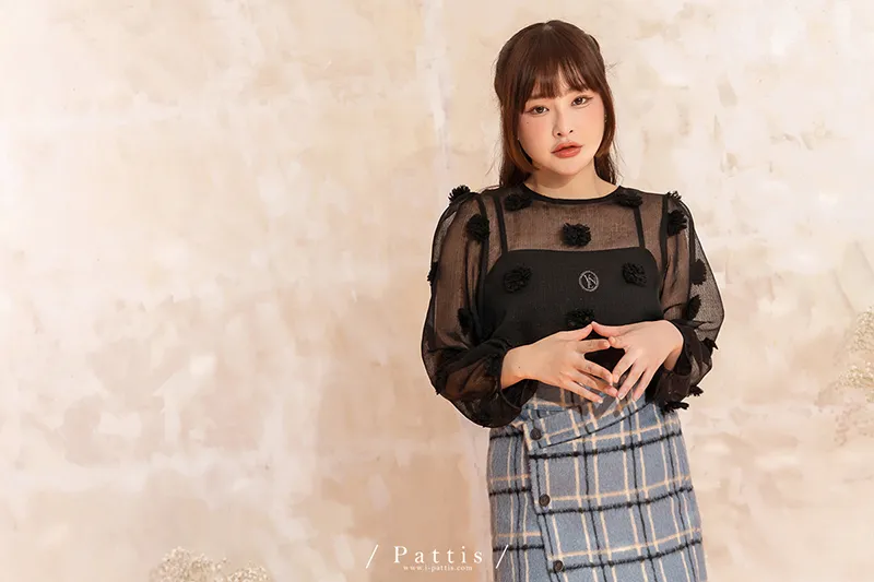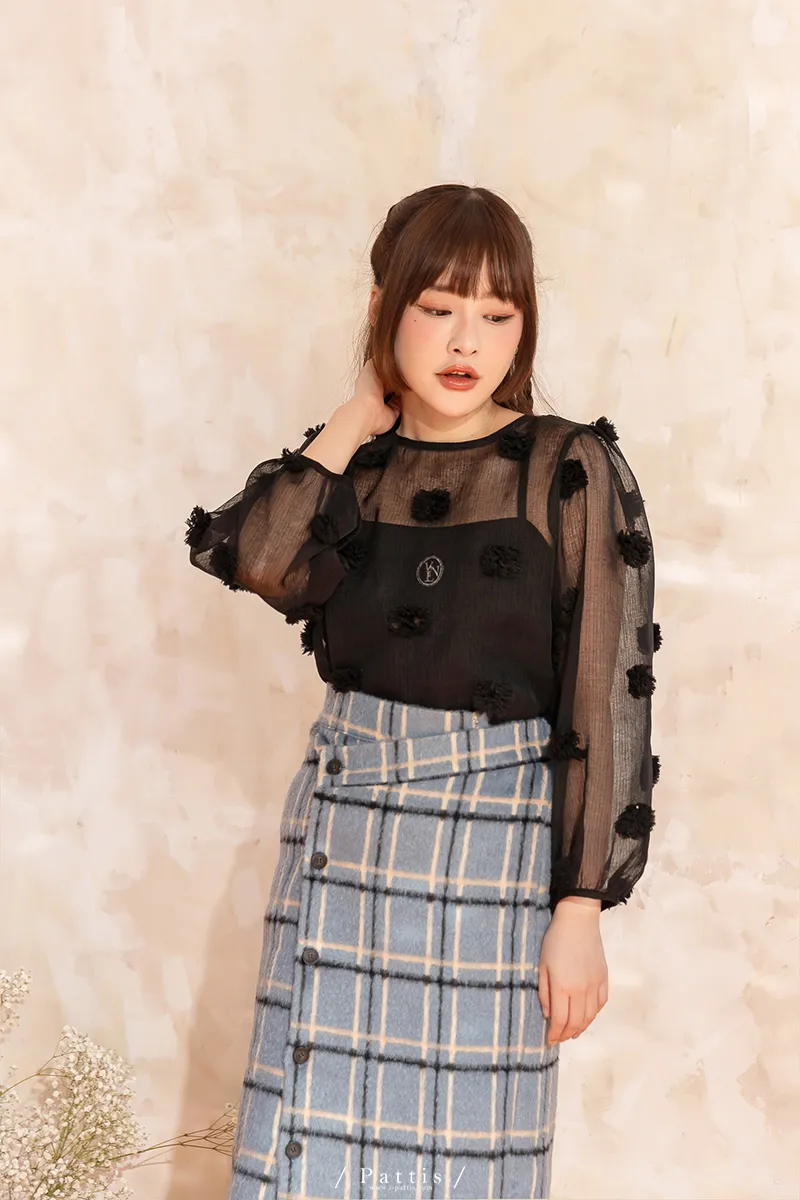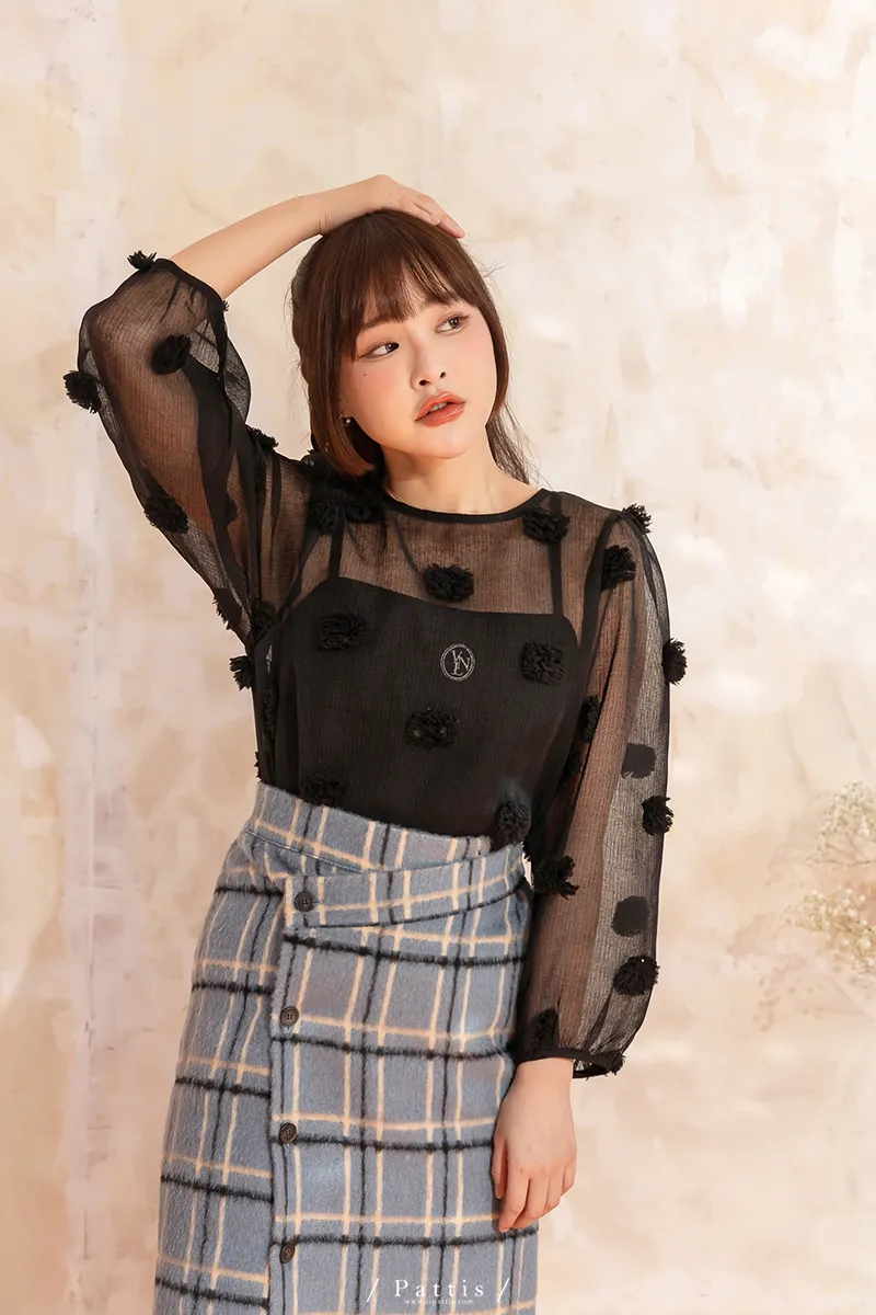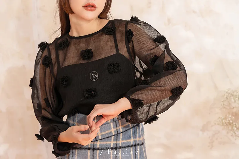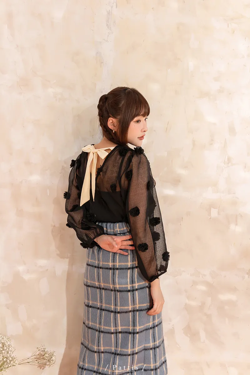 人造繡球花 | 小花團後綁帶透膚蓬袖上衣(黑)