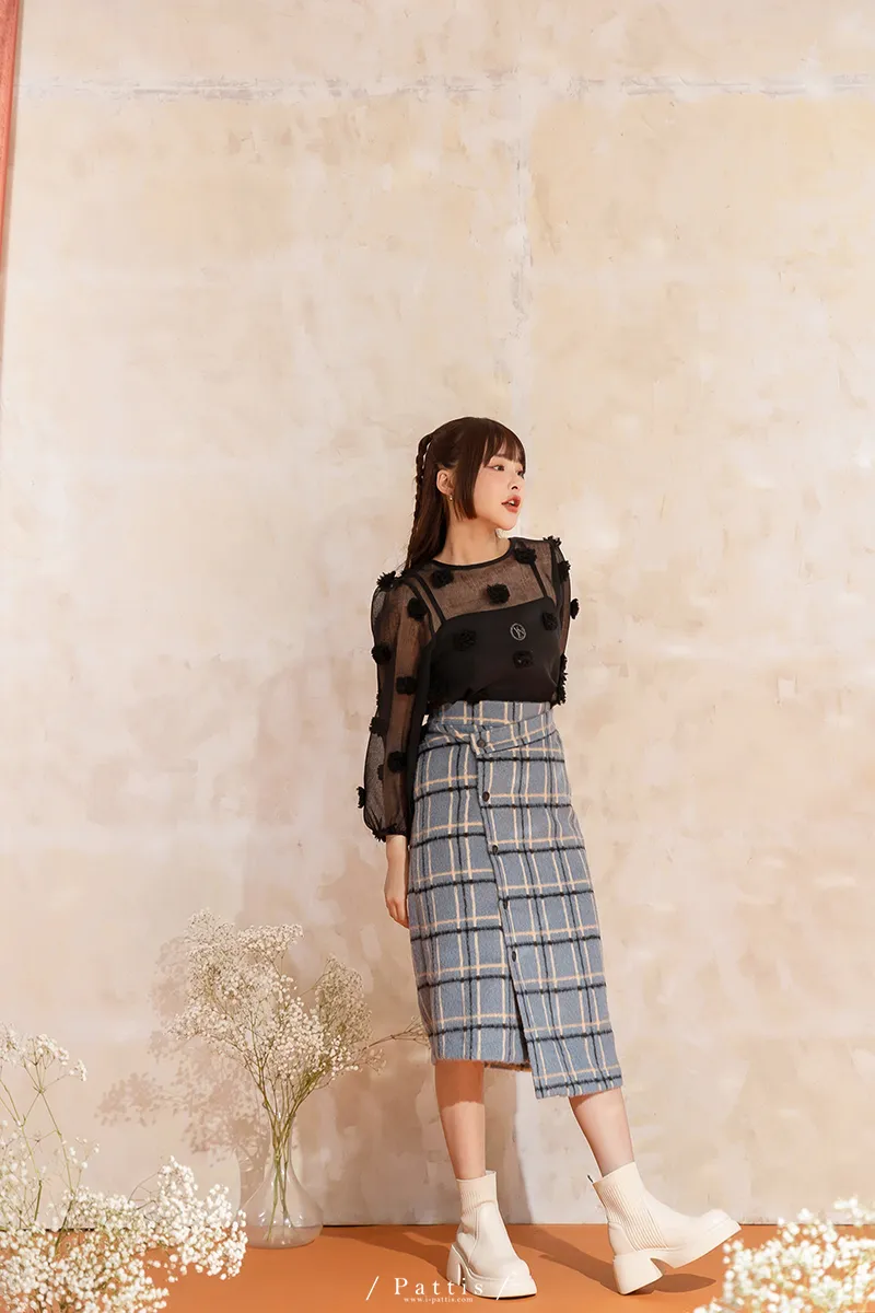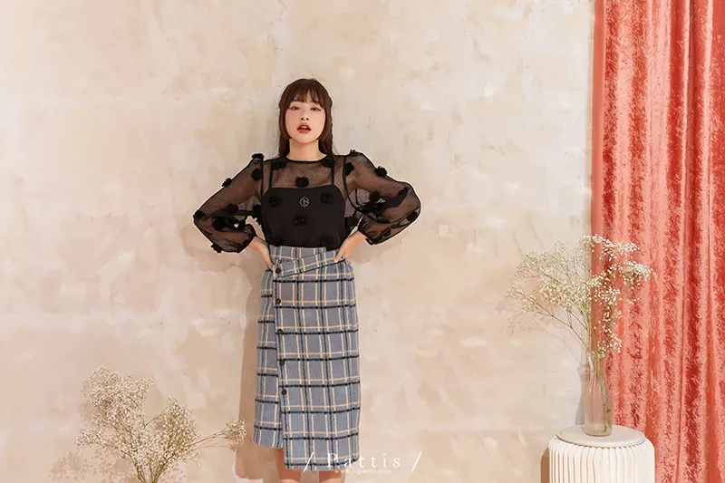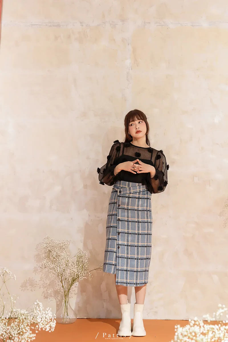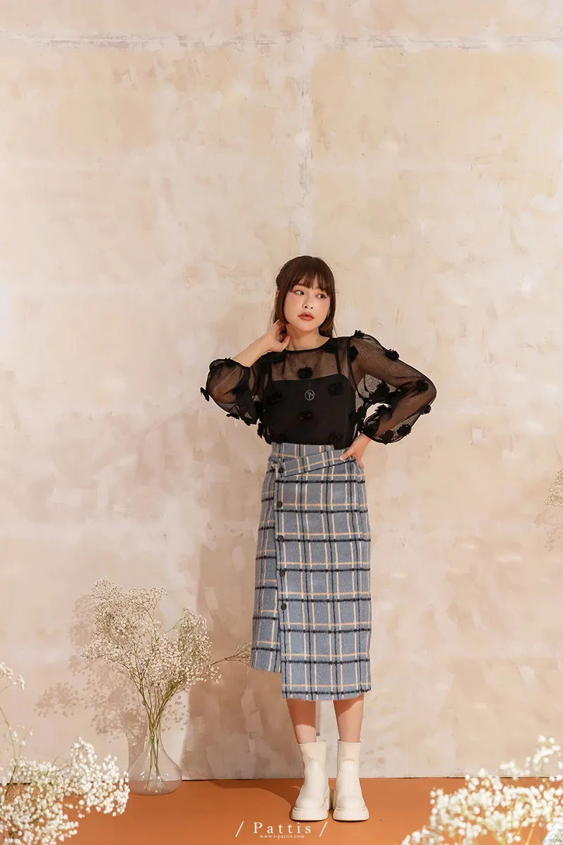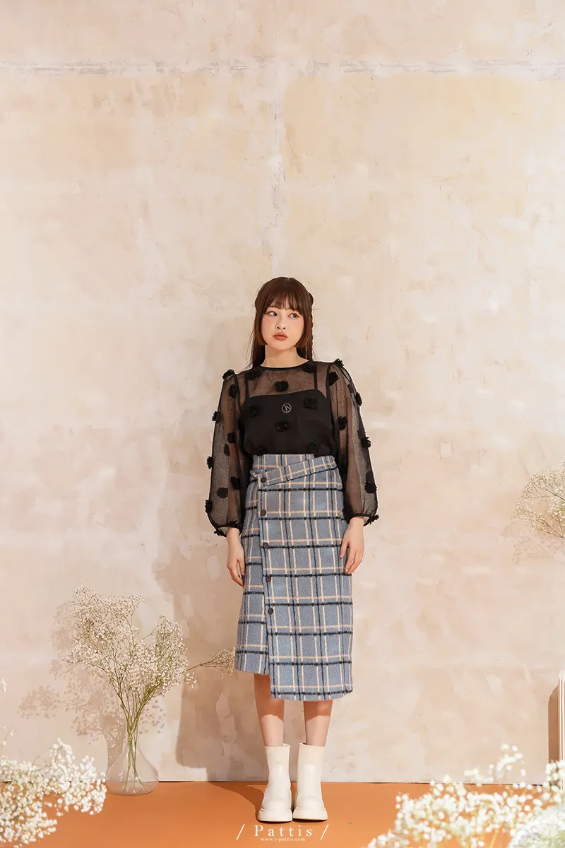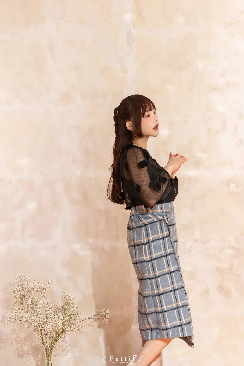 人造繡球花 | 小花團後綁帶透膚蓬袖上衣(黑)