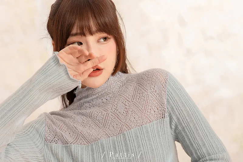 *特*菱格透膚蕾絲拼接磨毛條紋上衣(藍綠)
