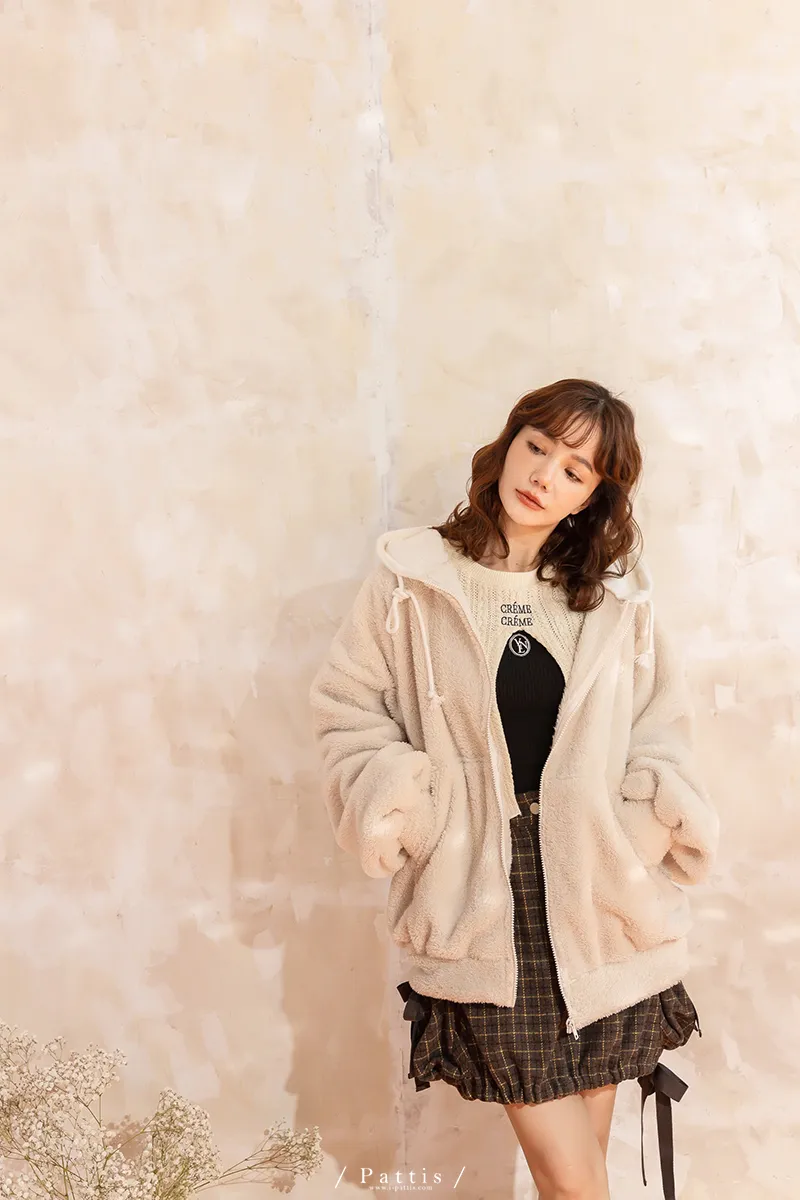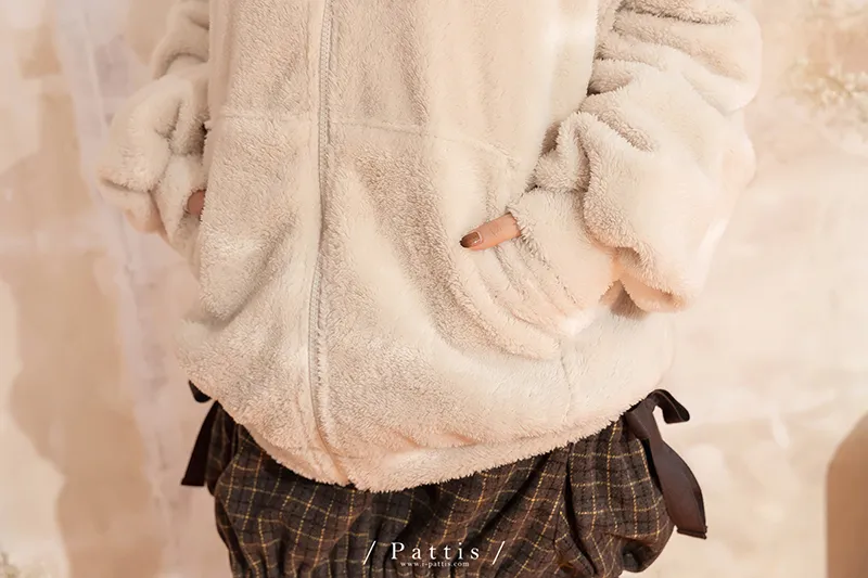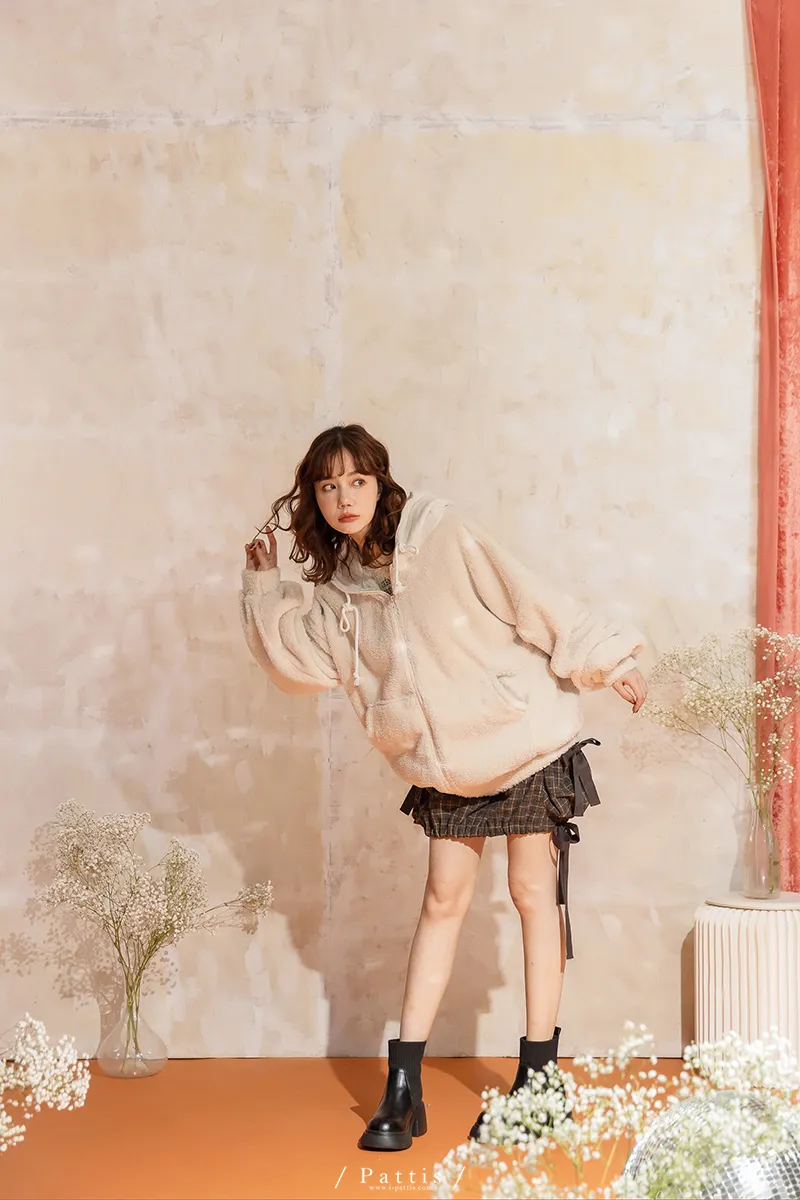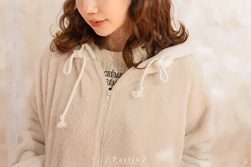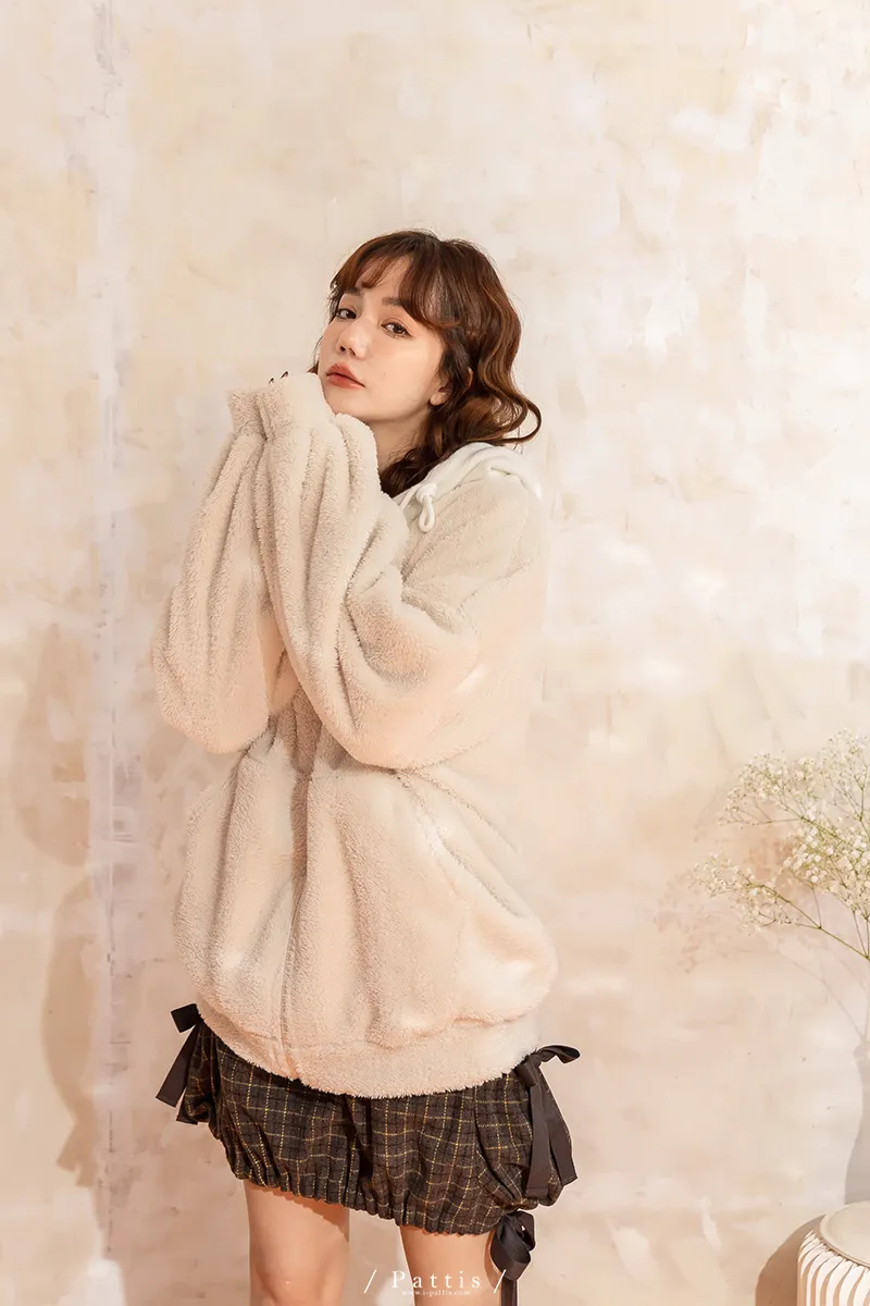 重返幼時的木造房 | 泰迪熊軟毛雙色連帽口袋長版外套(米杏)