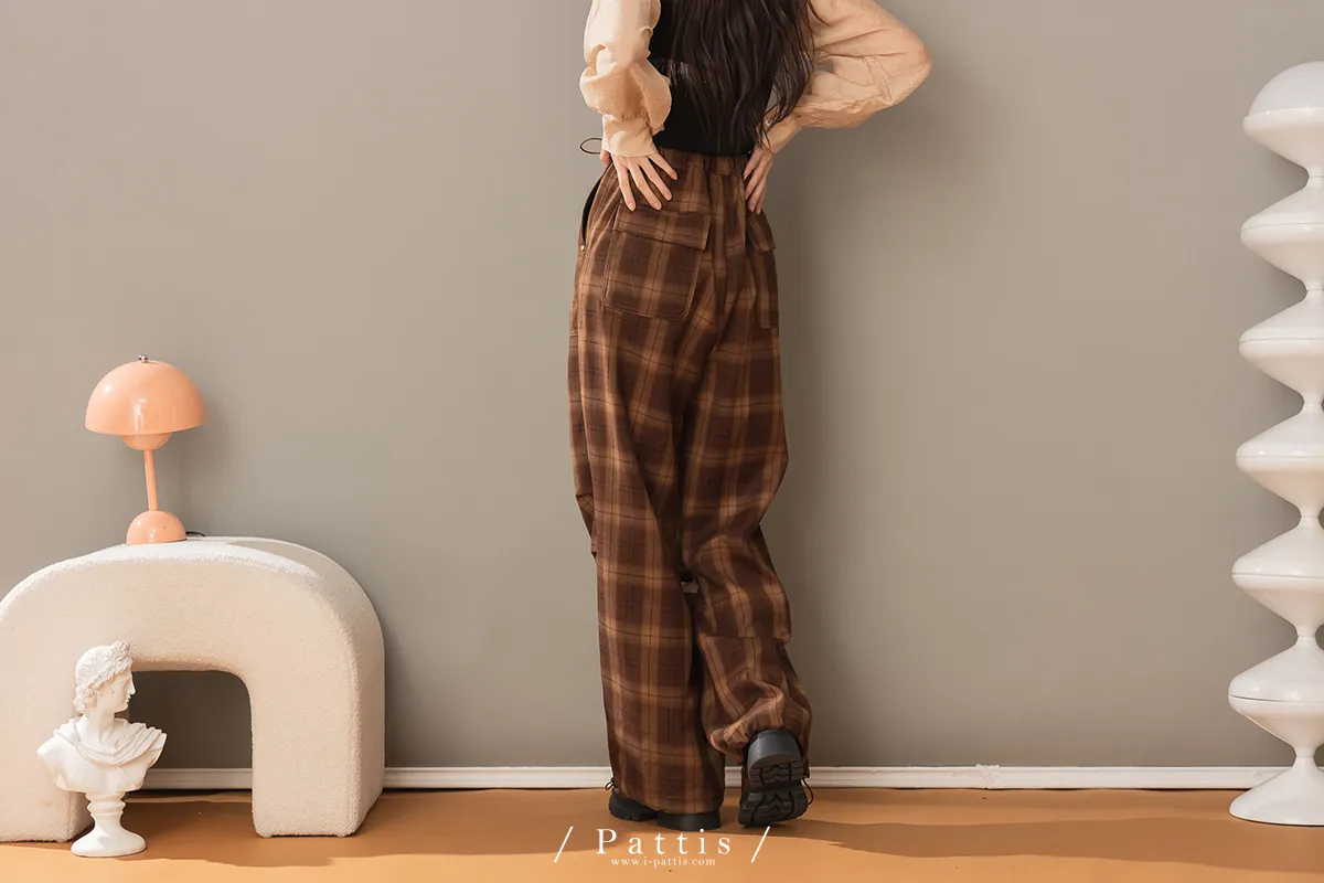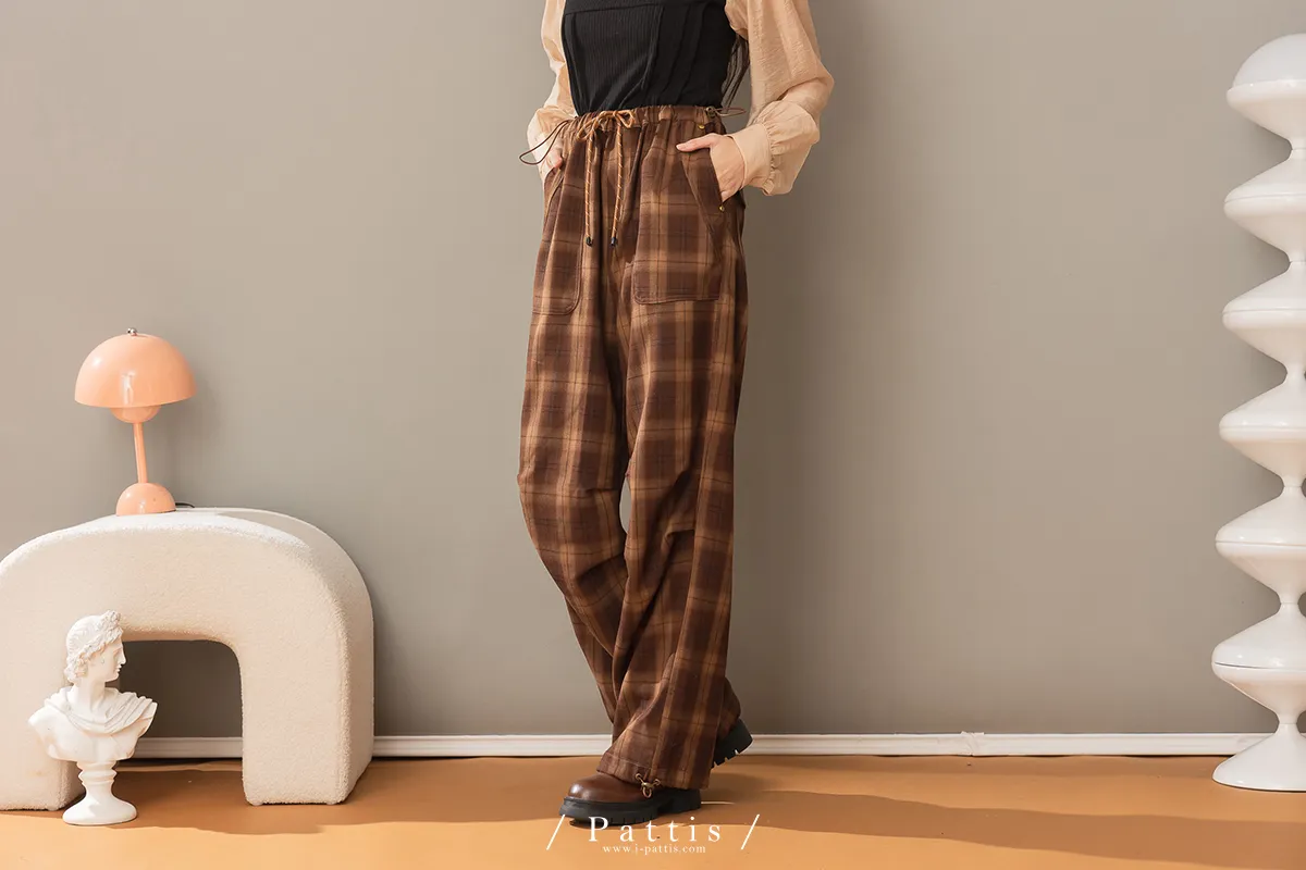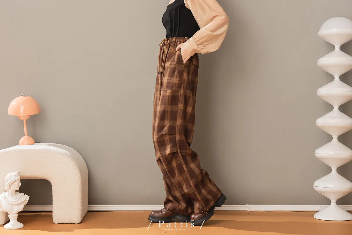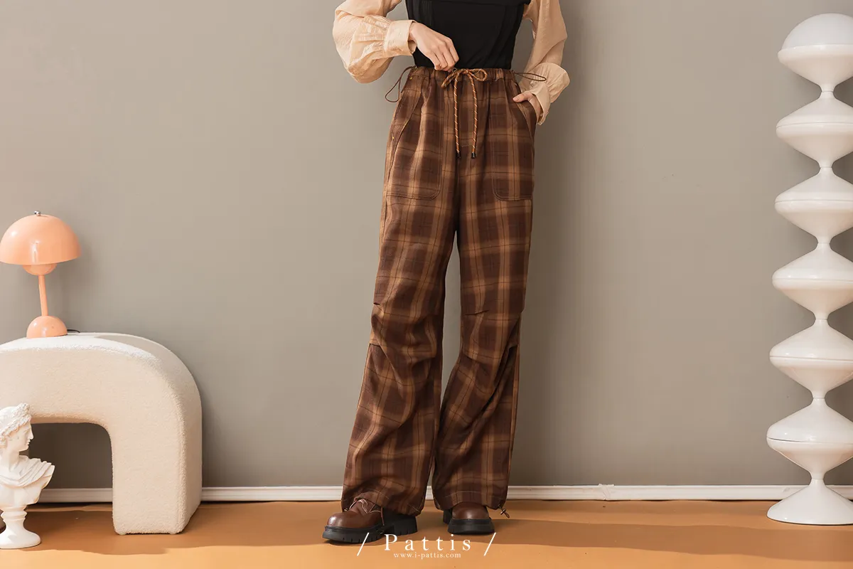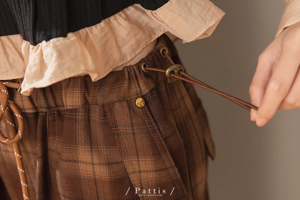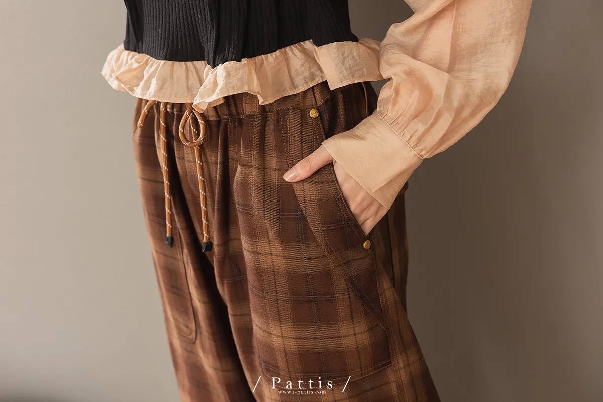 (現貨) 舊時光手札 | 復古格紋繫帶縮口寬褲(咖)