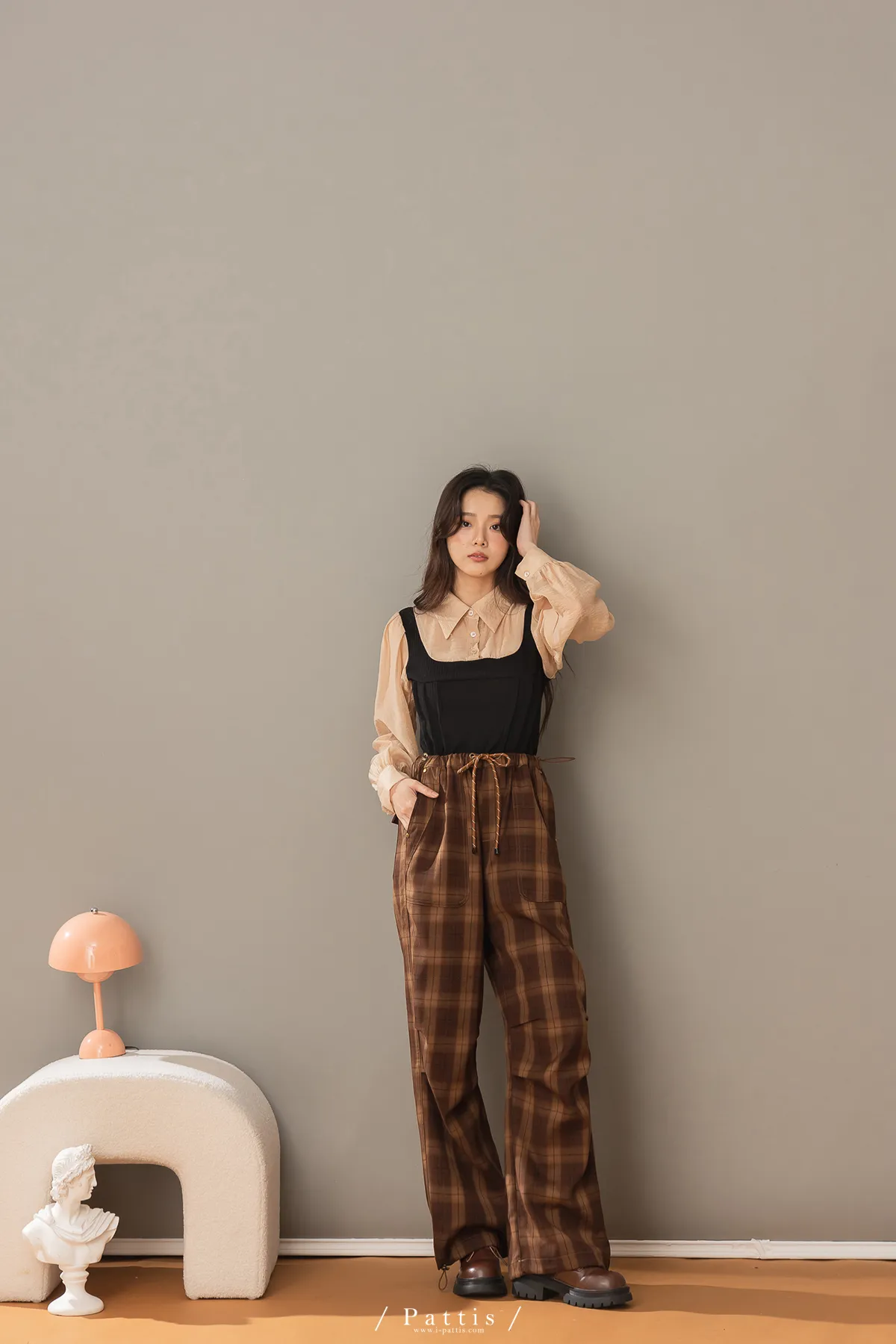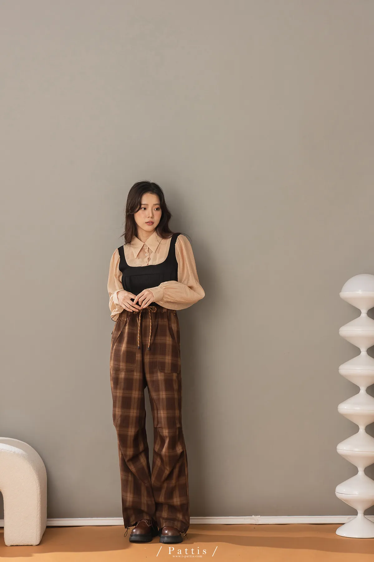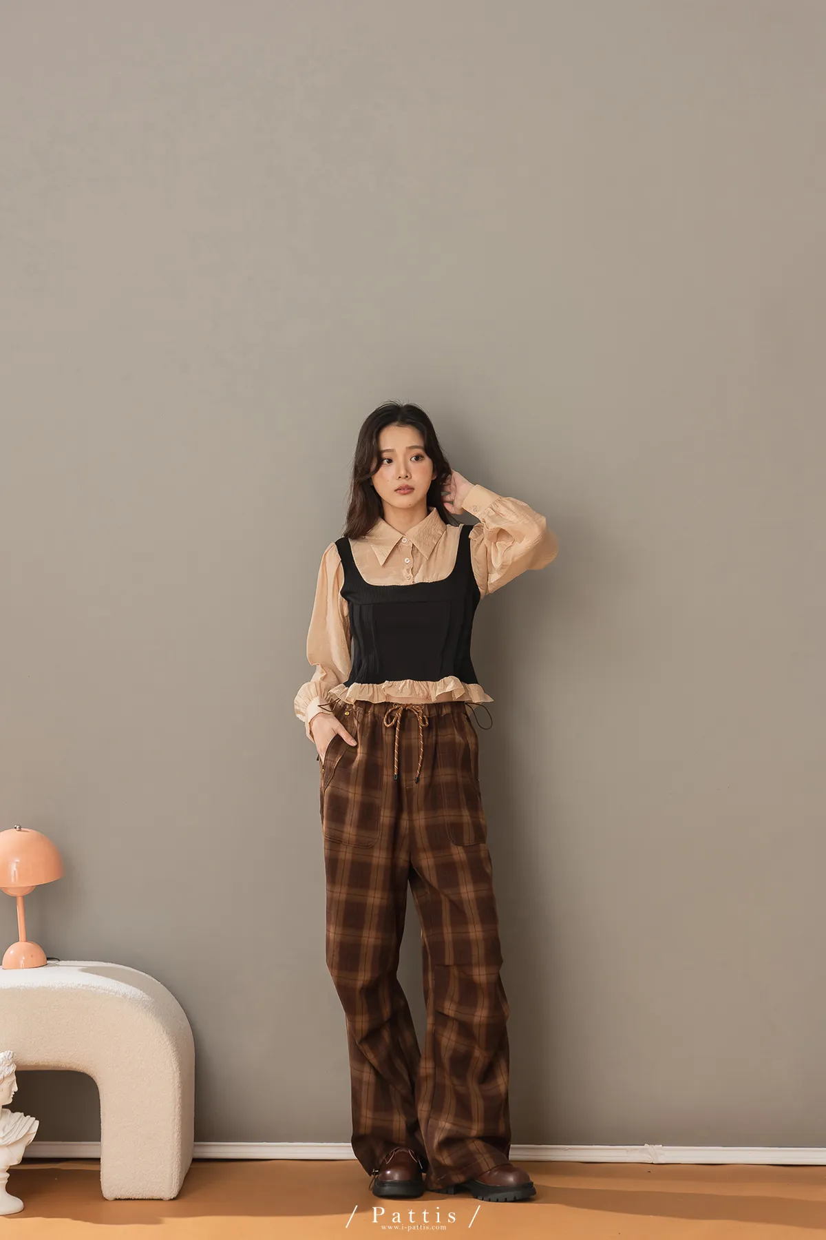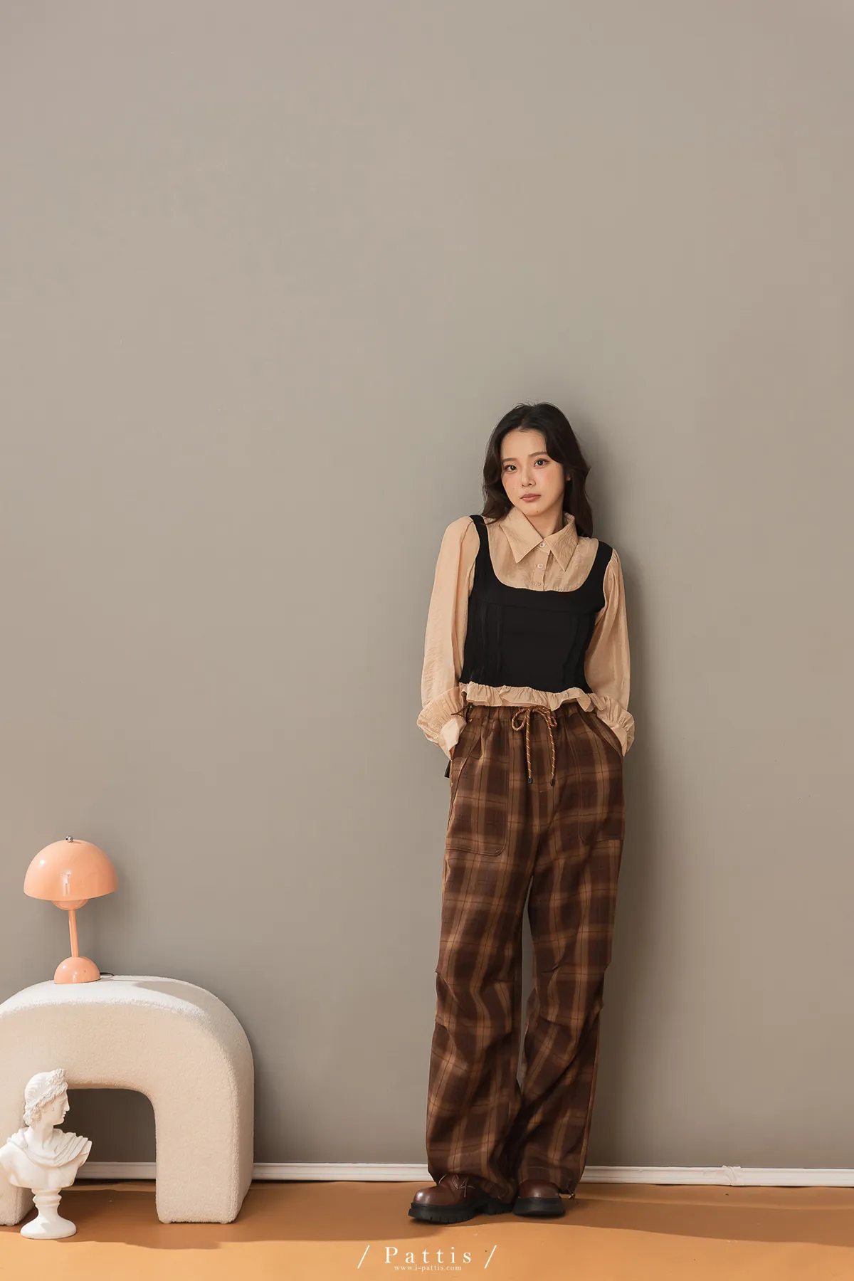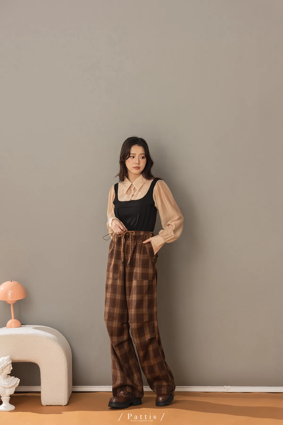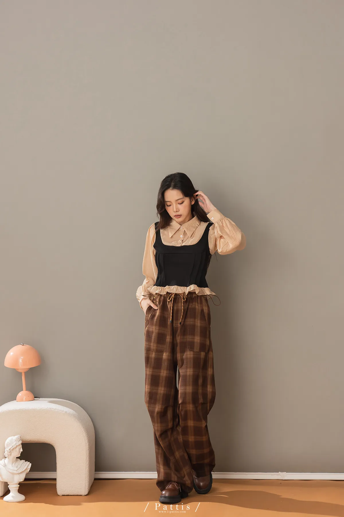 (現貨) 舊時光手札 | 復古格紋繫帶縮口寬褲(咖)