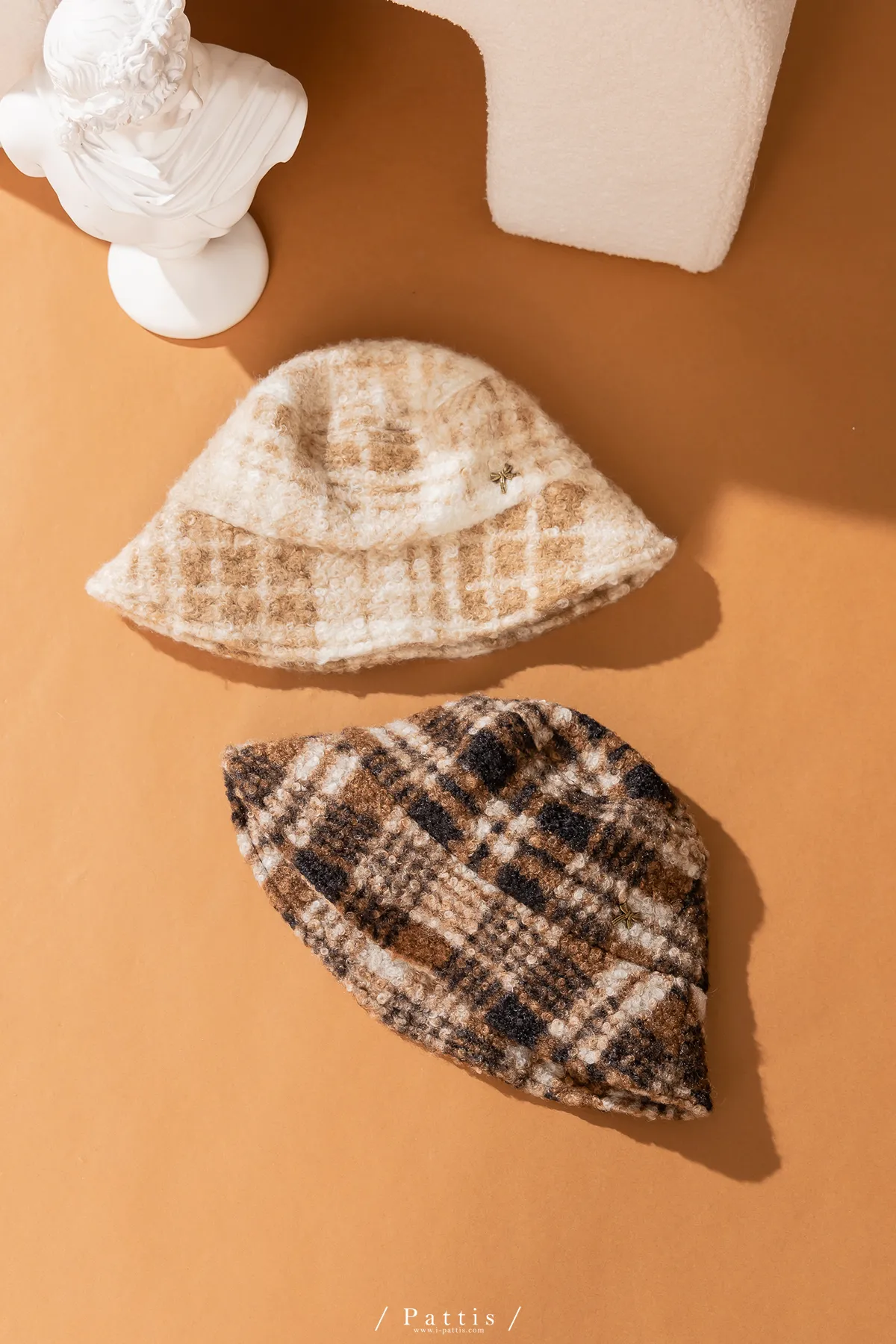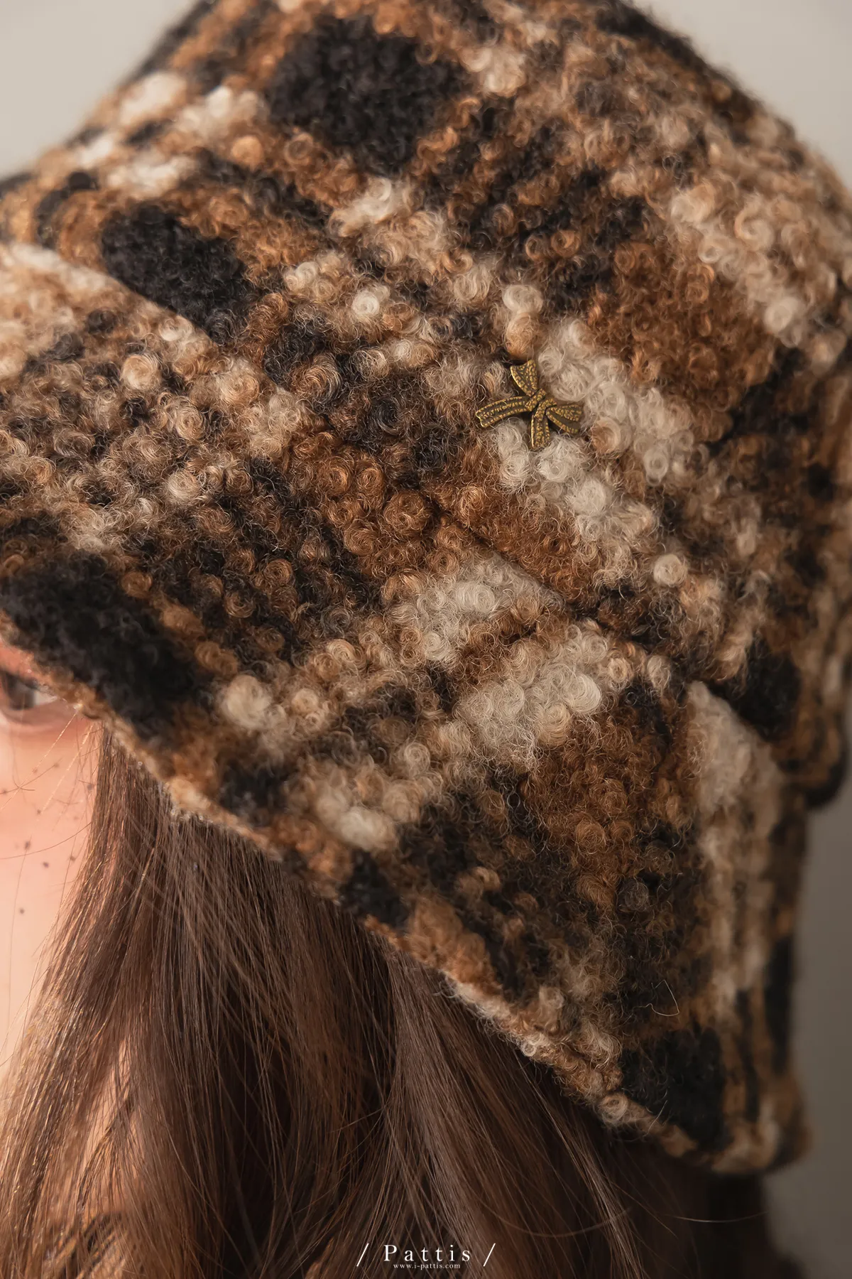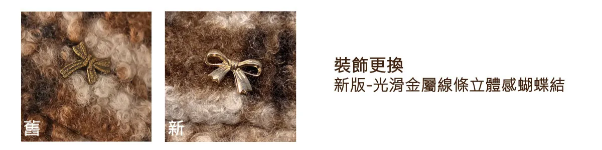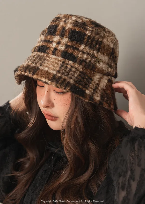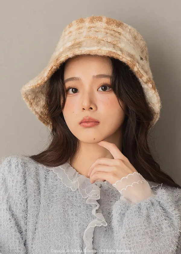 圈圈毛呢格紋綴小金蝴蝶結帽(米白/咖黑)