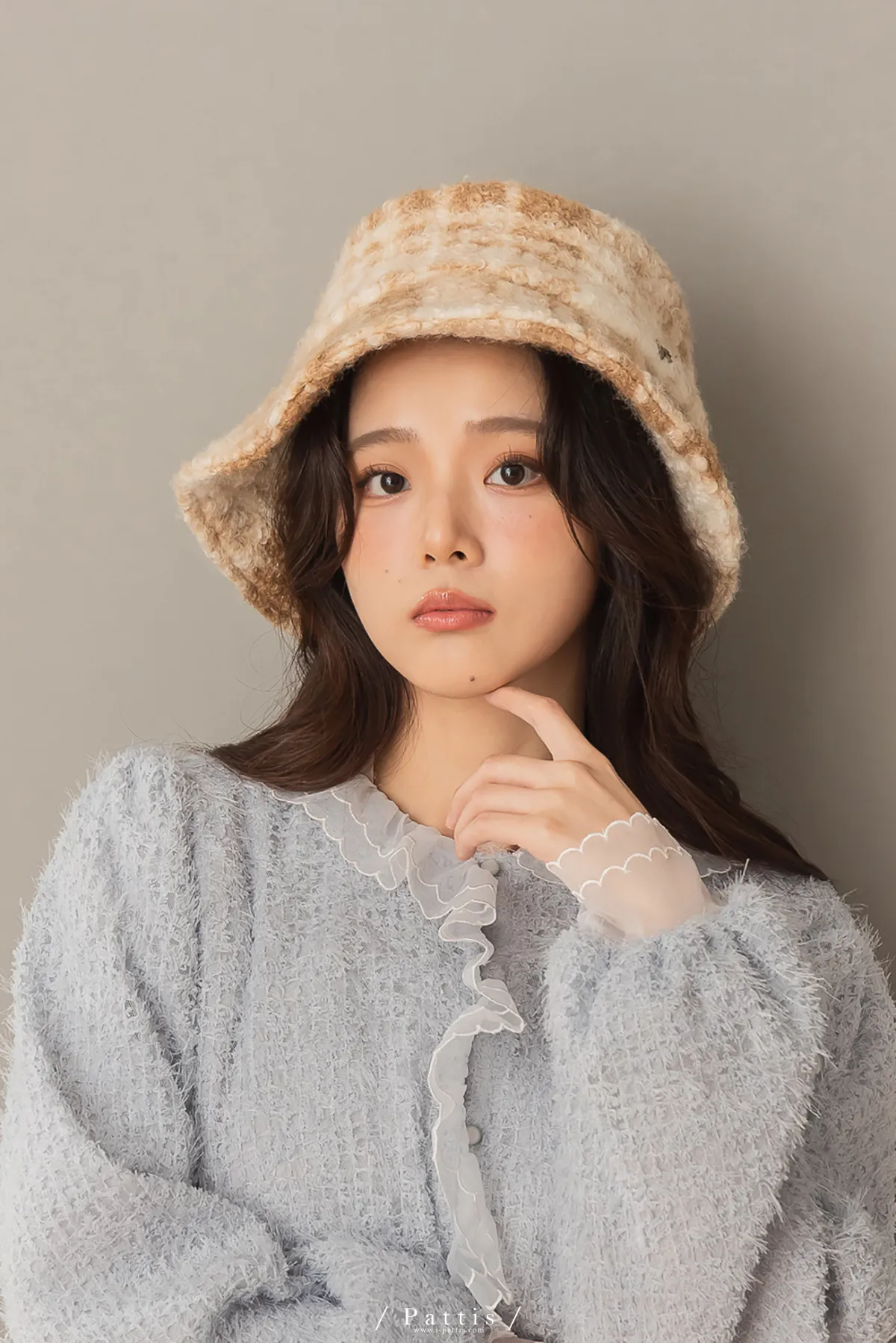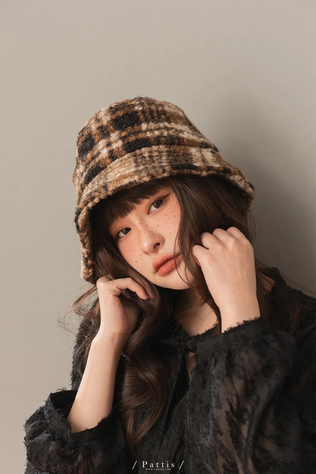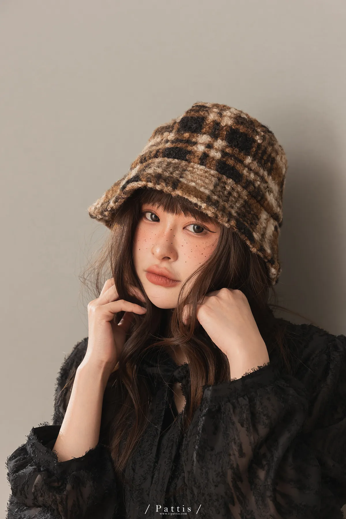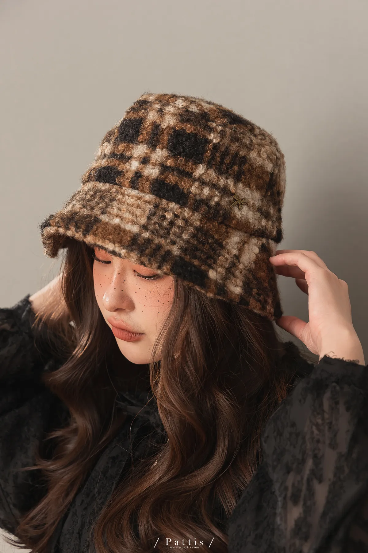 圈圈毛呢格紋綴小金蝴蝶結帽(米白/咖黑)