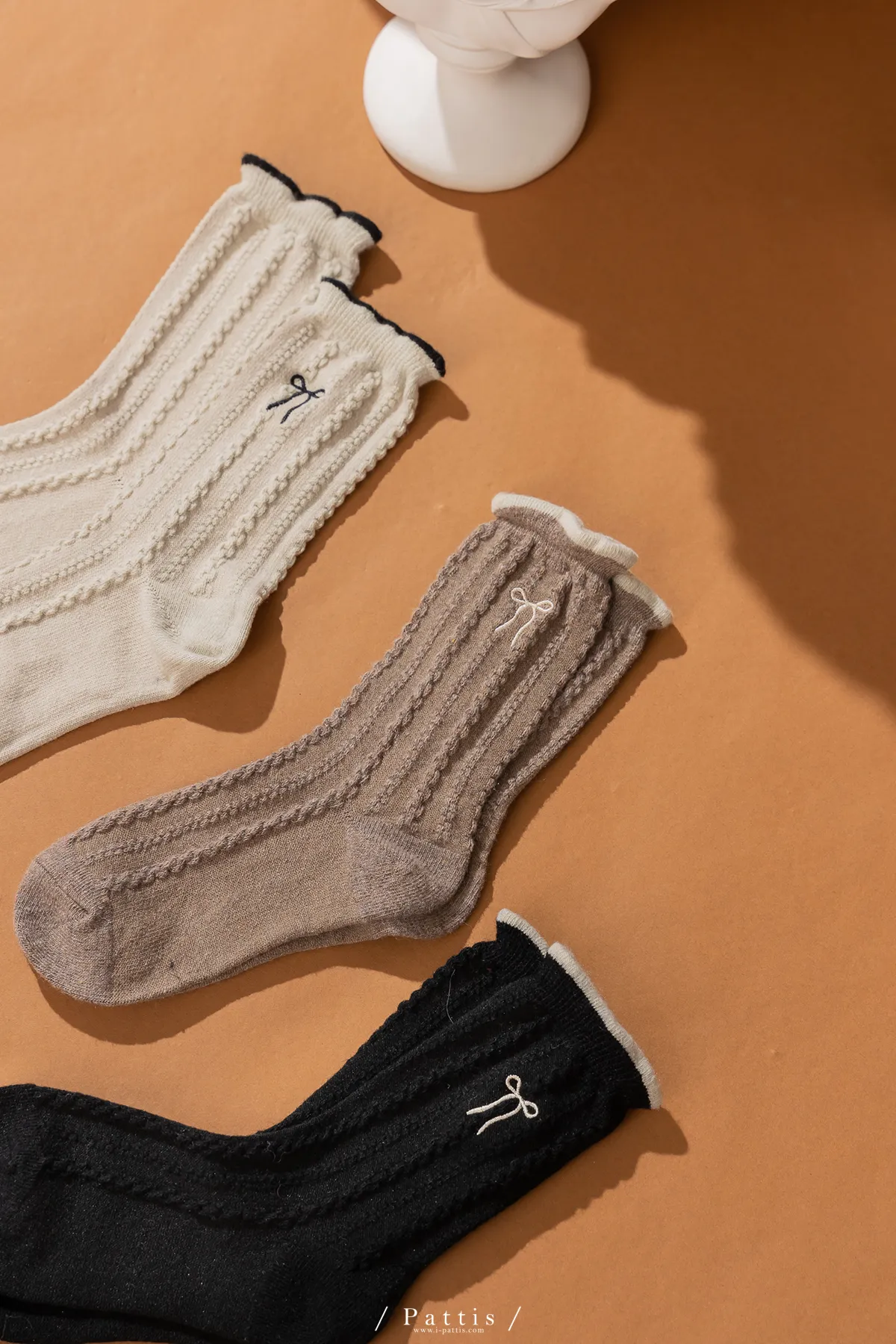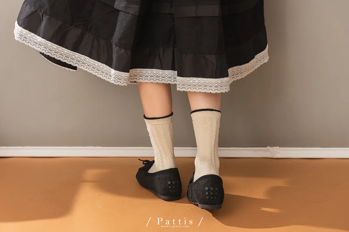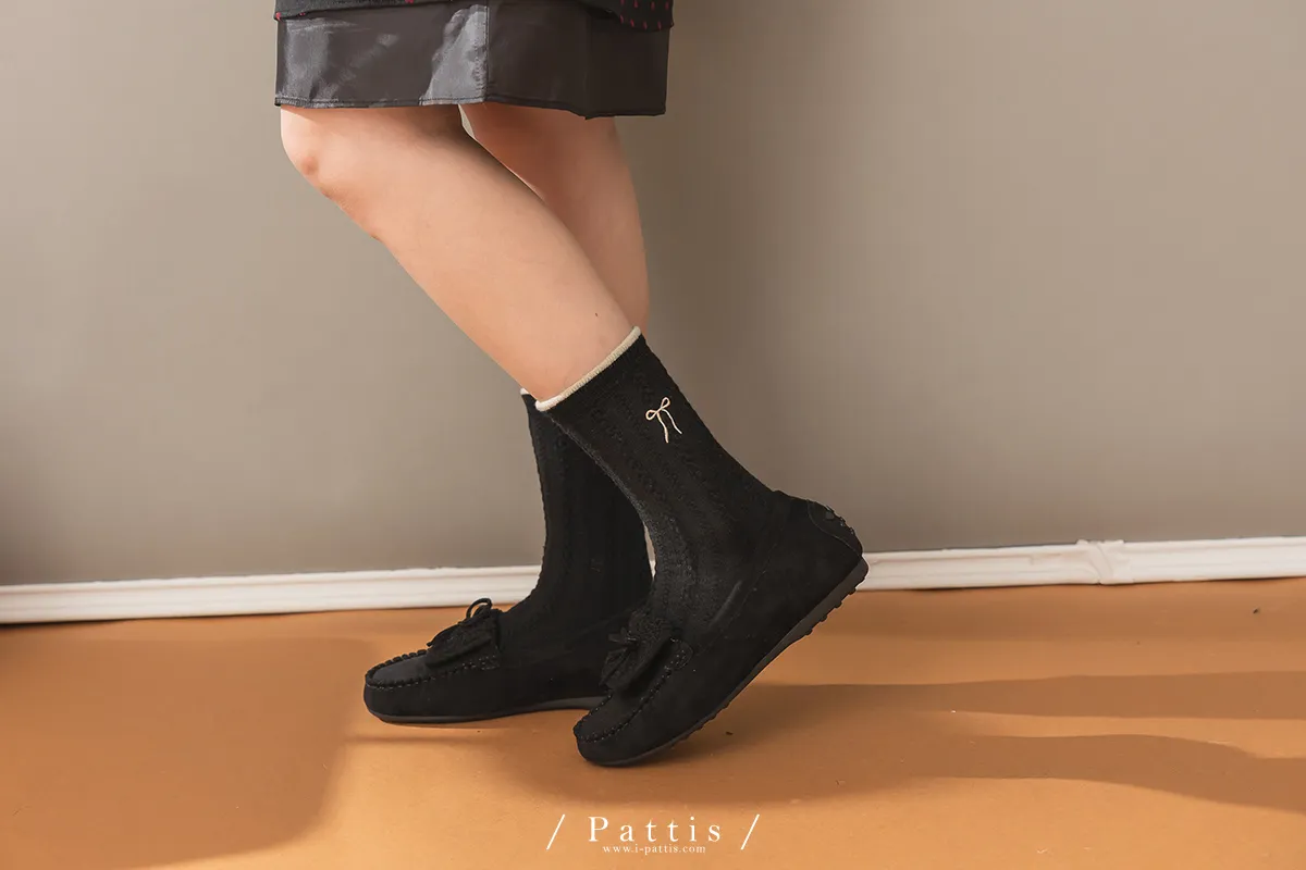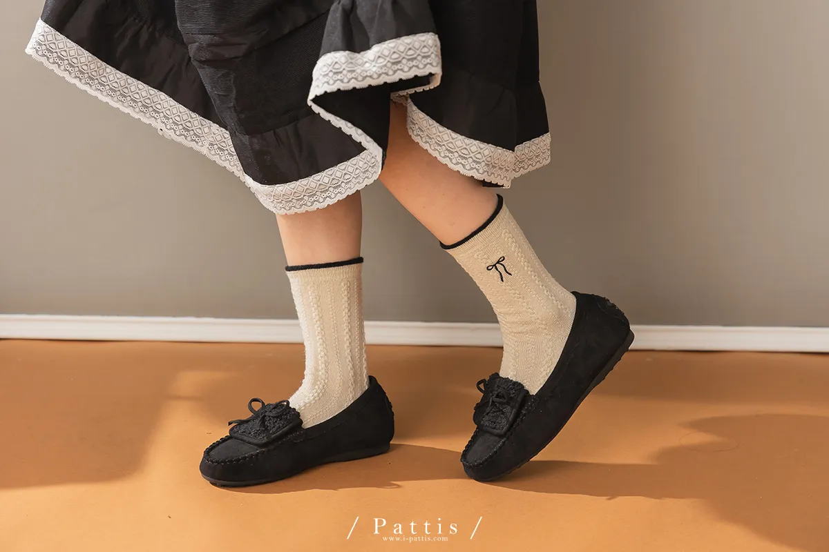 (現貨) 雙色蝴蝶結刺繡麻花羊毛襪(米杏/摩卡棕/黑)