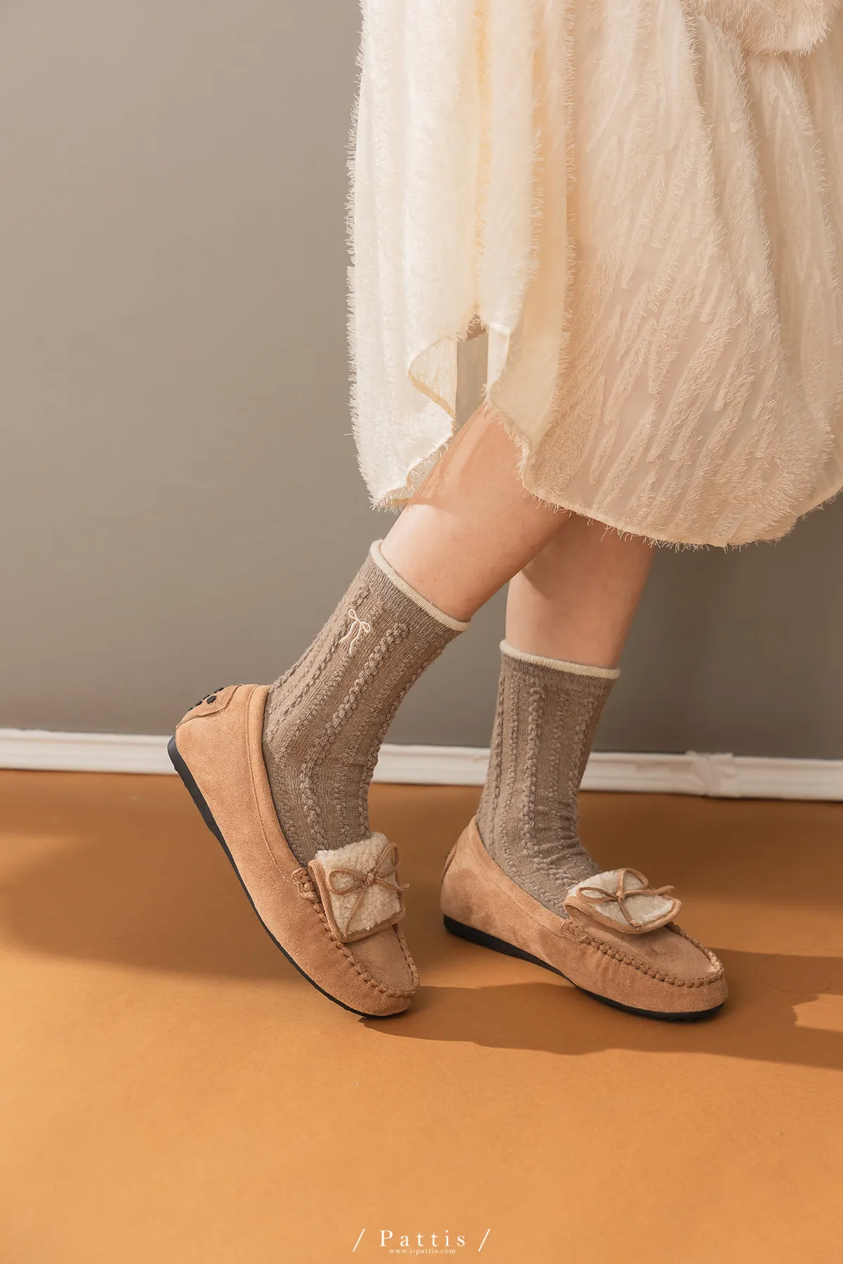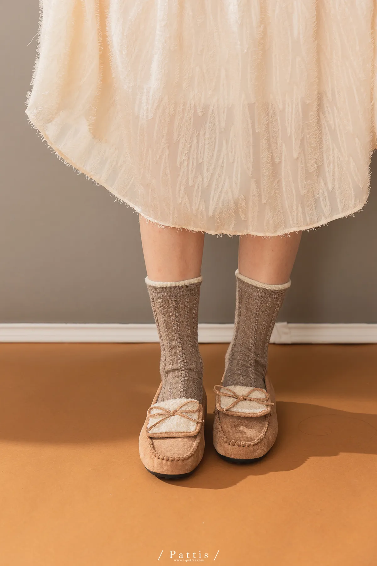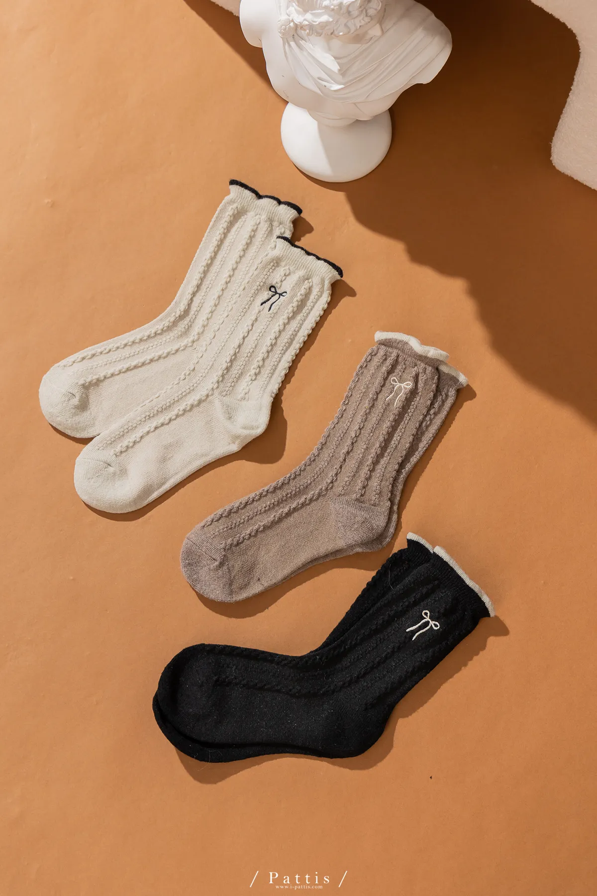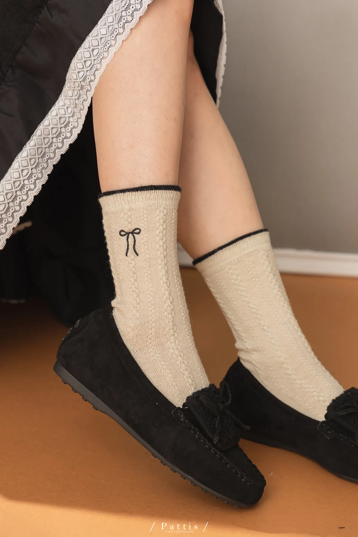 (現貨) 雙色蝴蝶結刺繡麻花羊毛襪(米杏/摩卡棕/黑)