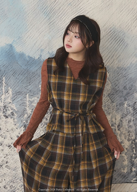復古約會教程 | V領綁帶格紋背心+寬褲set組(黃咖)