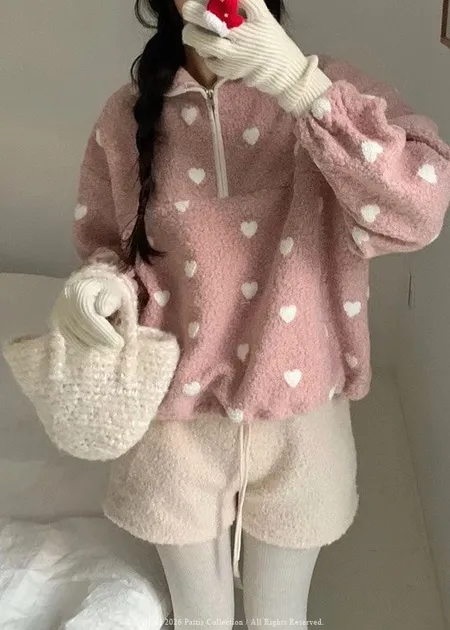 *特*愛心雙色毛毛拉鍊翻領上衣(粉)