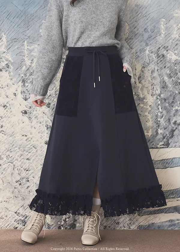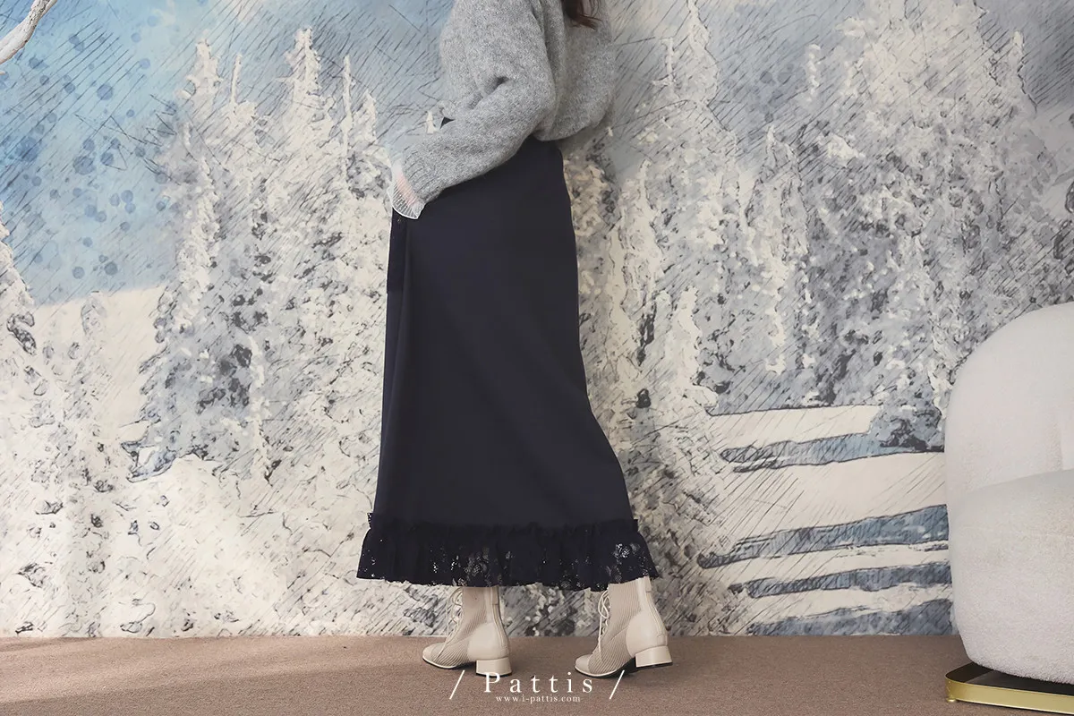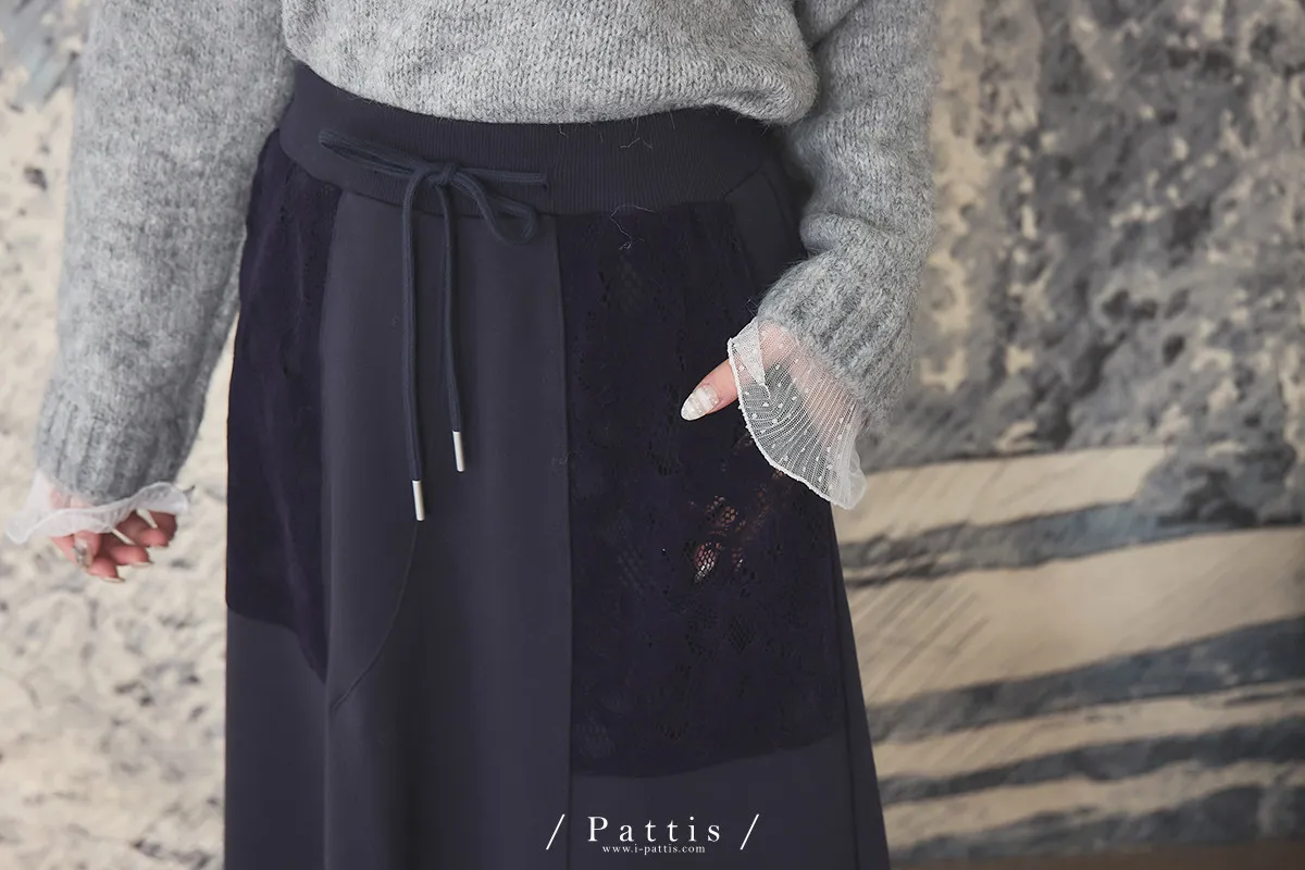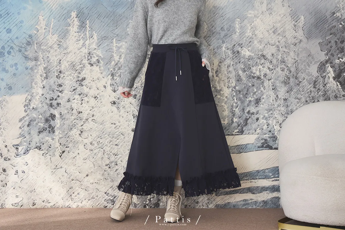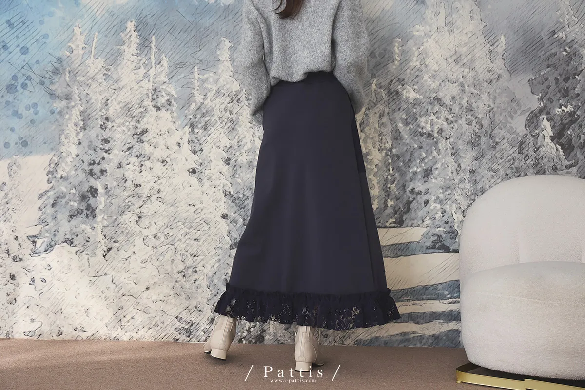細膩敘事文 | 拼接蕾絲口袋開長裙(深藍)