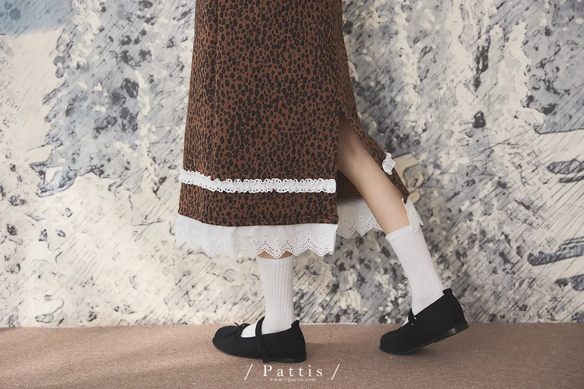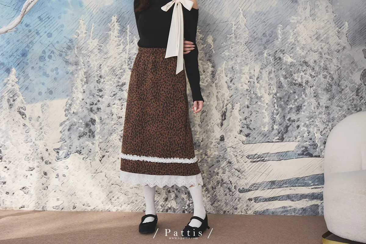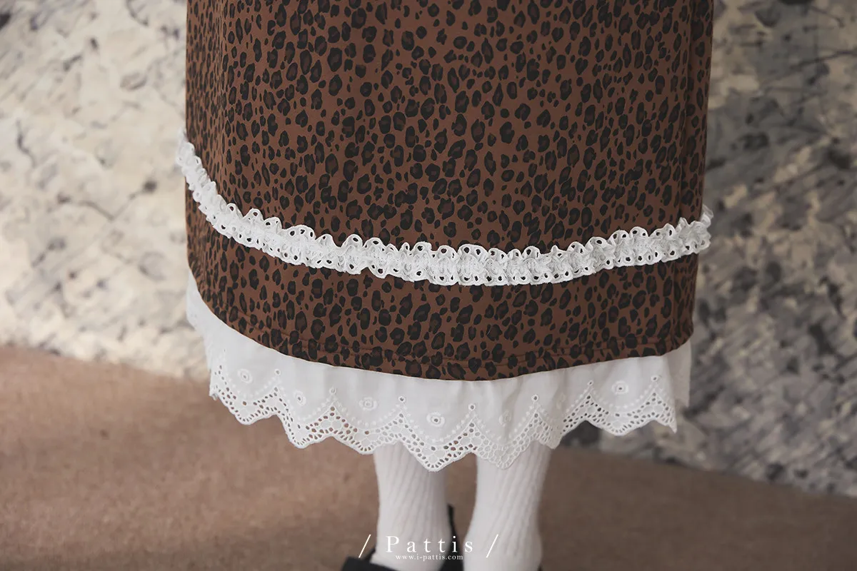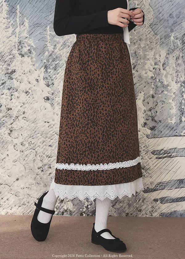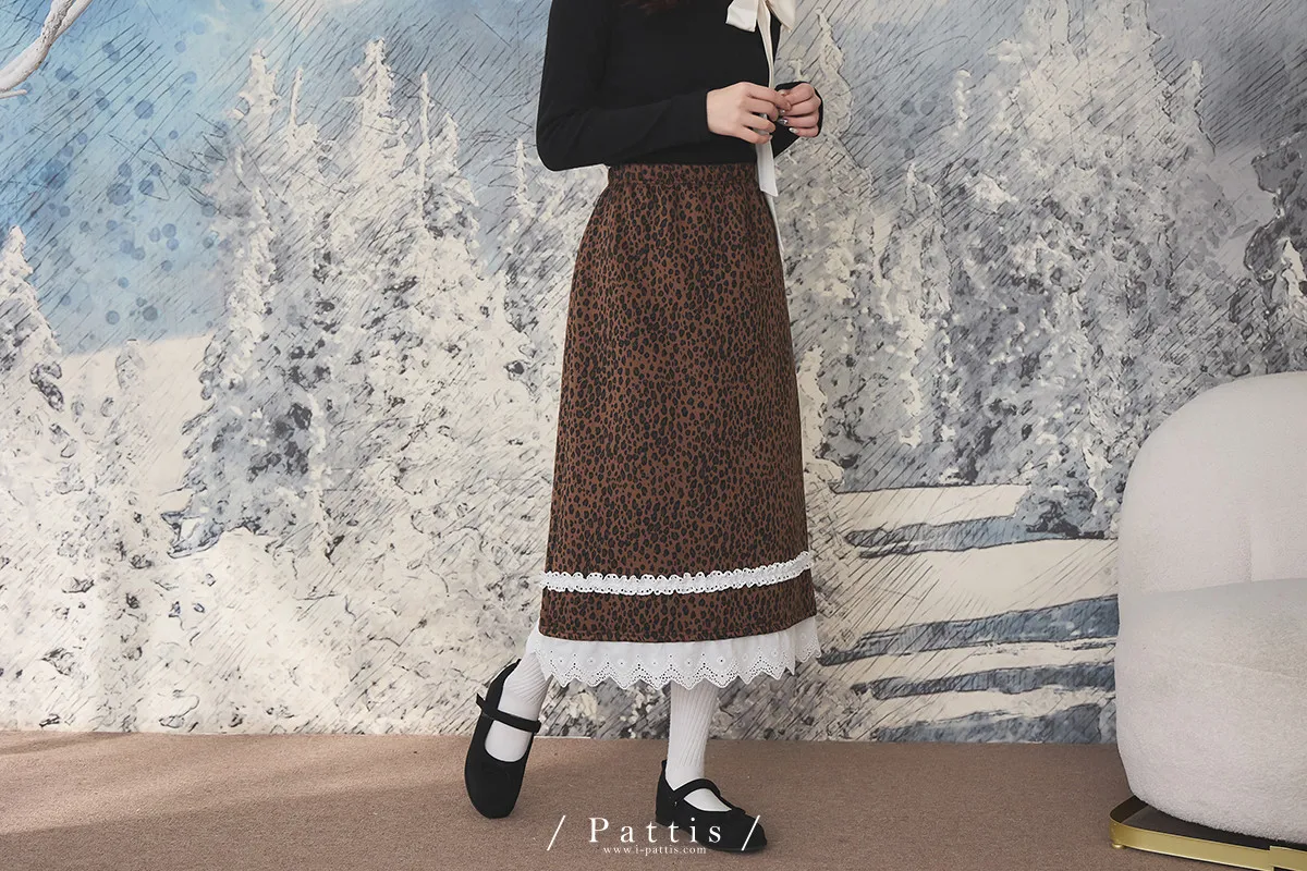 不被冬日約束的傲氣 | 內刷毛拼接布蕾絲豹紋長裙(焦糖棕)