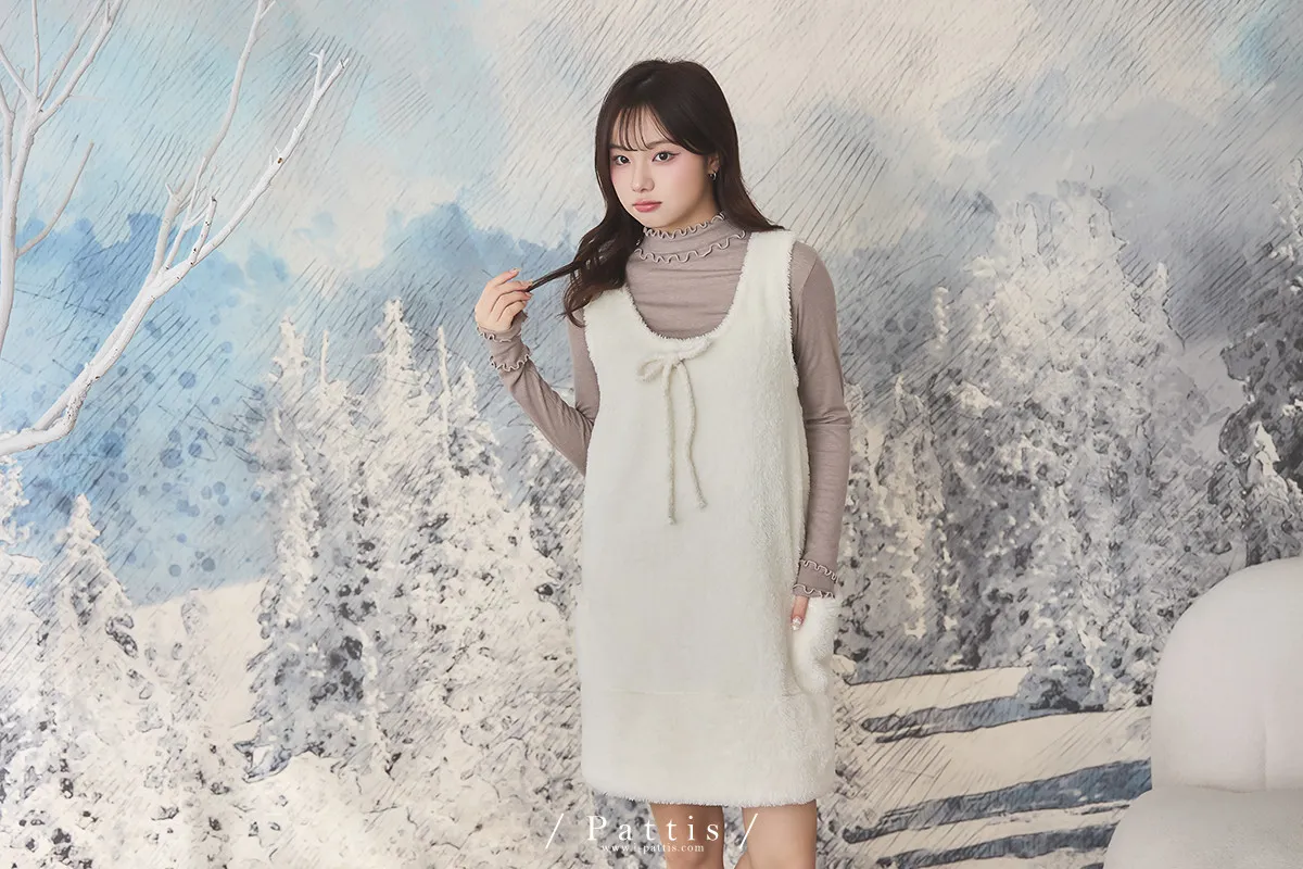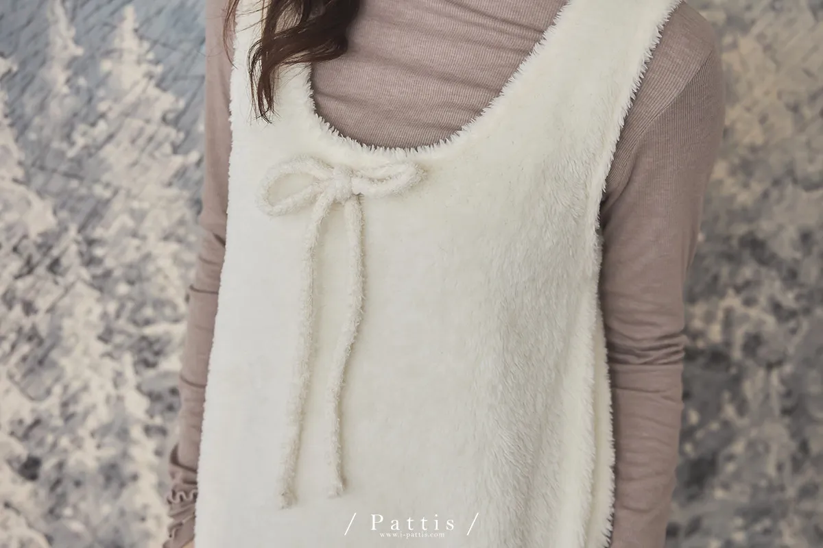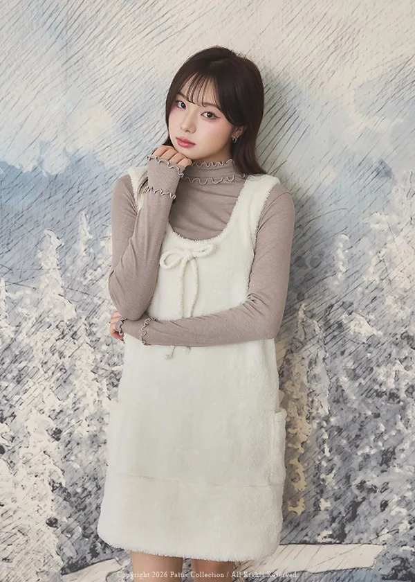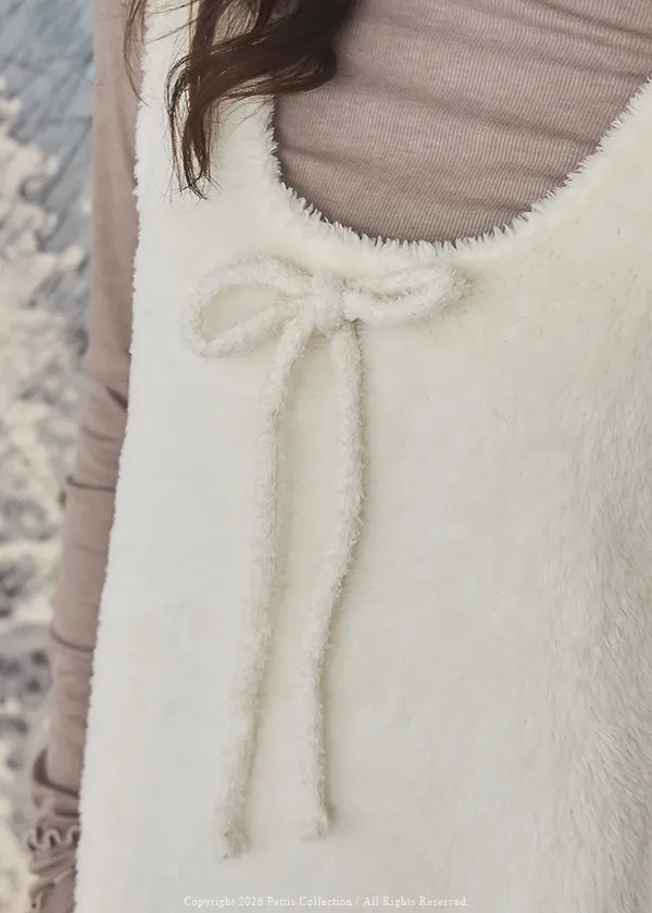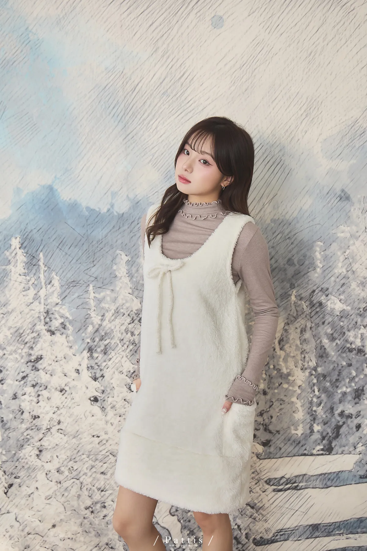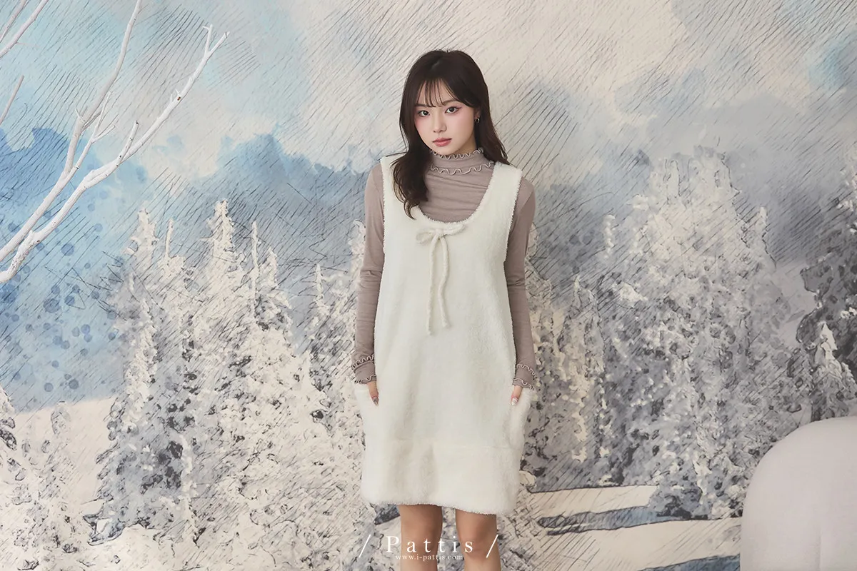 (現貨) 小公寓裡的泰迪 | 軟毛蓬鬆雙口袋圓領蝴蝶結短洋裝(米白)