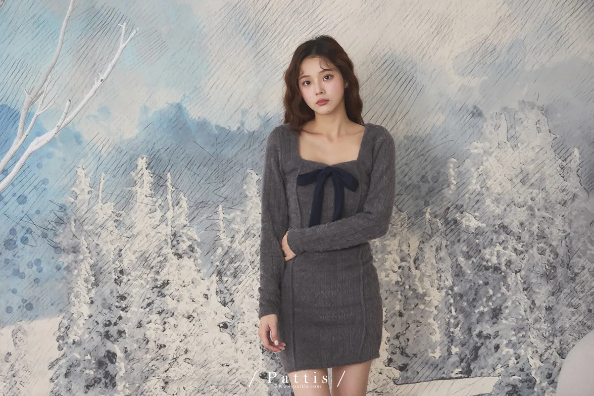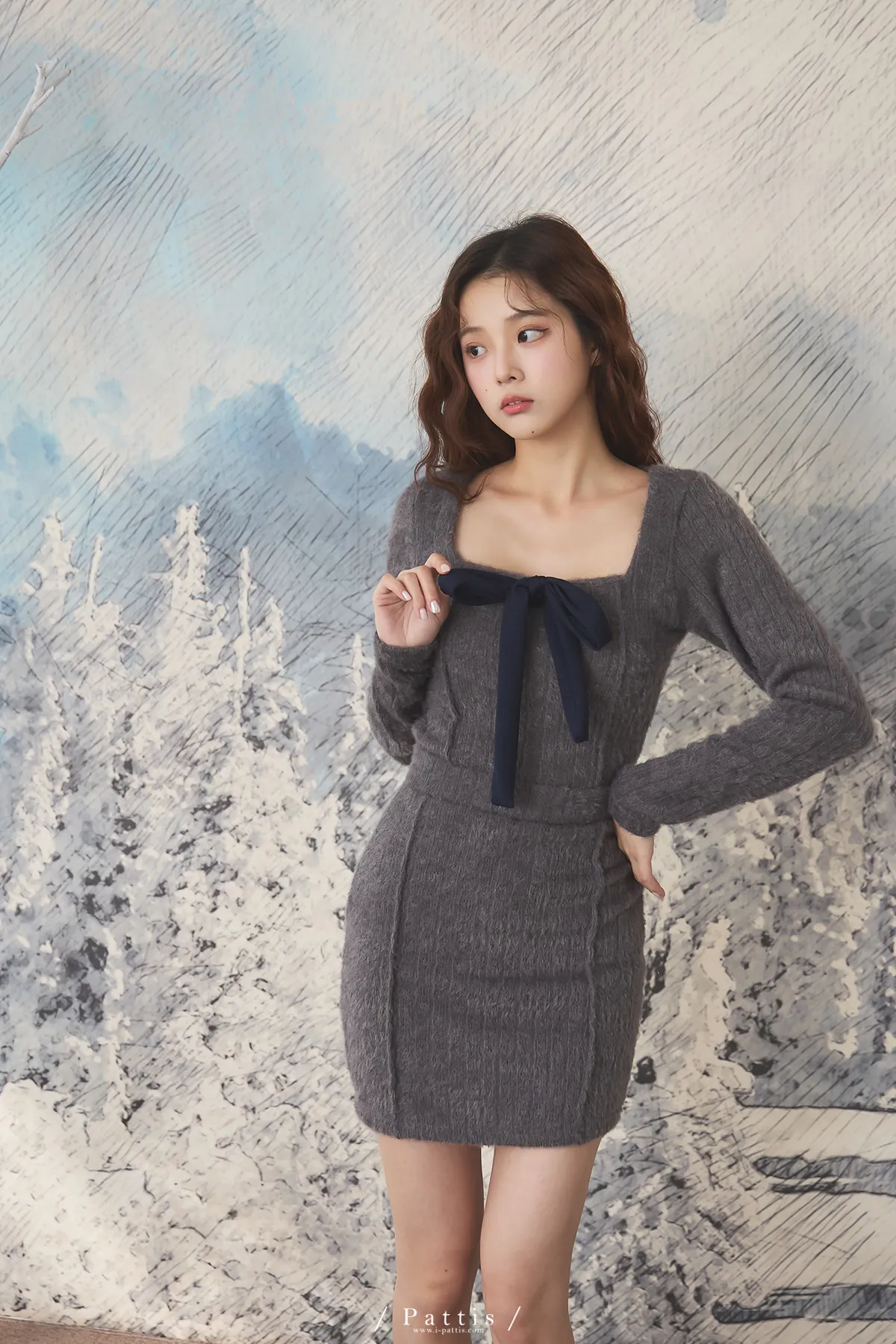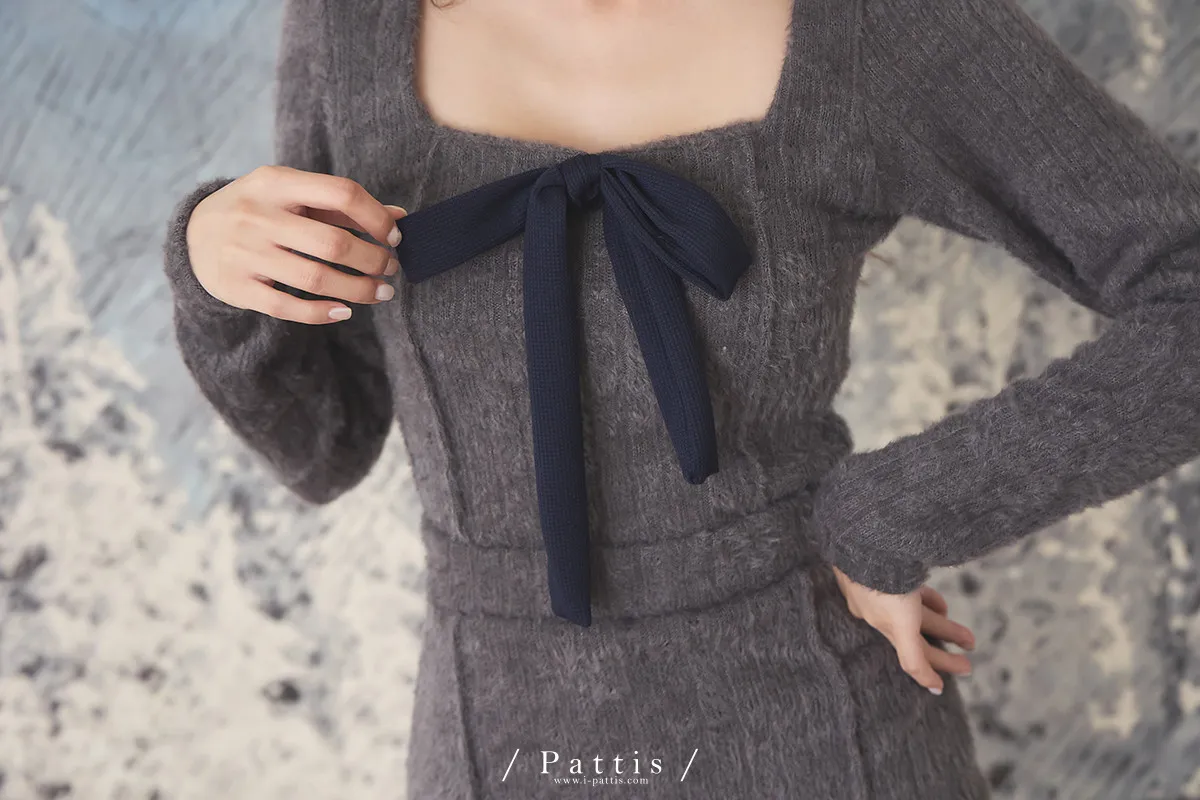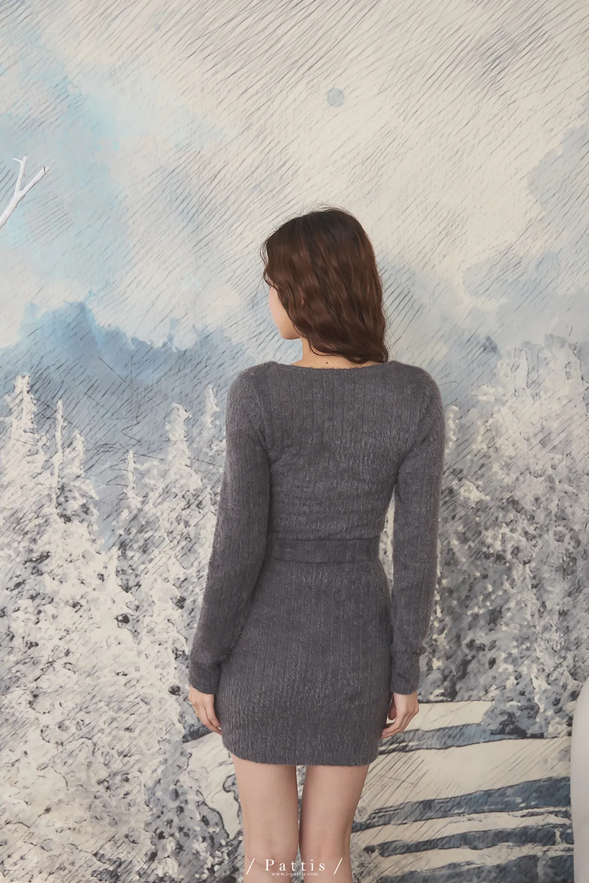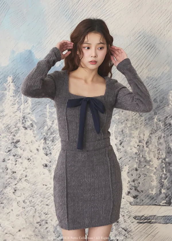 (現貨)甜美超載中 | 軟毛薄料彈性蝴蝶結上衣+壓褶短裙set(藍灰)