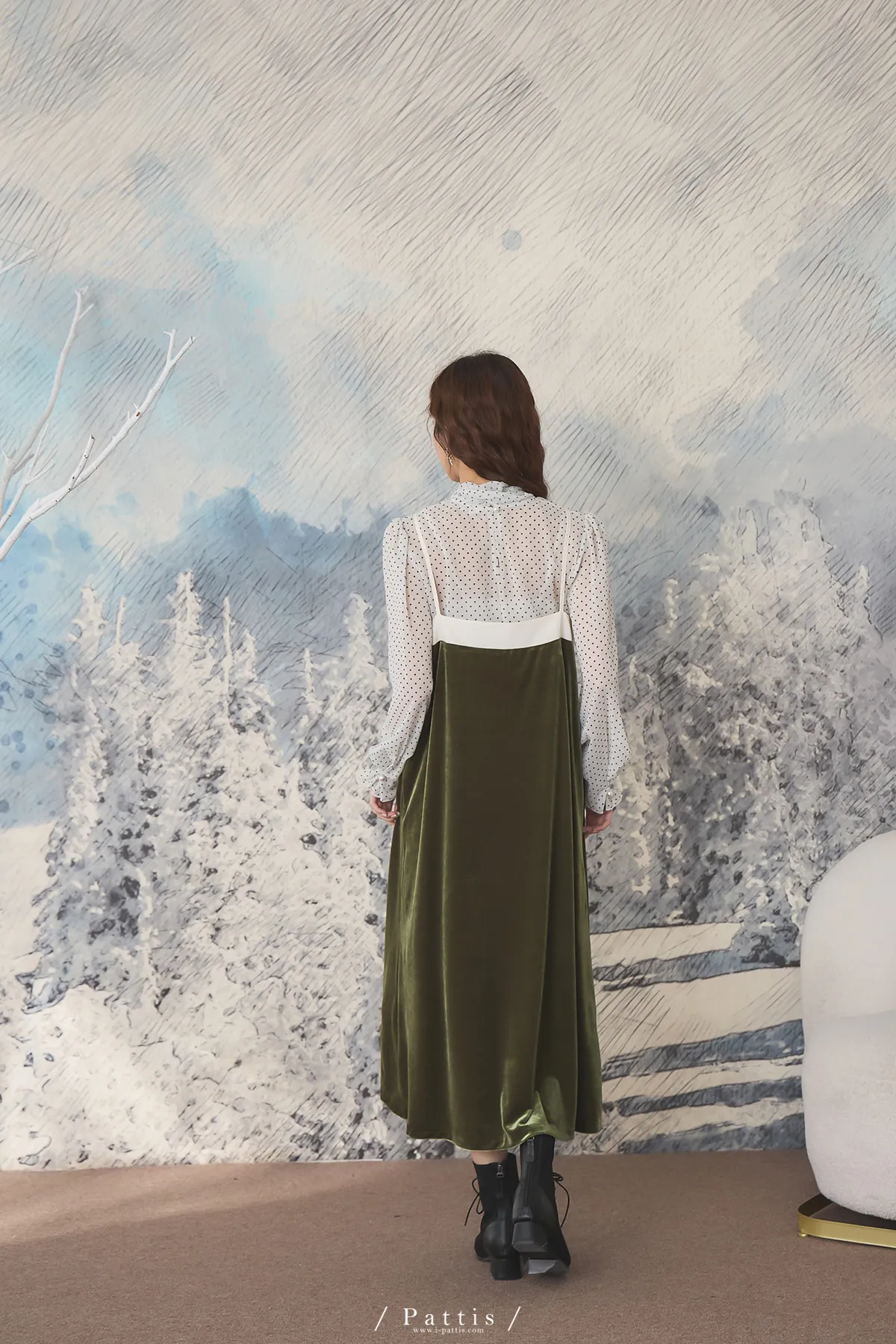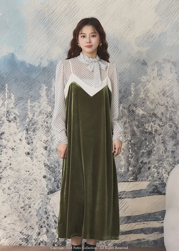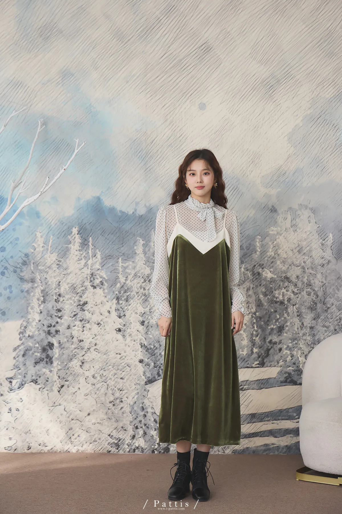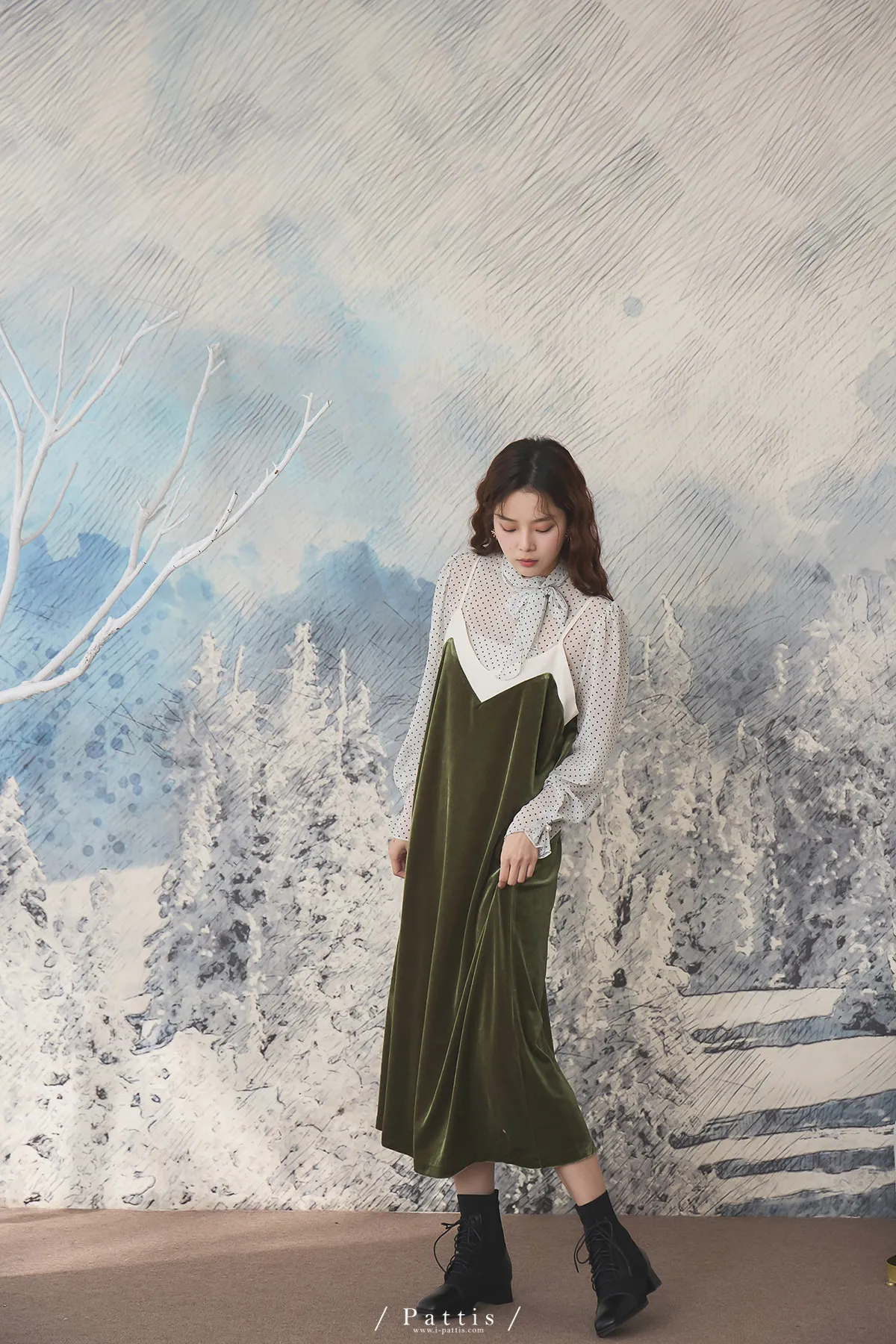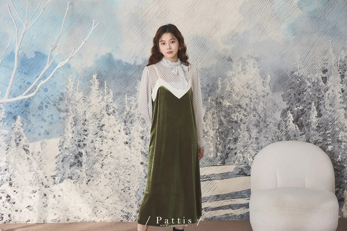 天鵝湖第三幕 | 雙色拼接天鵝絨吊帶洋裝(抹茶綠)