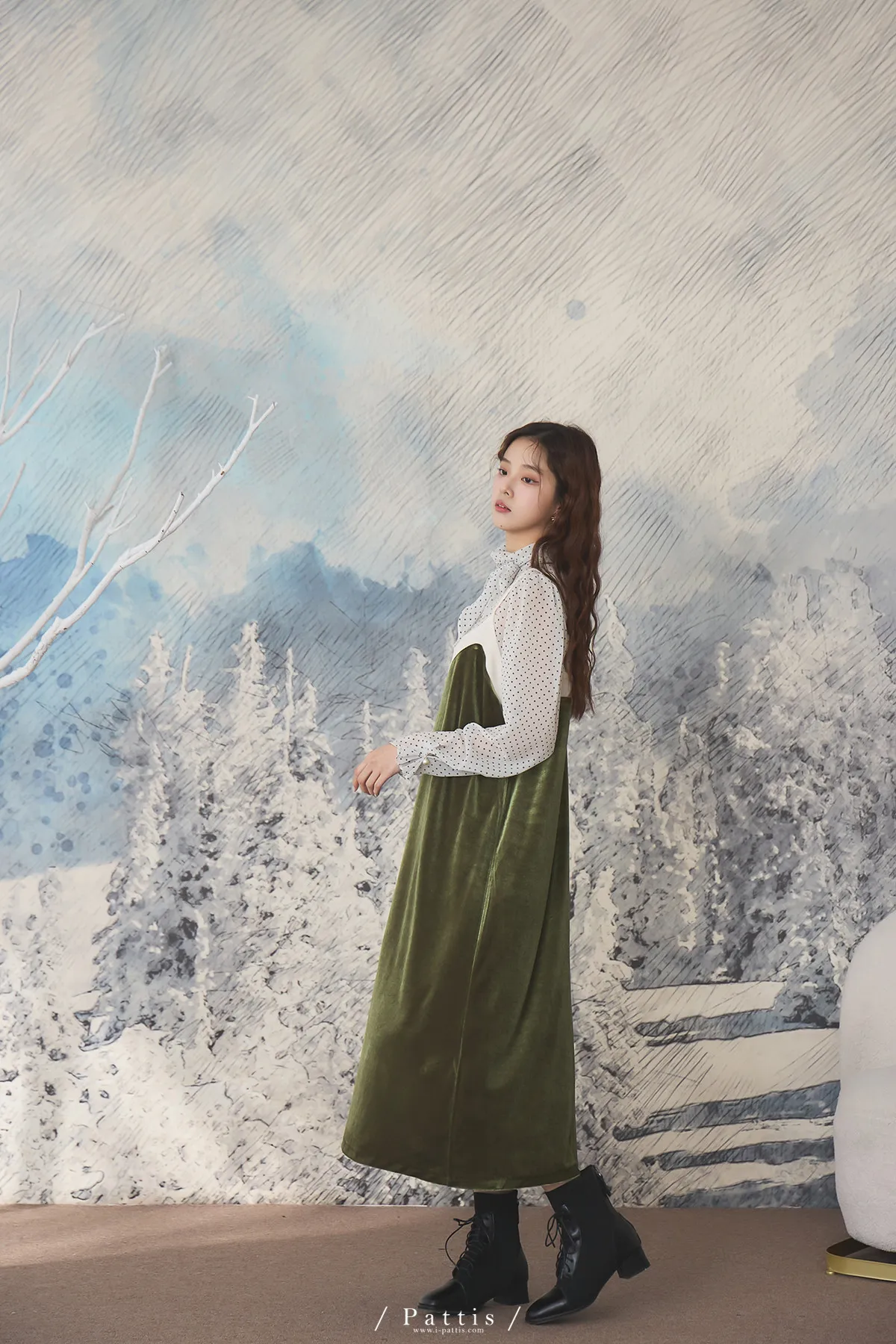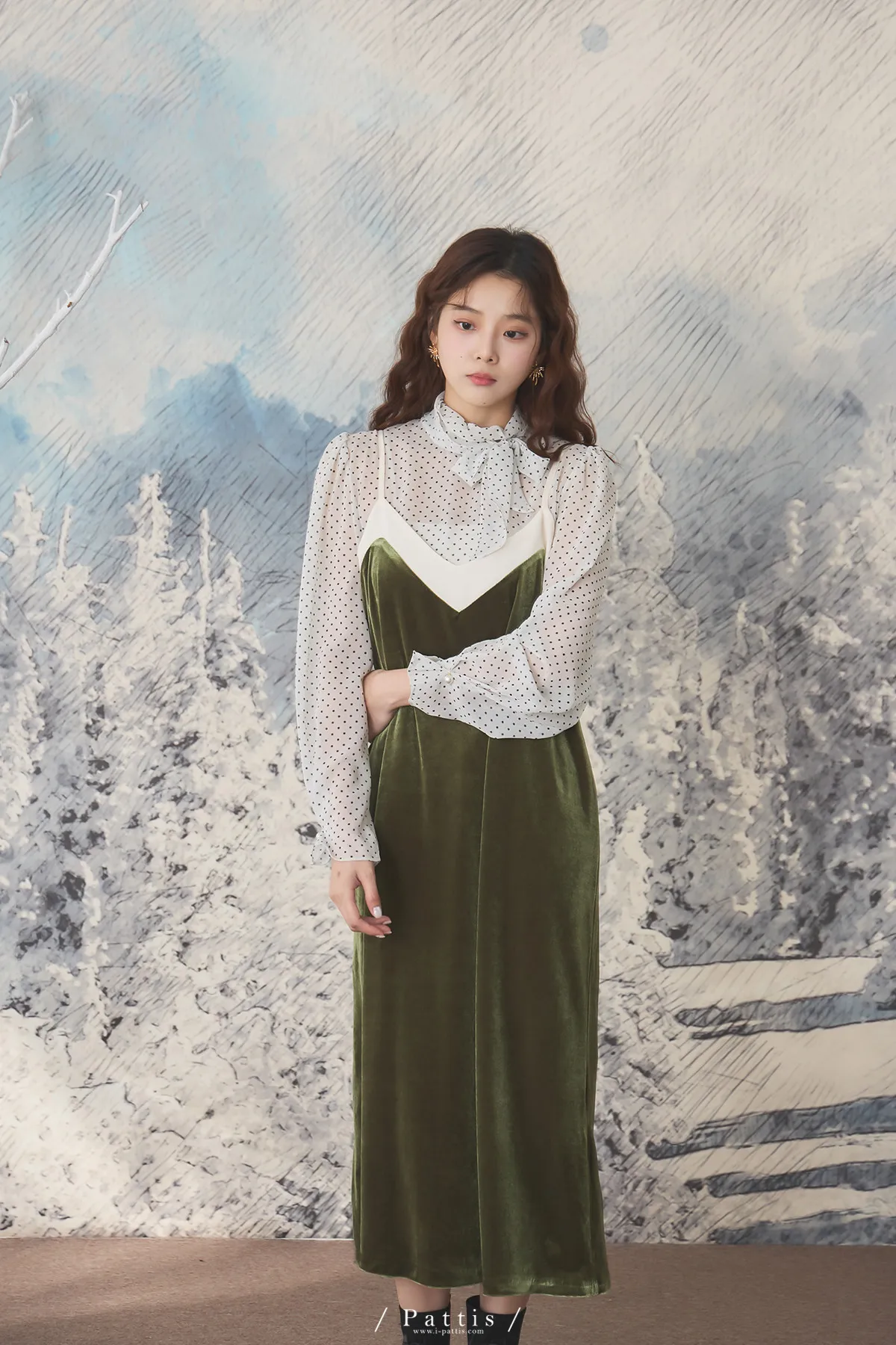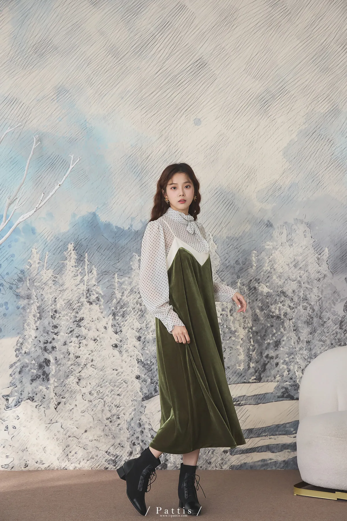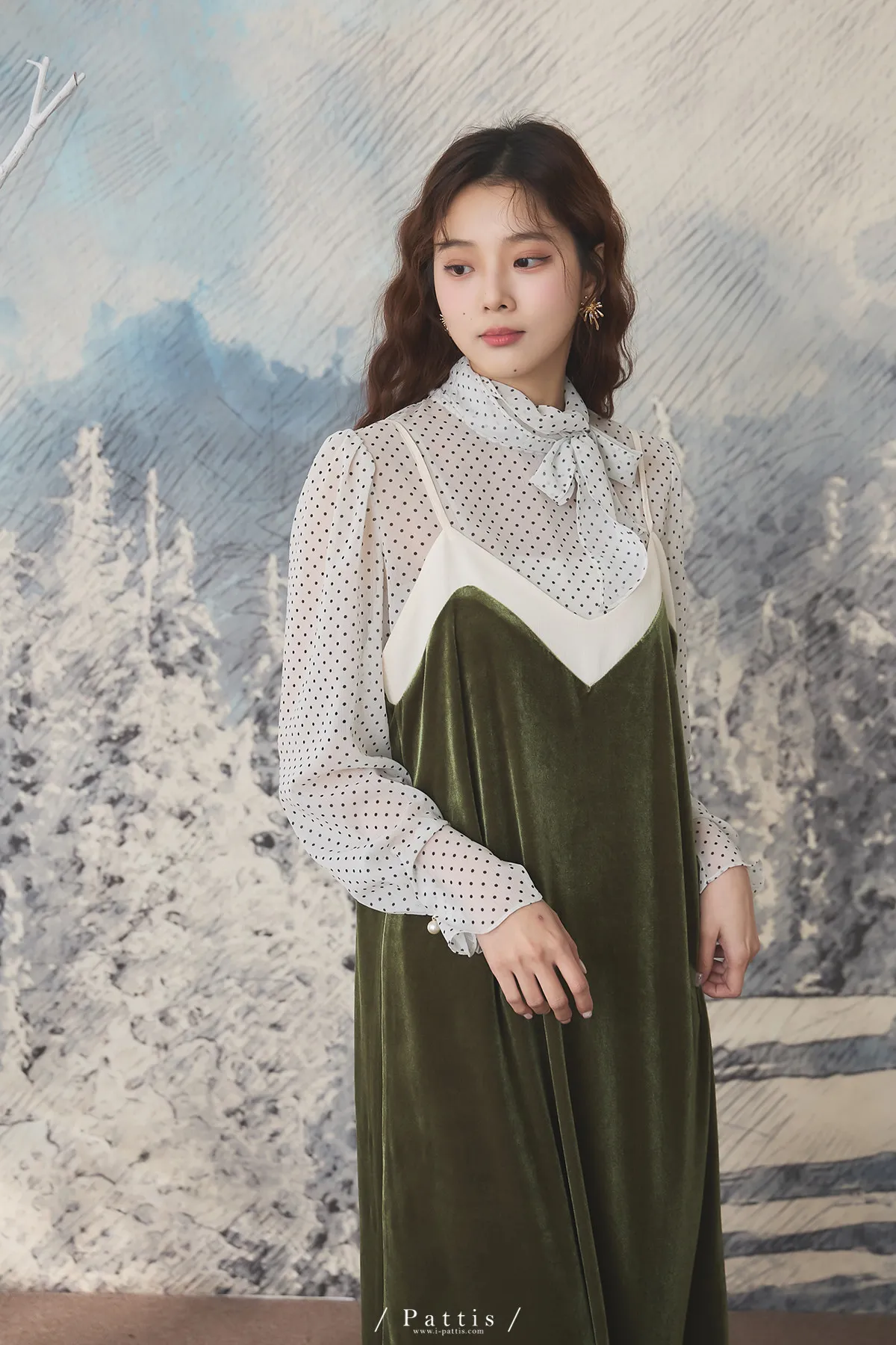 天鵝湖第三幕 | 雙色拼接天鵝絨吊帶洋裝(抹茶綠)