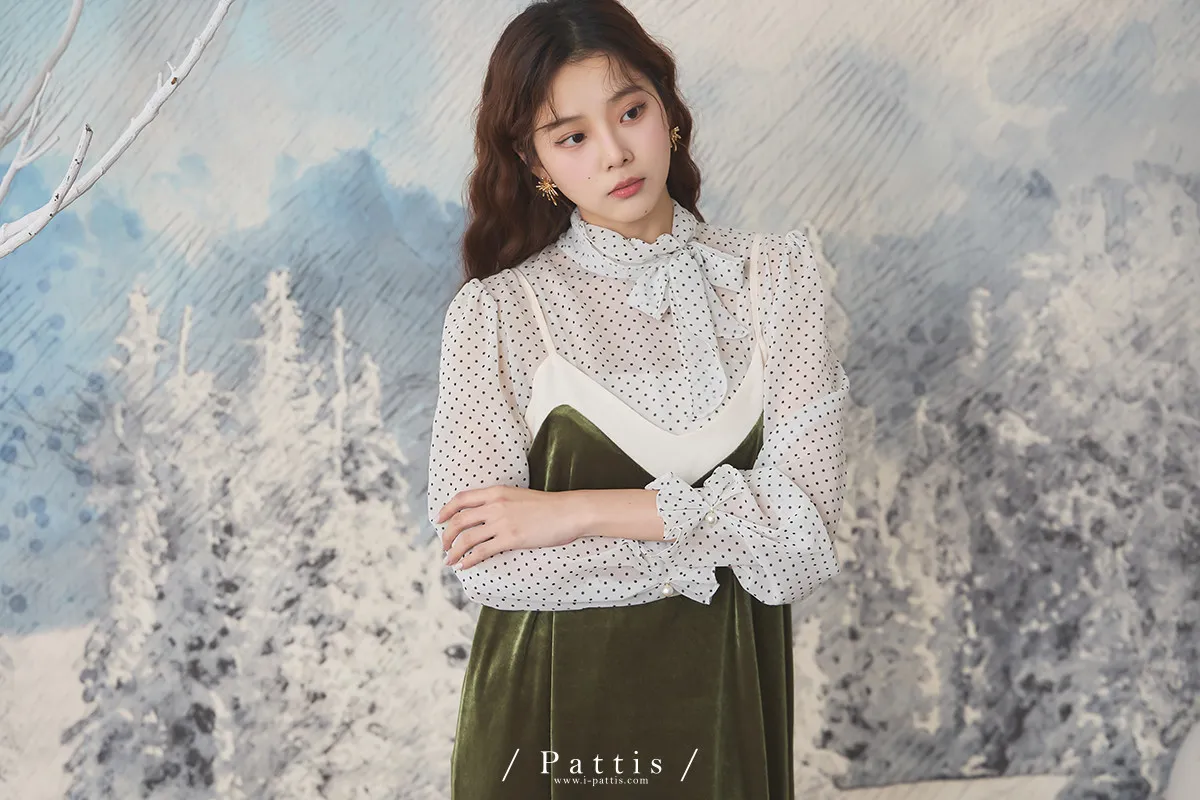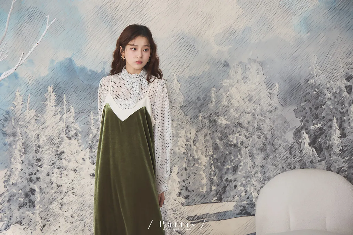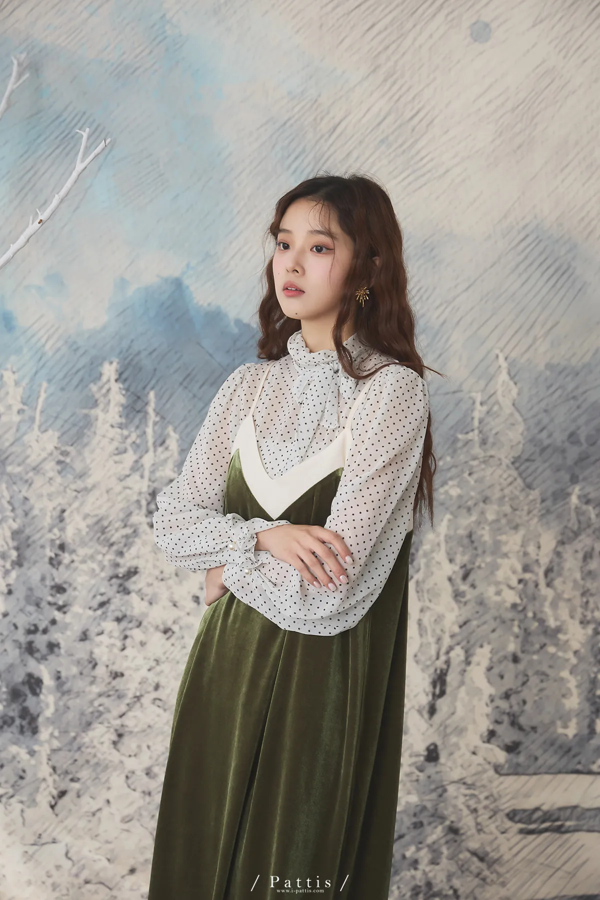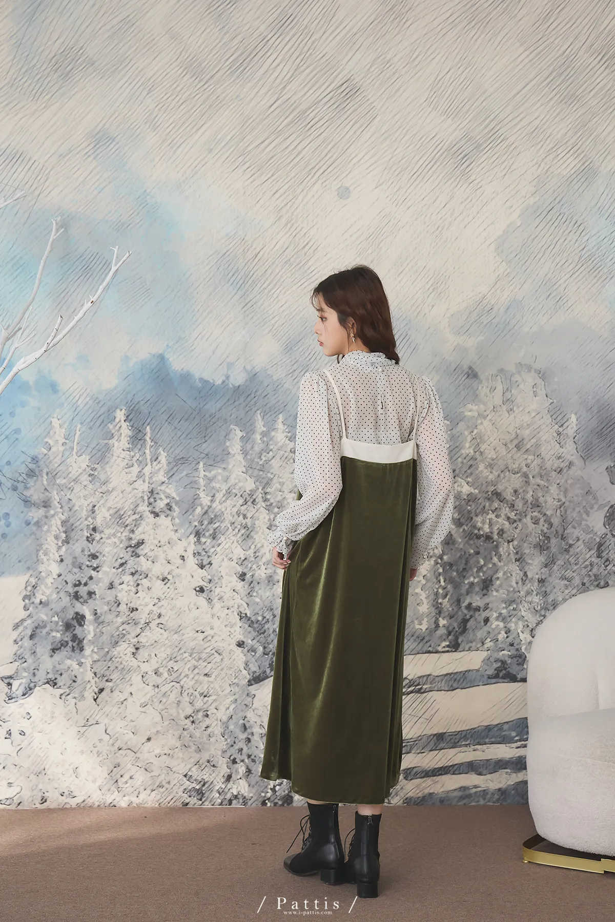 天鵝湖第三幕 | 雙色拼接天鵝絨吊帶洋裝(抹茶綠)