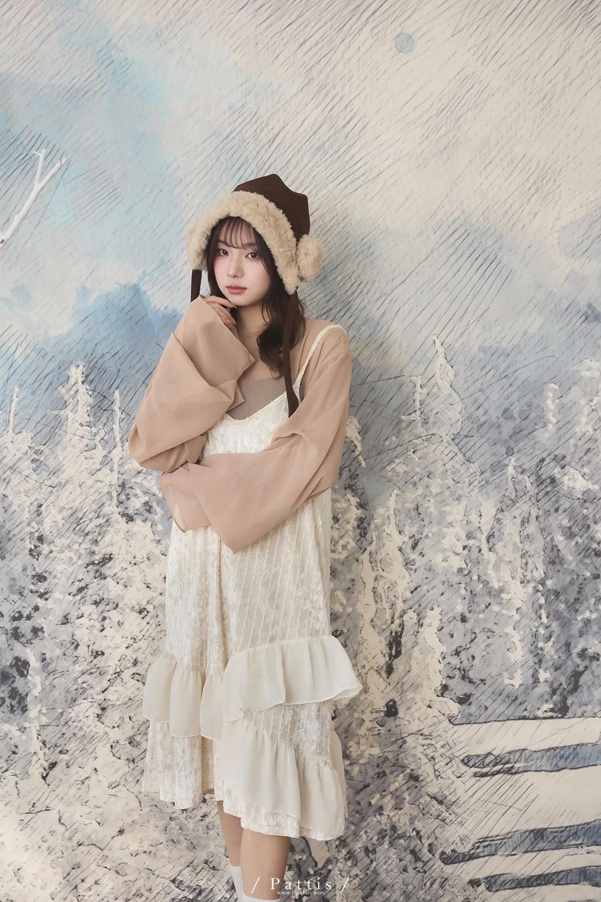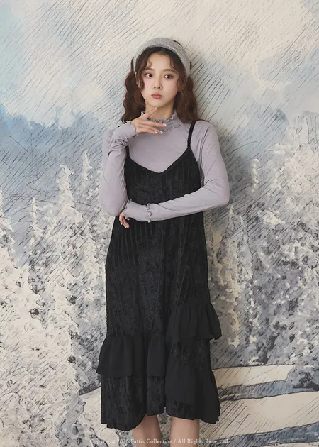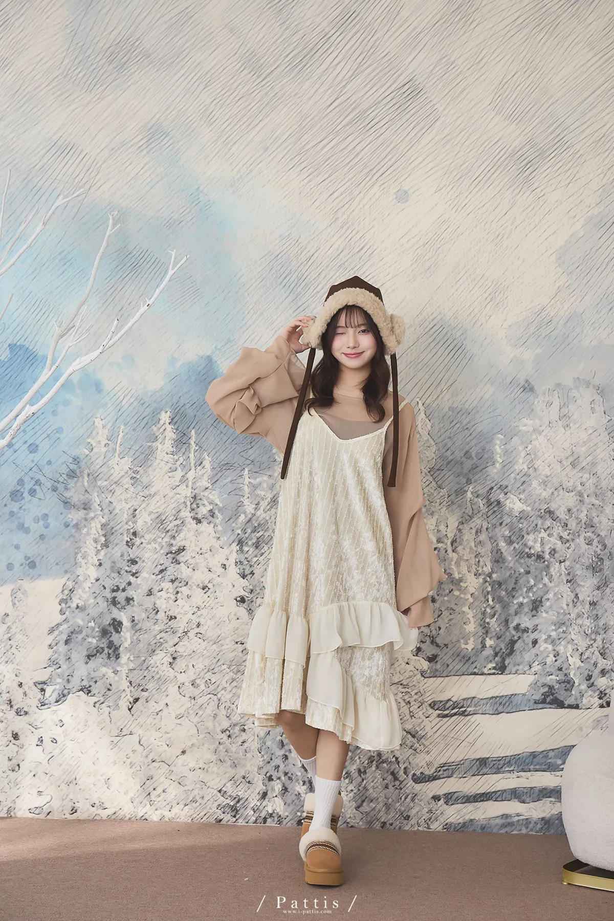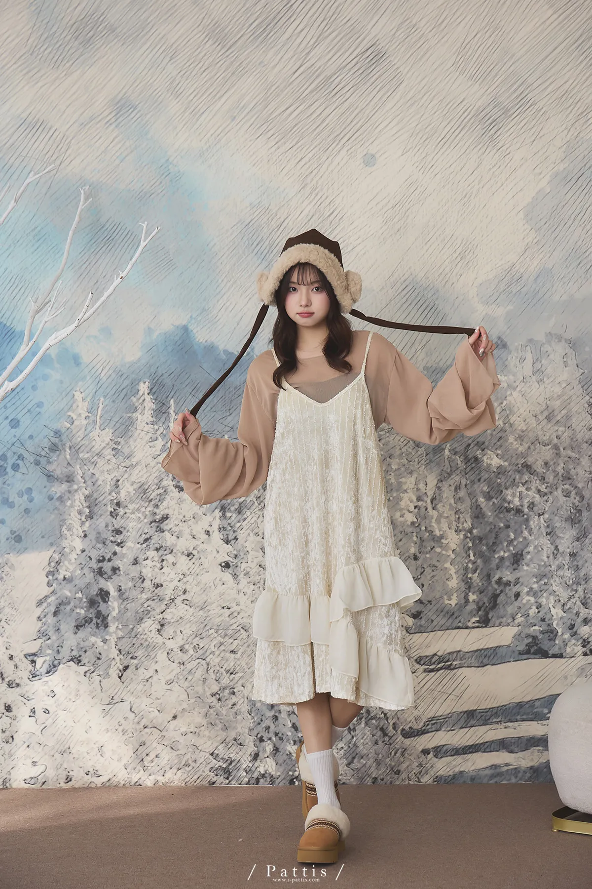 月光陷阱 | 天鵝絨光感荷葉不對稱吊帶洋裝(米杏)