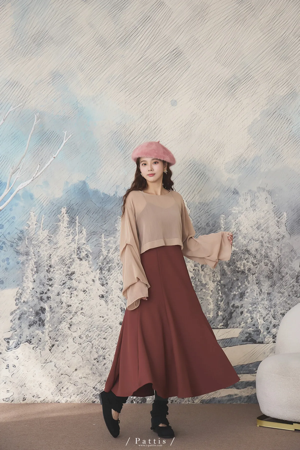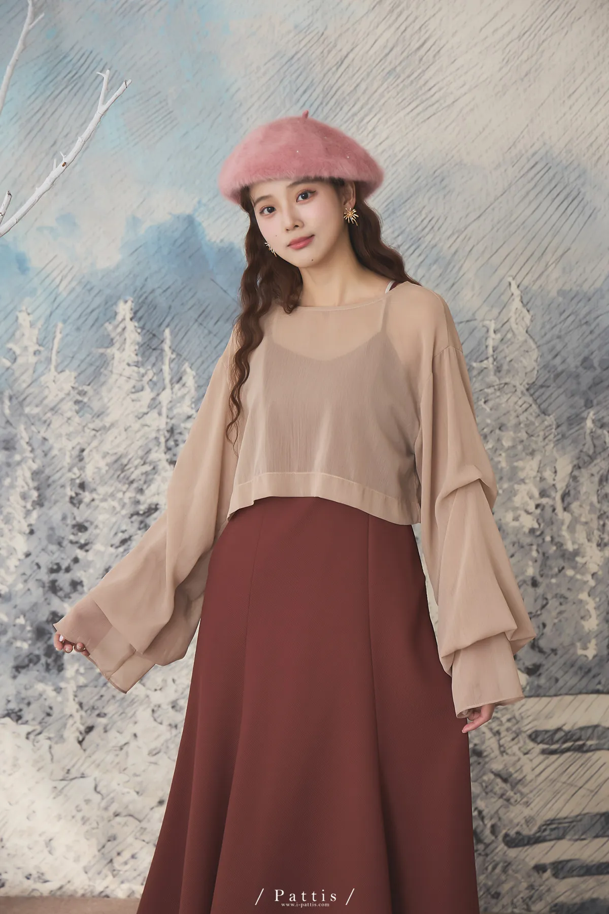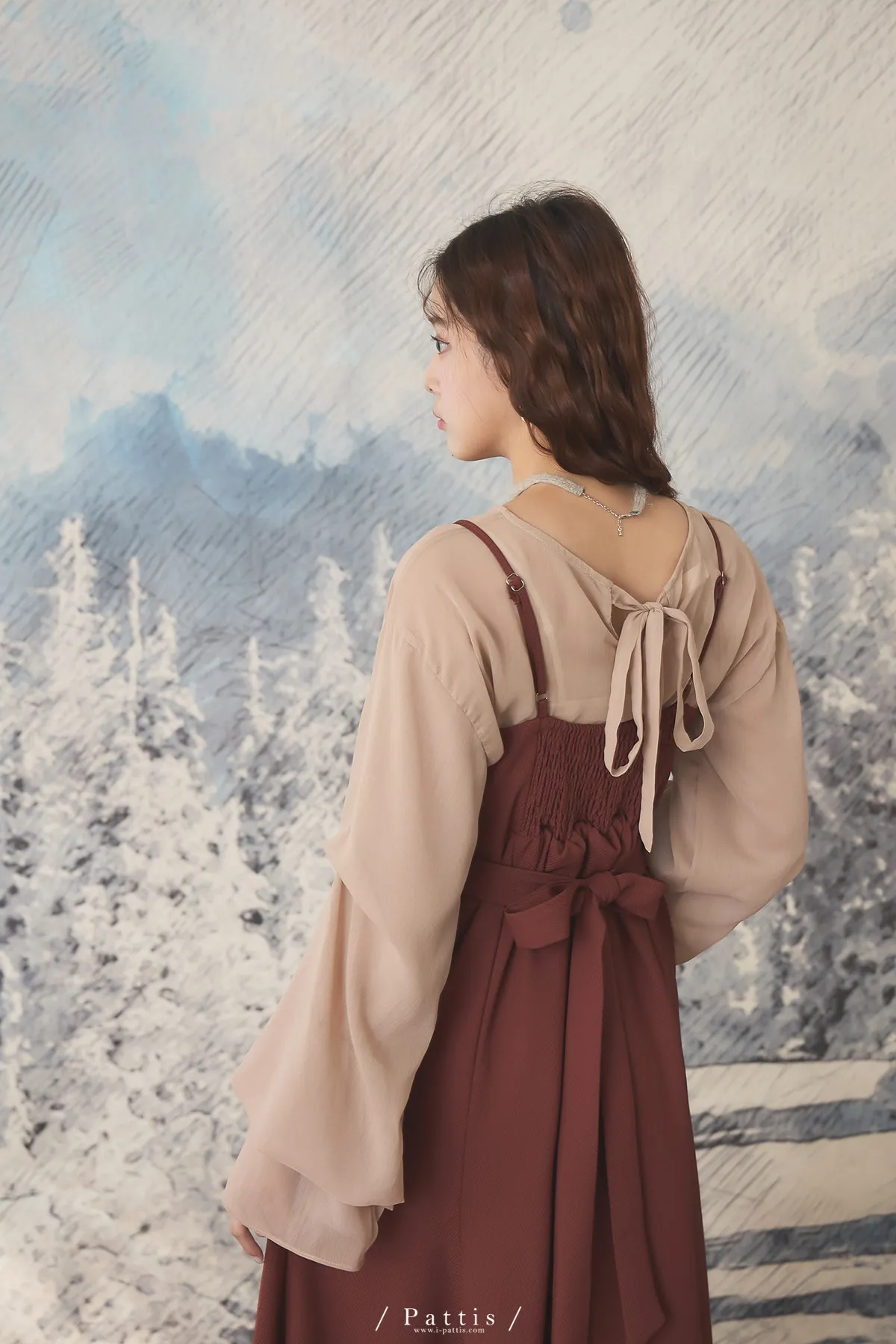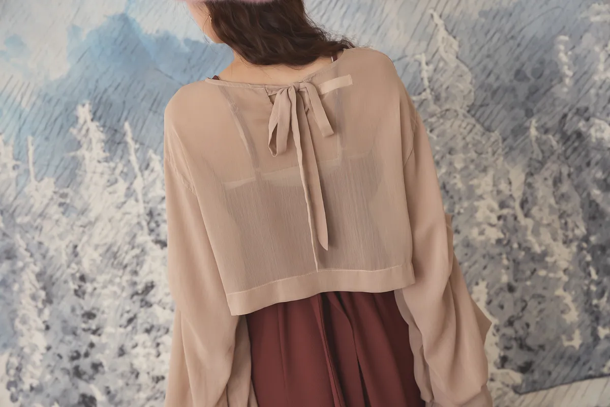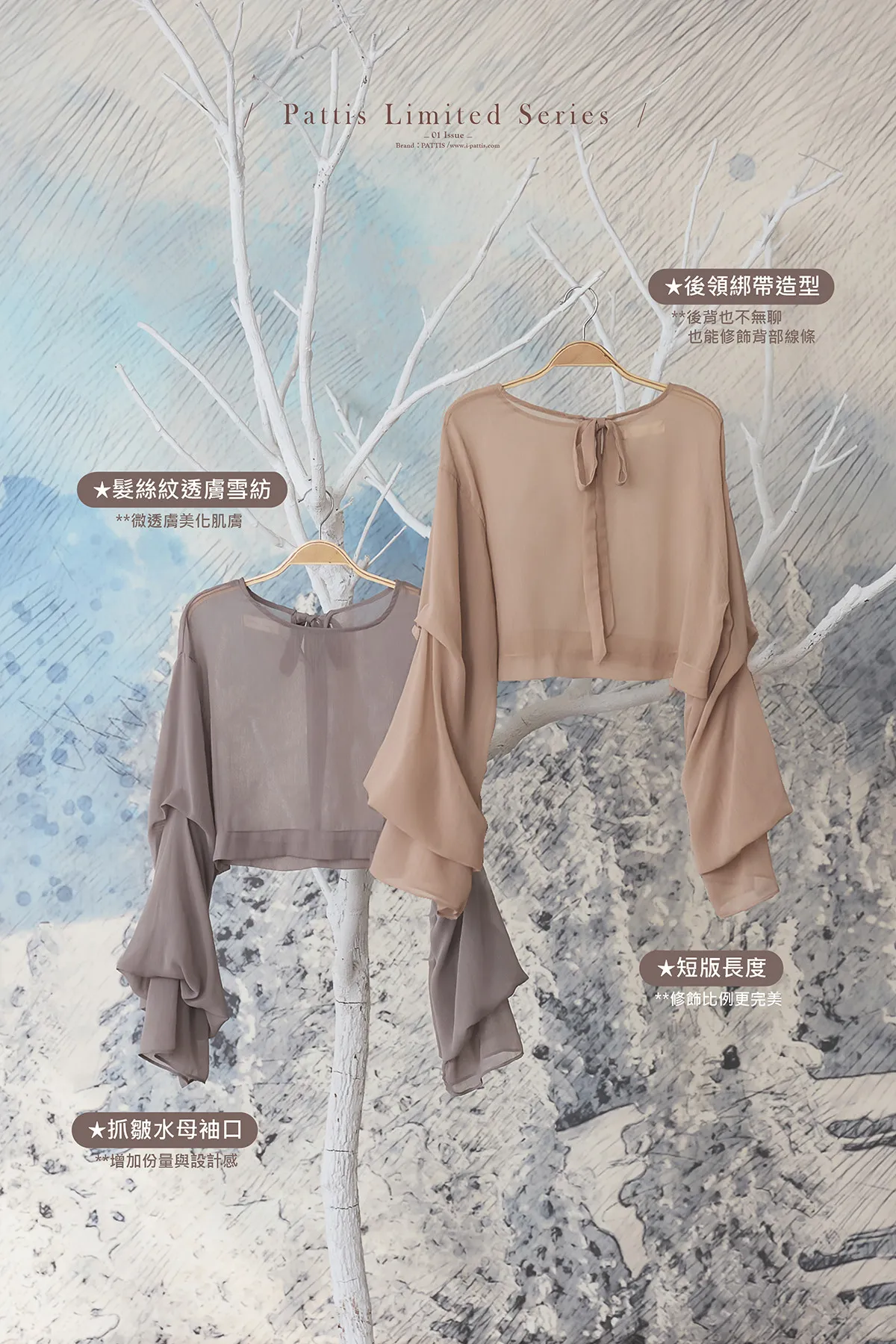 微透肌的上衣,袖子像層層的水母紋路很有造型,後領也有綁帶修飾背部曲線