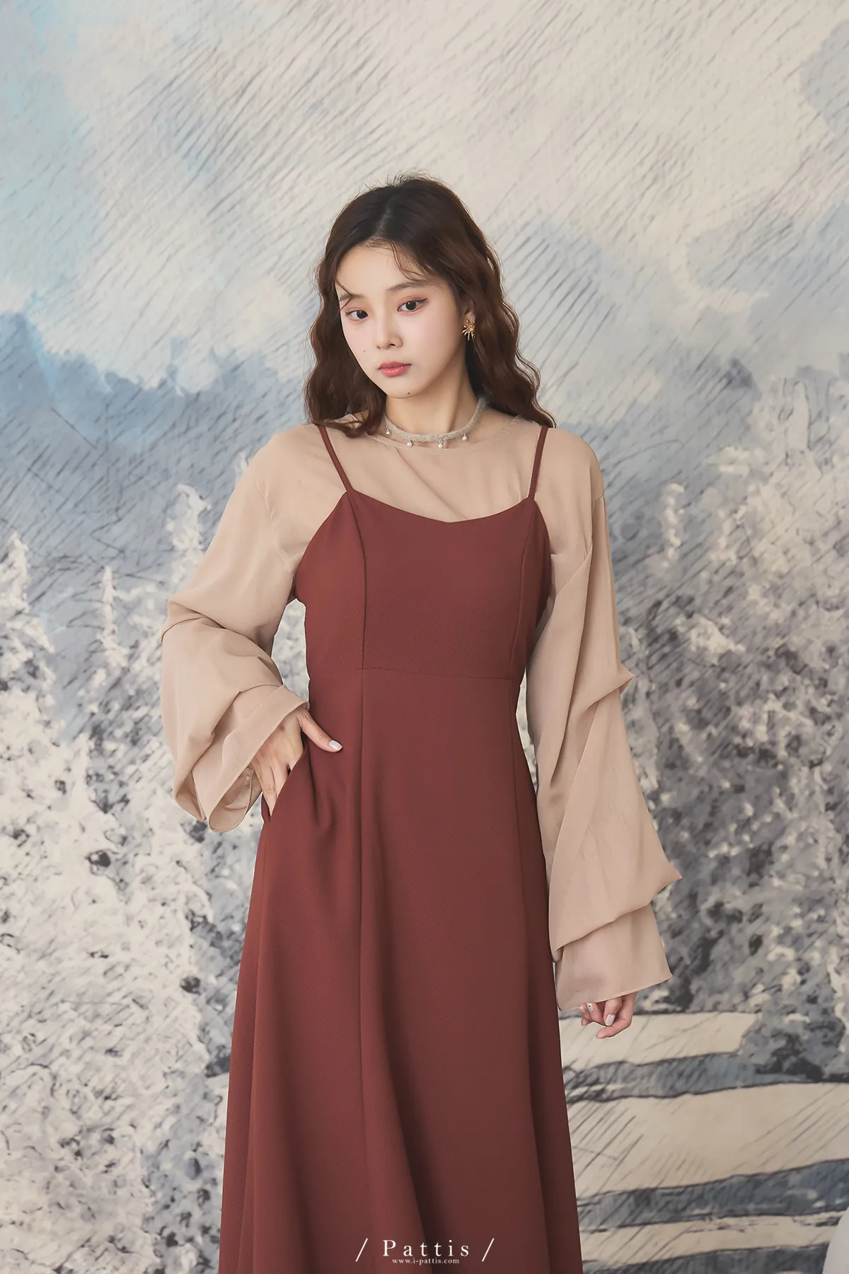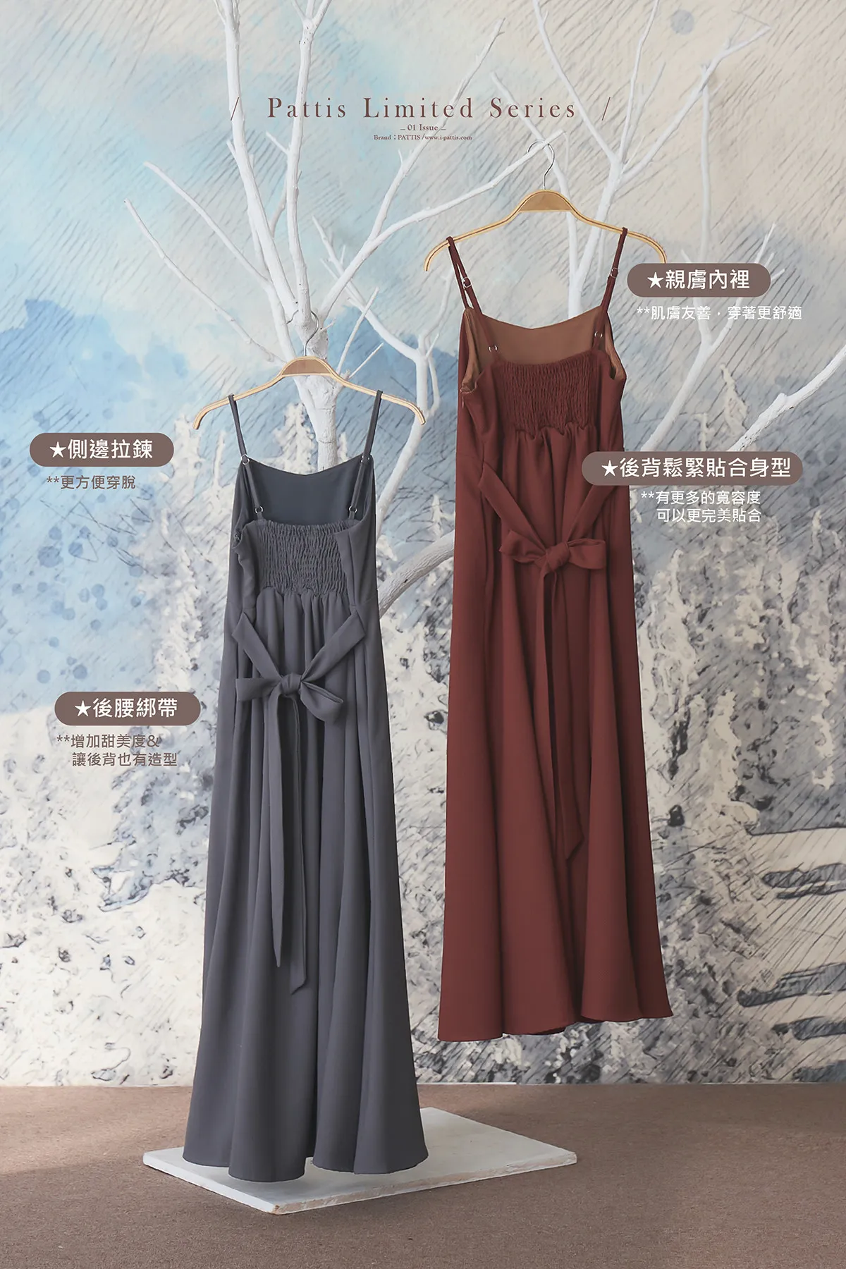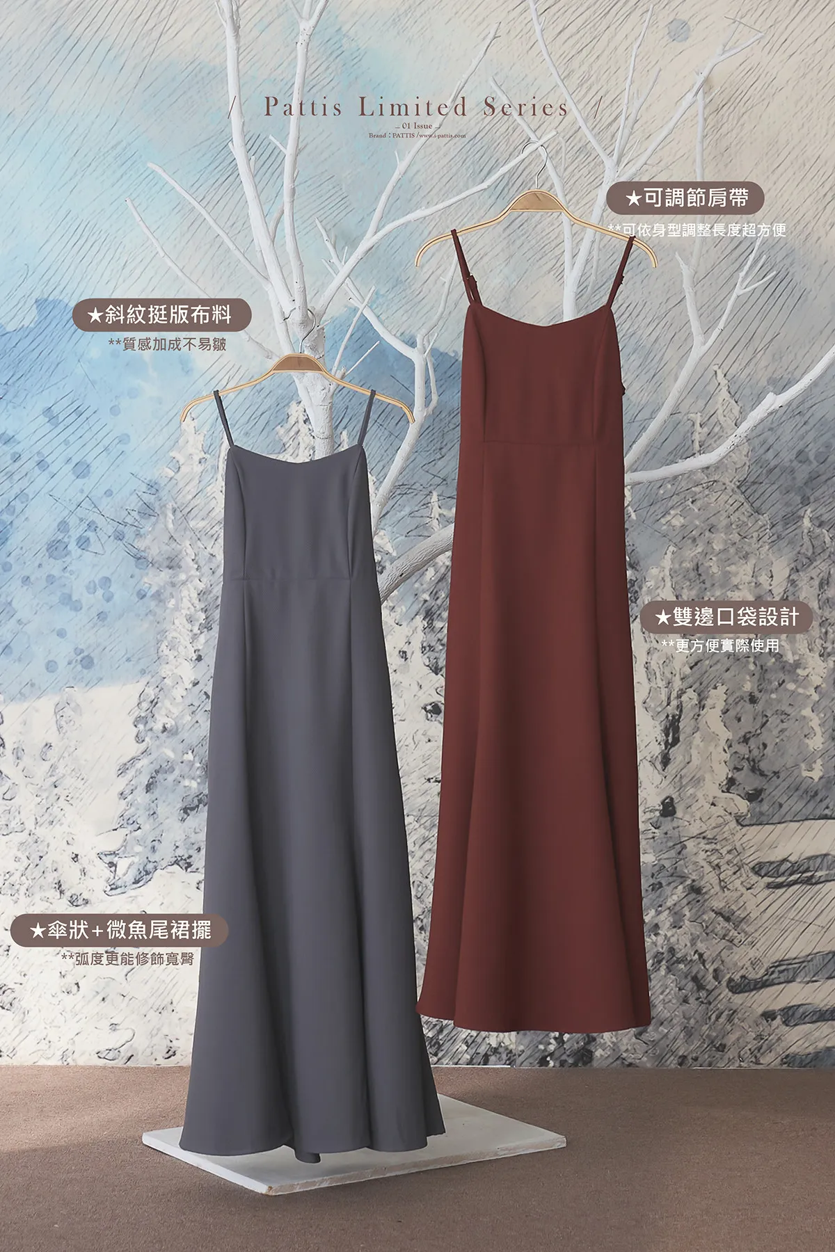 吊帶洋裝是斜紋布料,有點分量感也不易皺,近看也很有質感