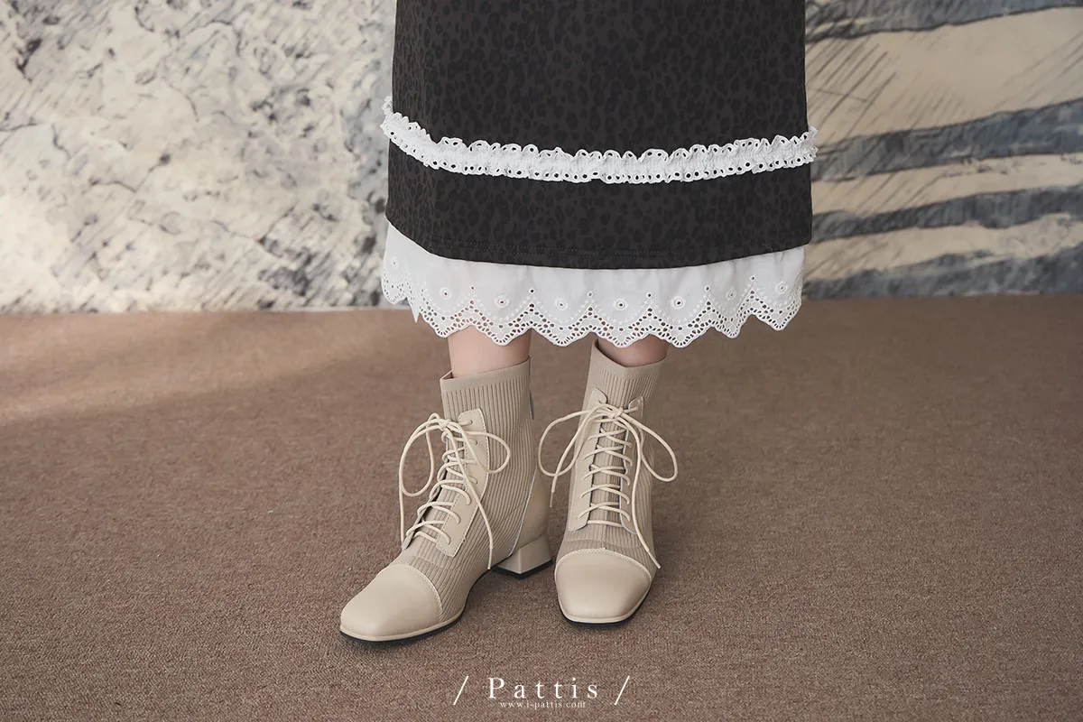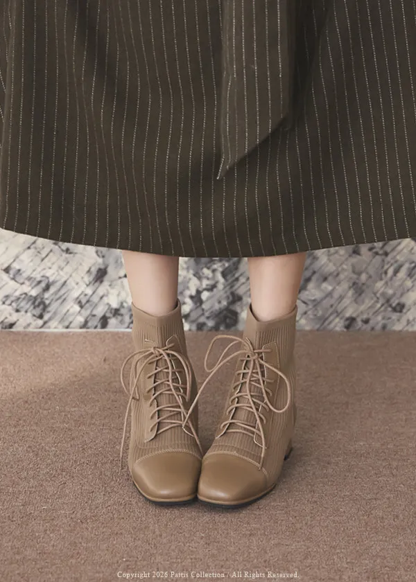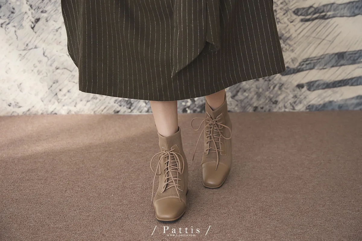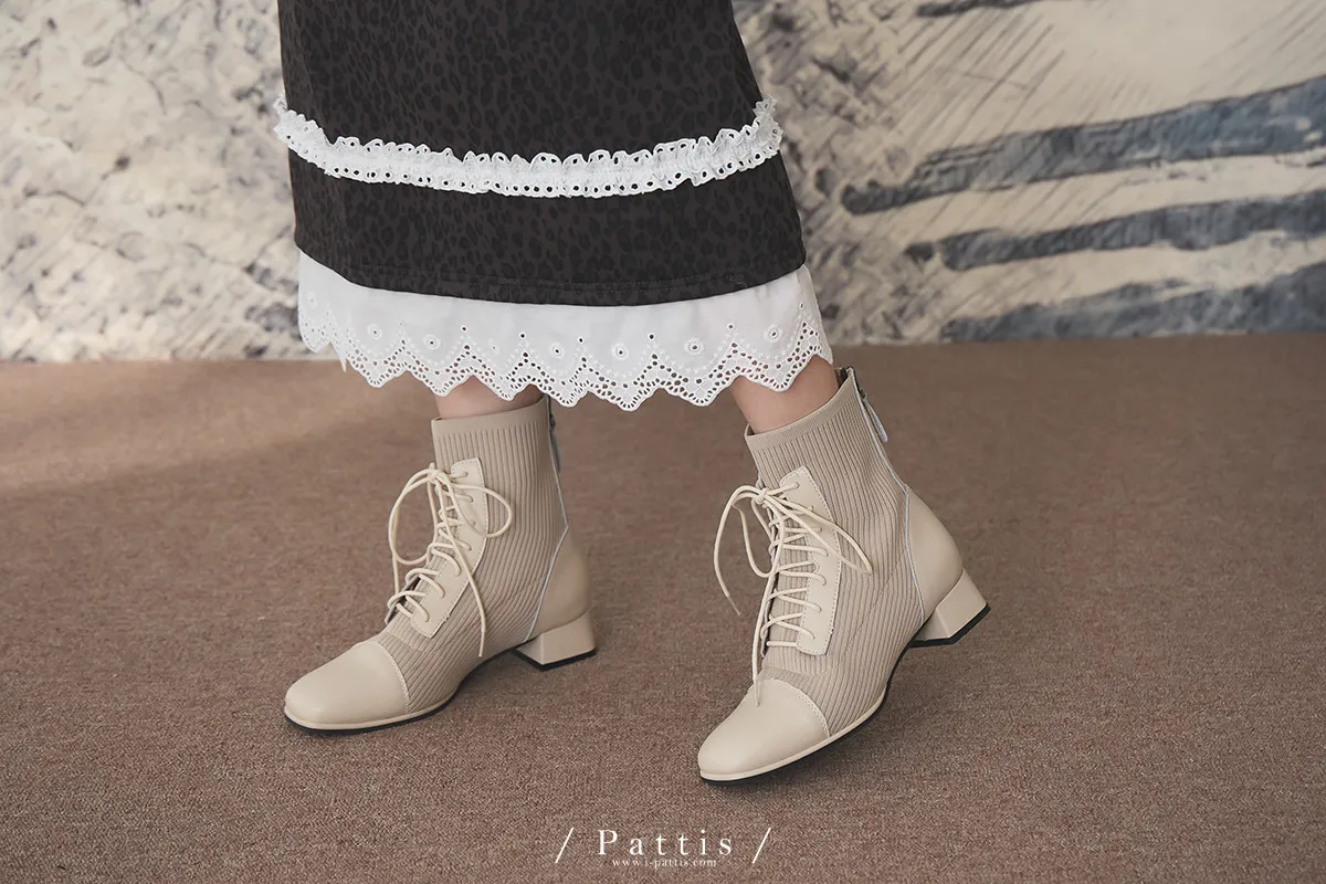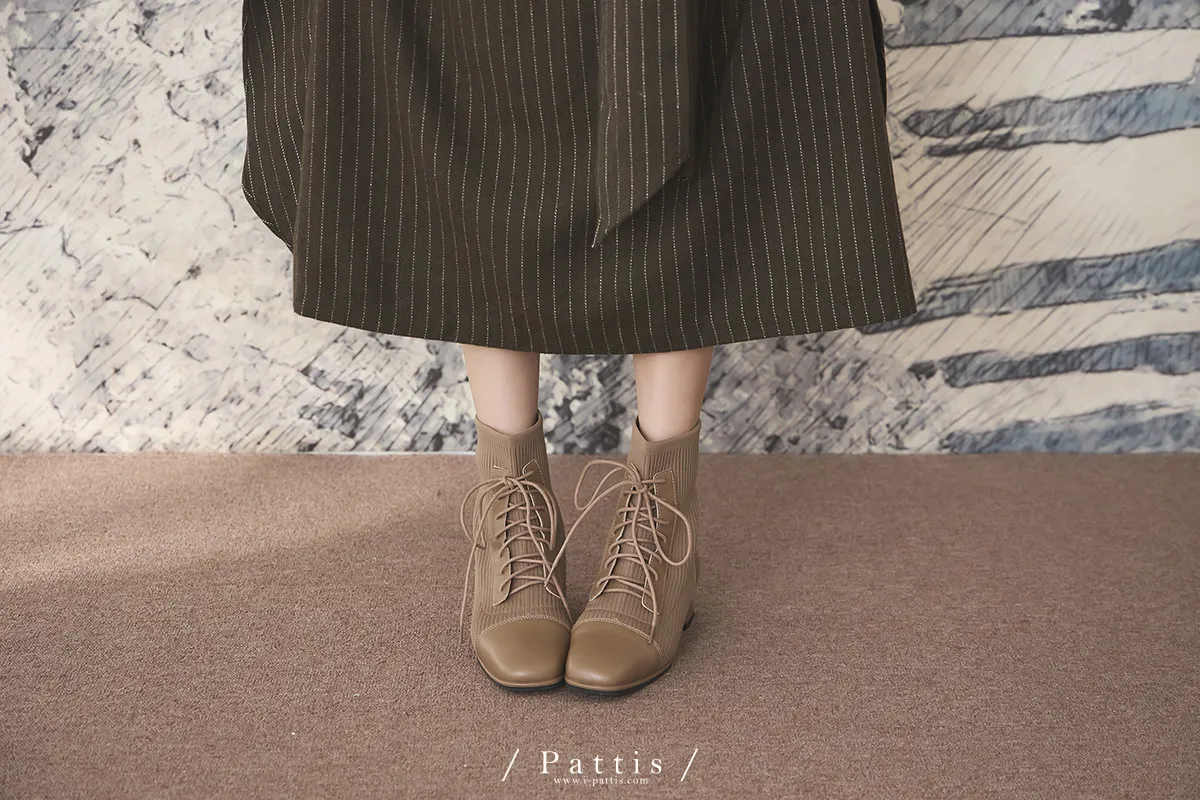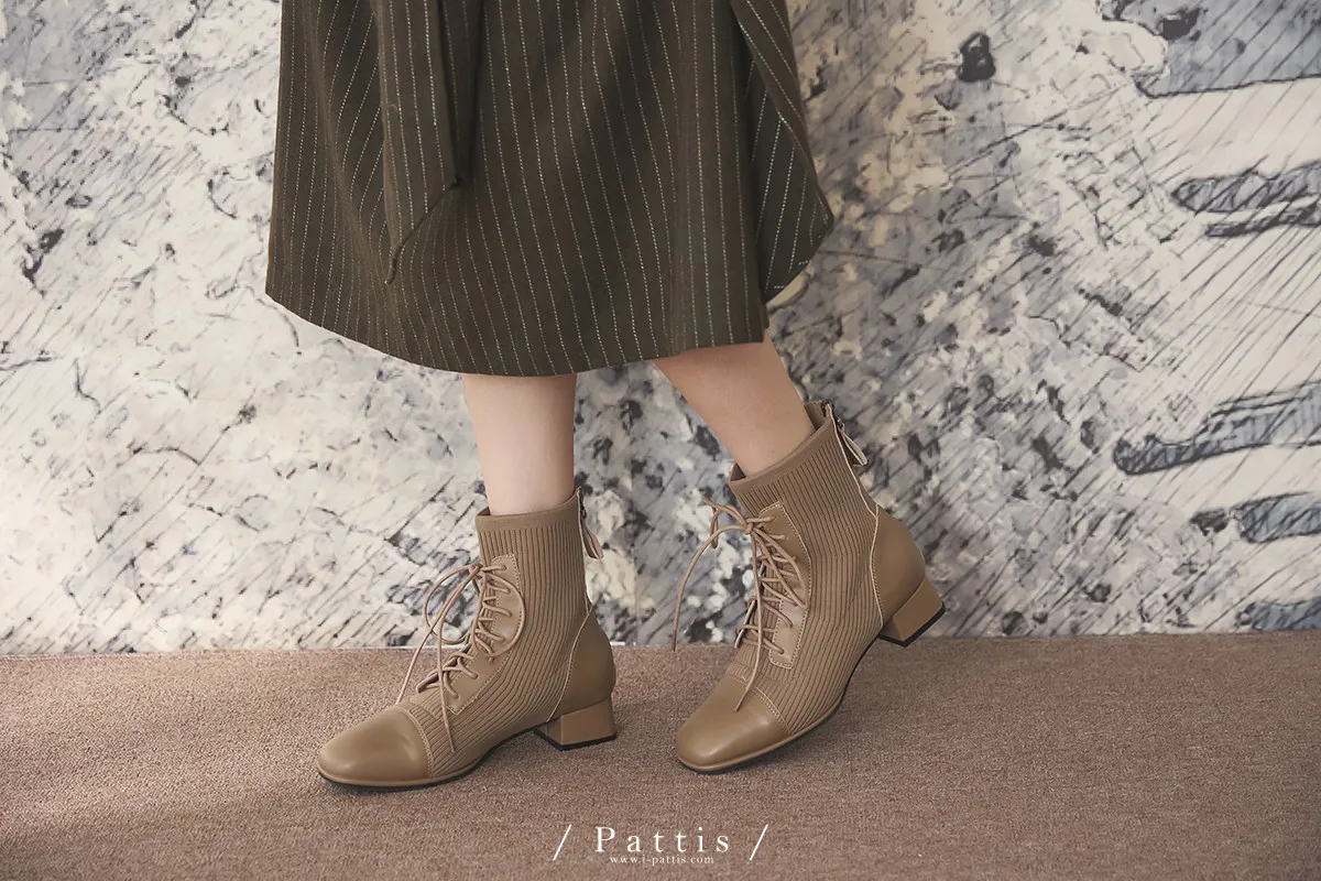 軟墊底綁帶拼接彈性羅紋短靴(米灰/棕/黑)