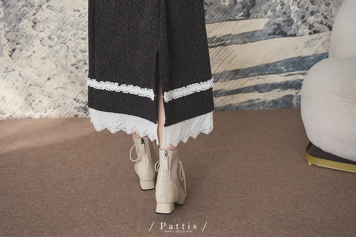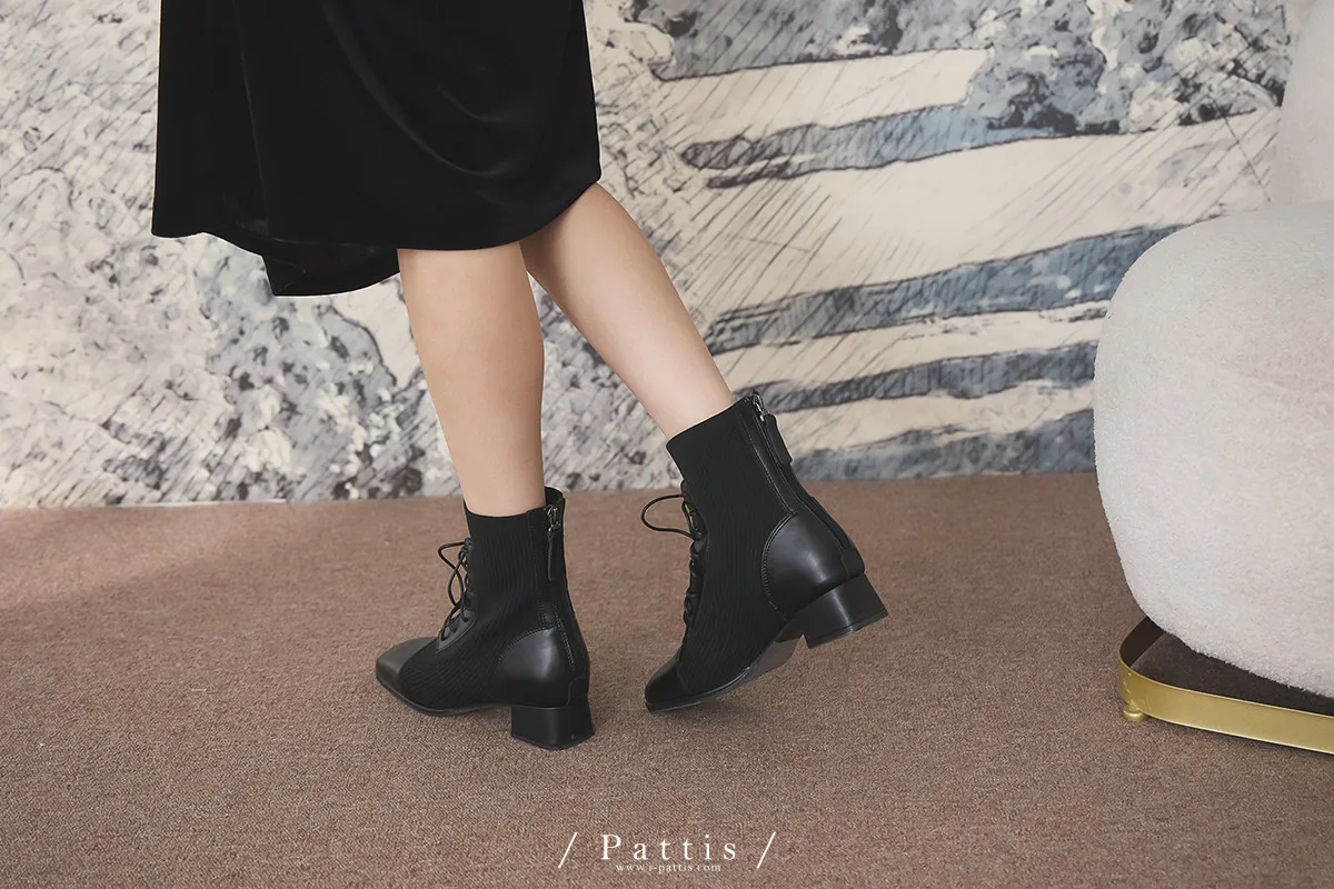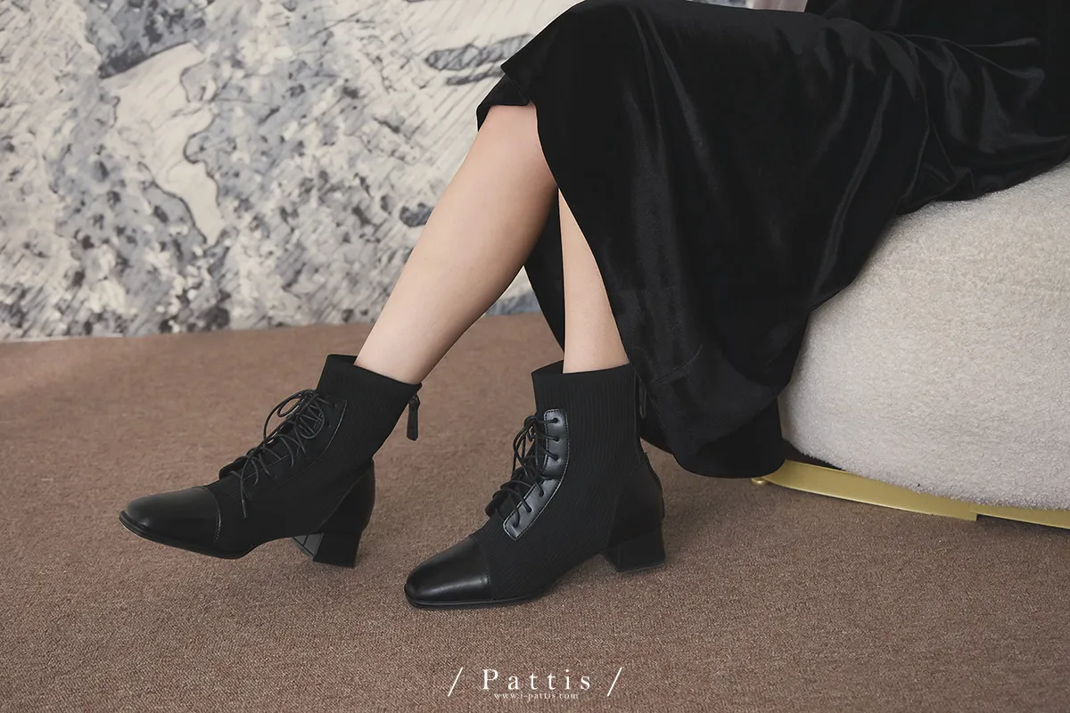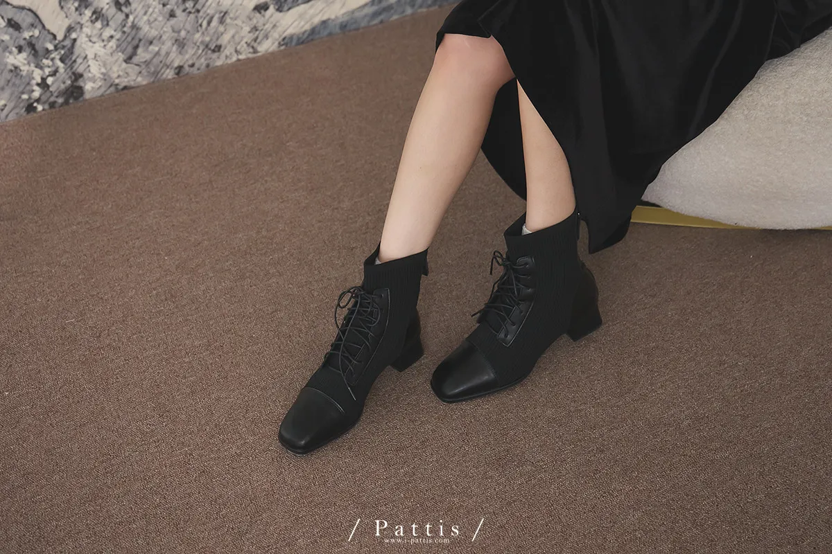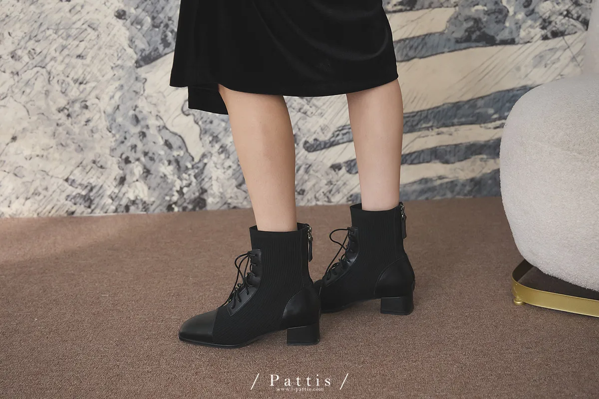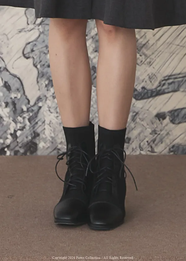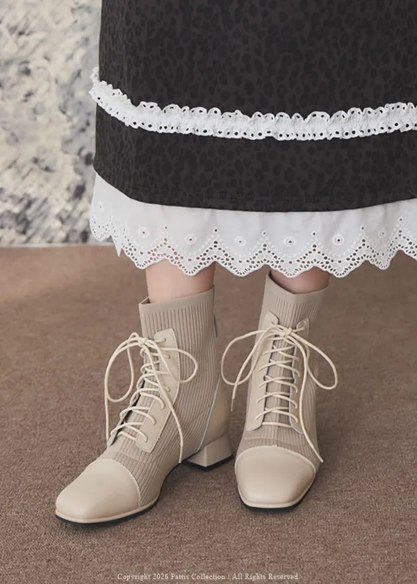 軟墊底綁帶拼接彈性羅紋短靴(米灰/棕/黑)
