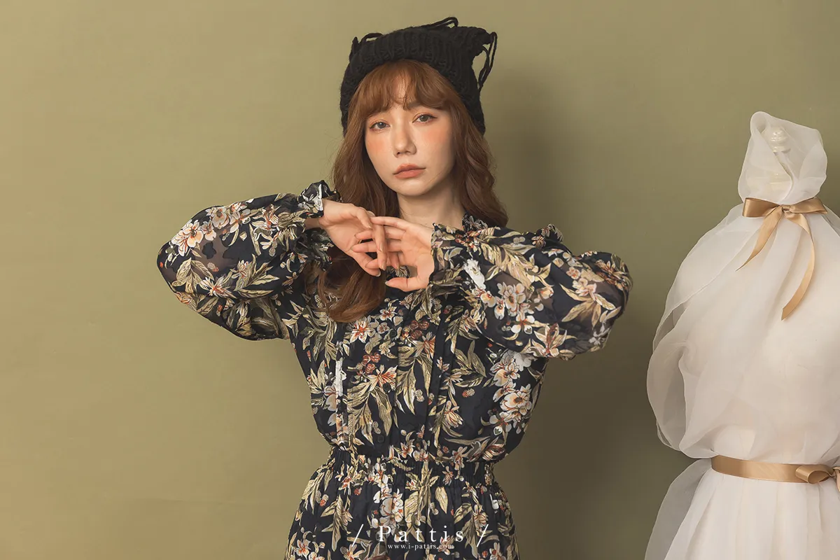 三月兔的秘密協定 | 素描印花浮雕壓摺上衣+蛋糕裙set(午夜黑藍)