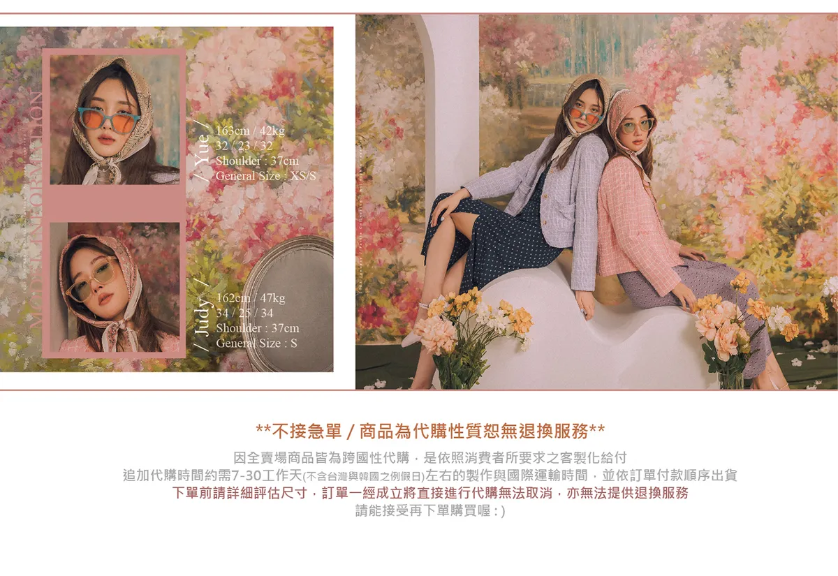 | 平量尺寸(cm) | 全長 | (一字)肩寬 | 胸寬 | 腰寬 | 臀寬 | 下擺寬 | 袖長(至領口) | 袖口寬 | 上臂寬 | 腋寬 | 材質 | 內襯 | 穿脫方式 | Memo |