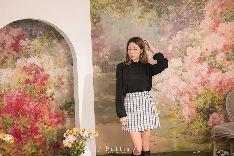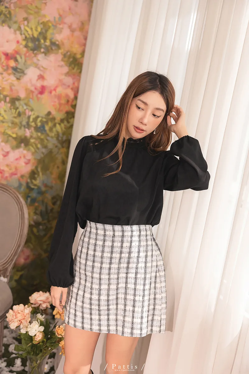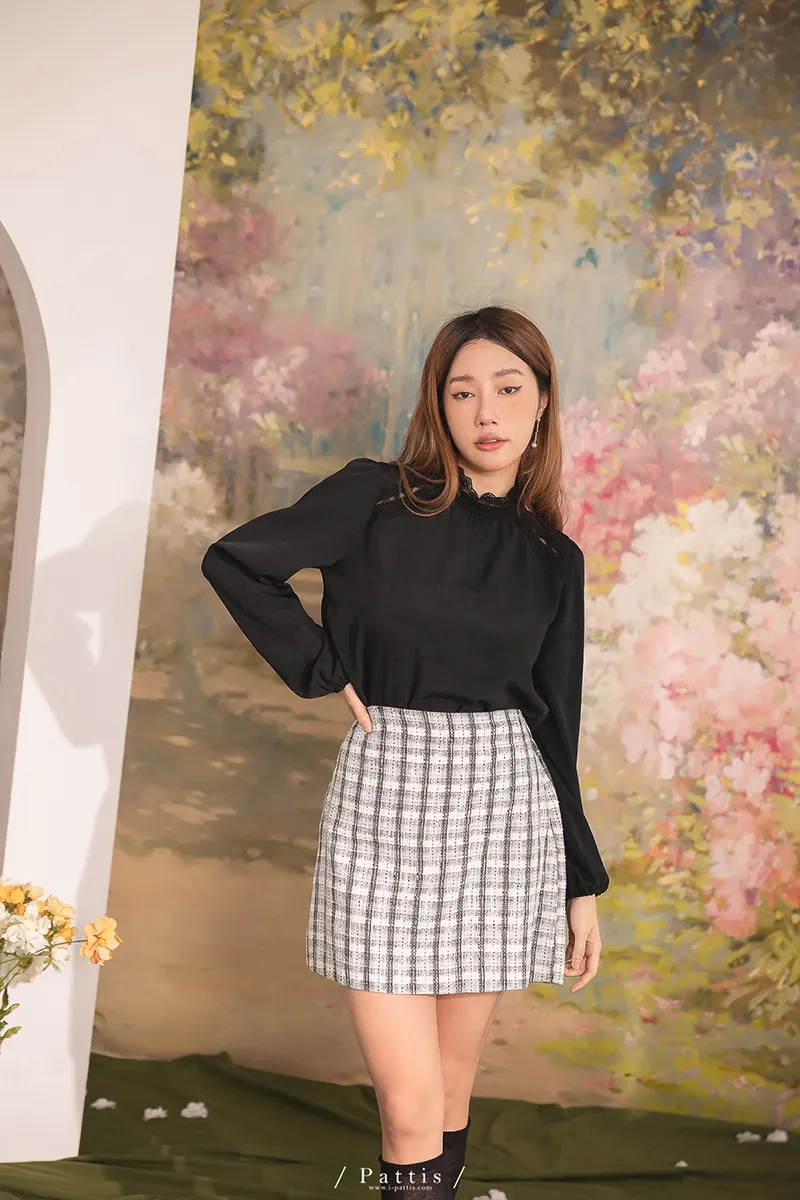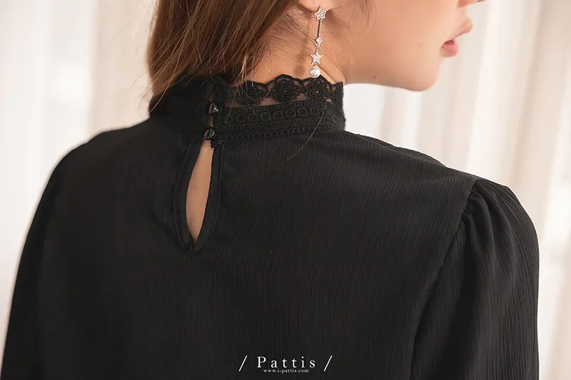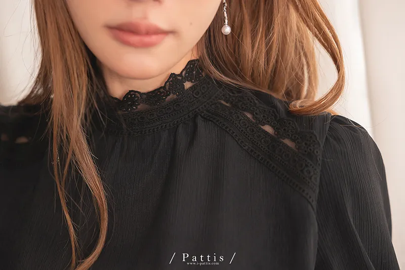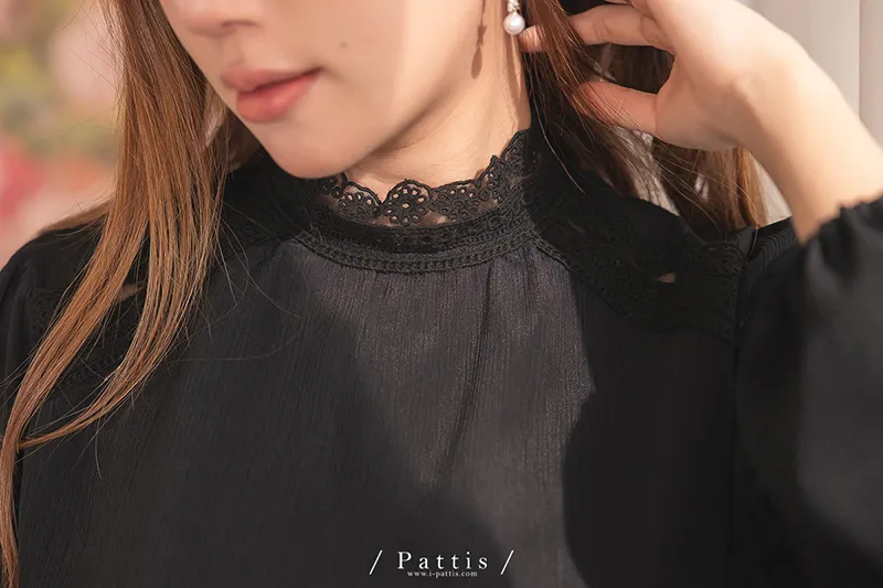 頸間的捉迷藏 | 圈圈蕾絲拼接縐褶感上衣(黑)