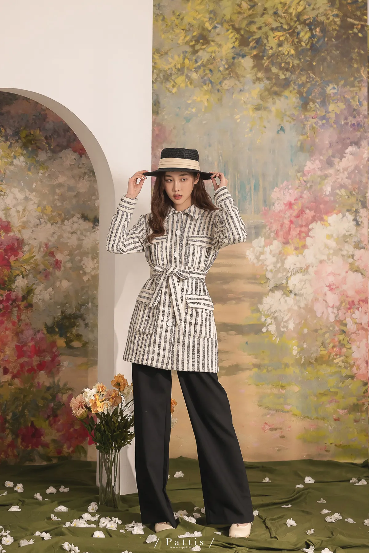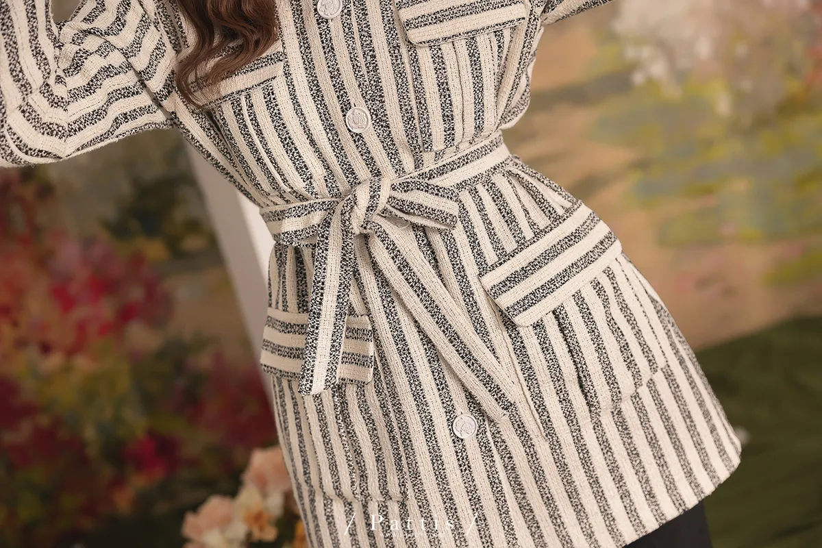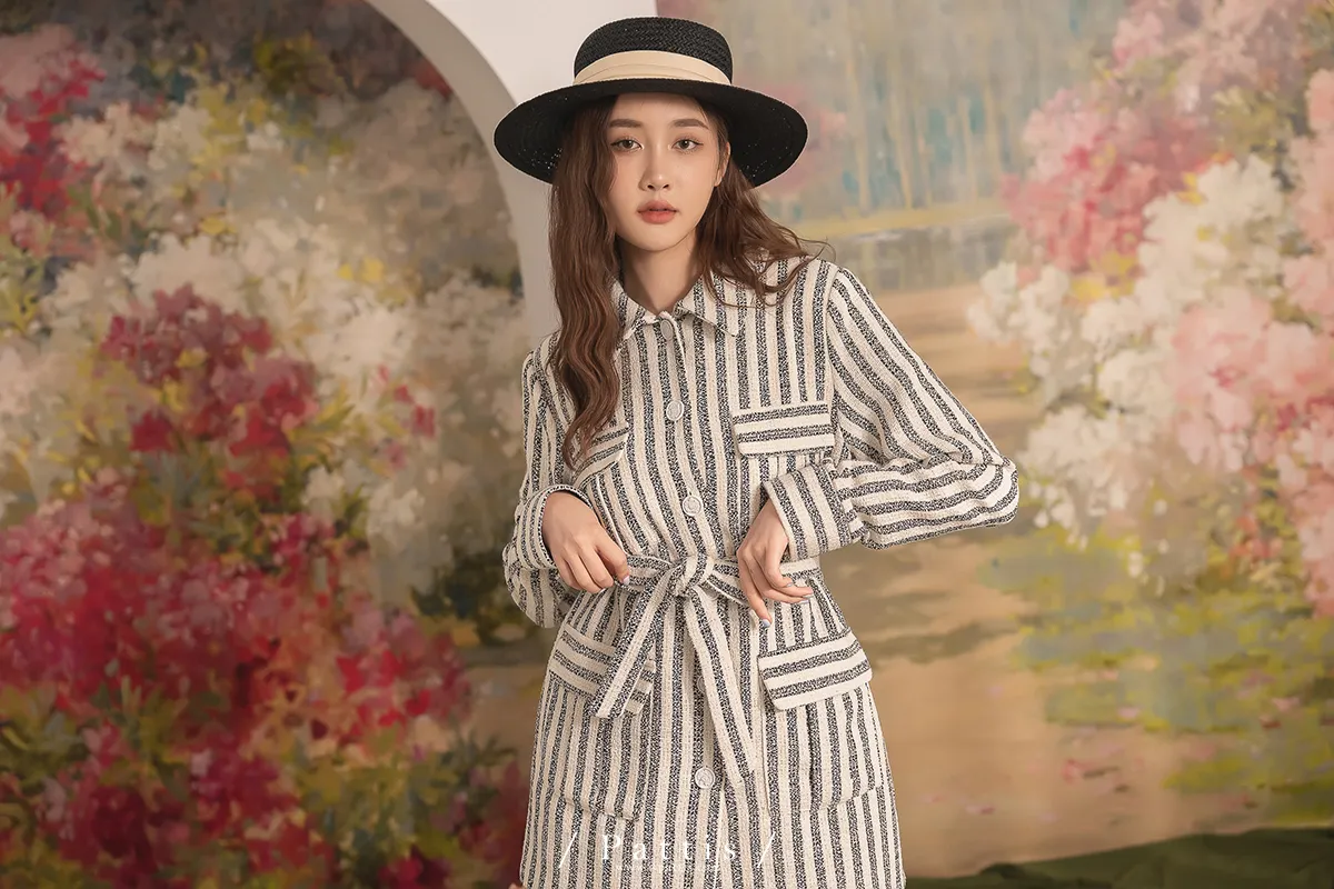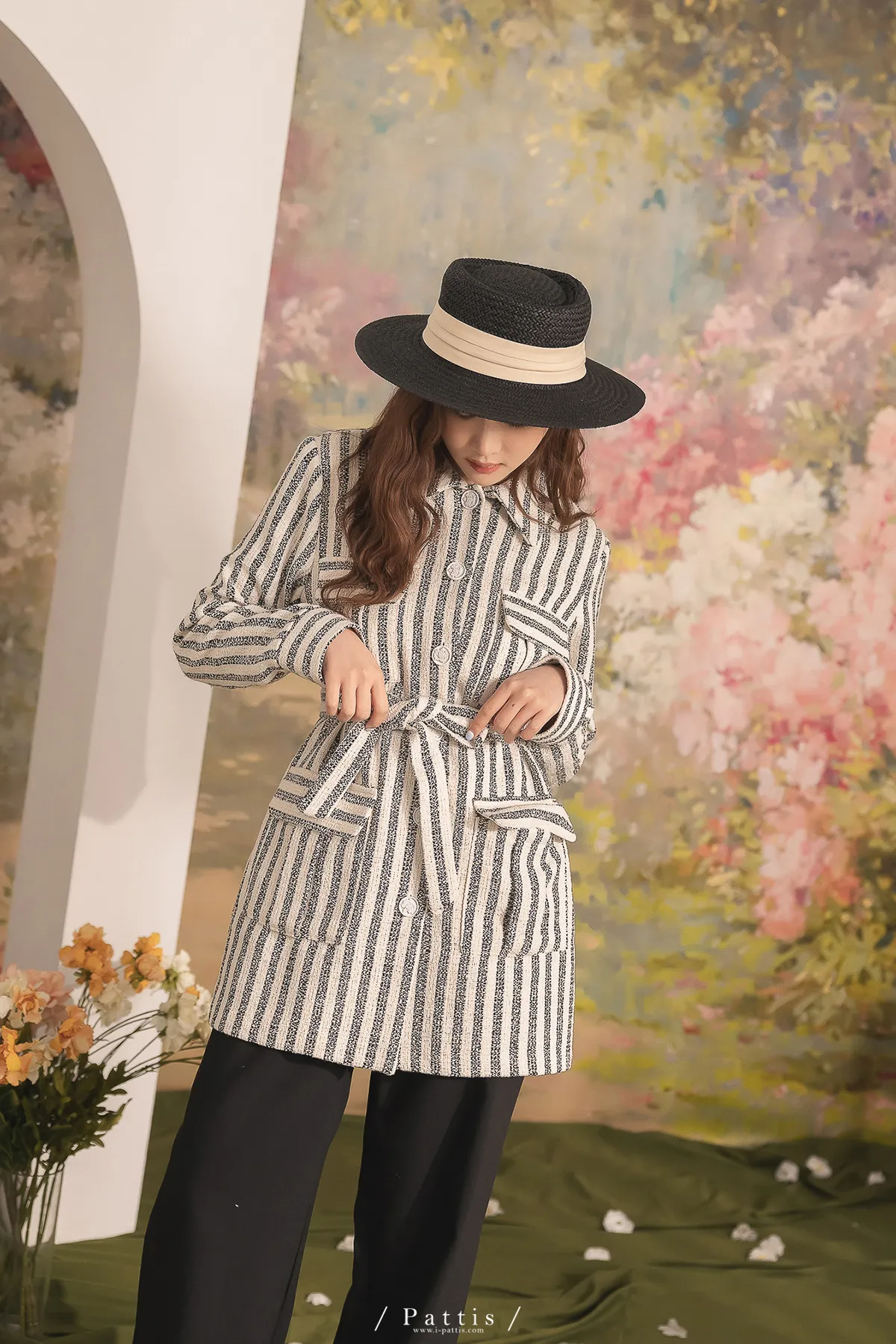 拿破崙條款 | 條紋軟毛呢繫帶風衣短洋裝(米白)