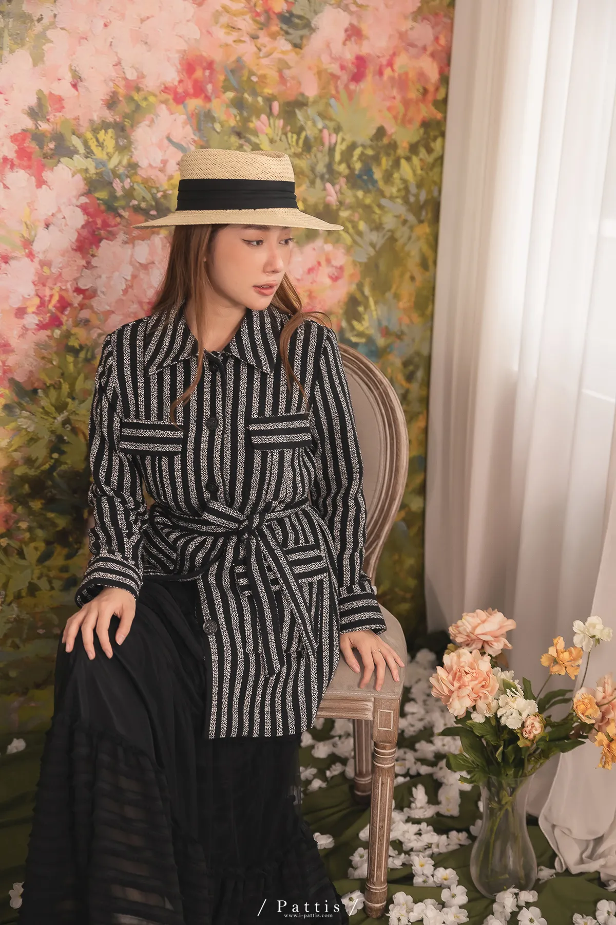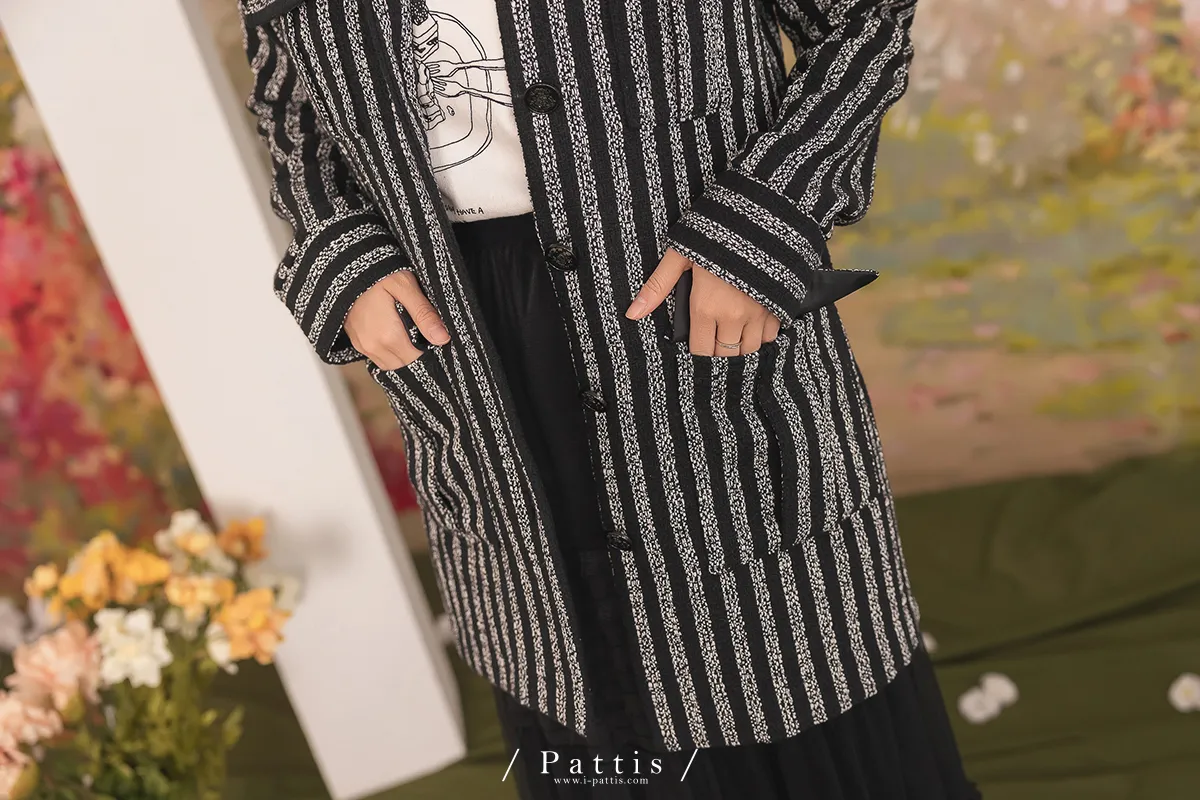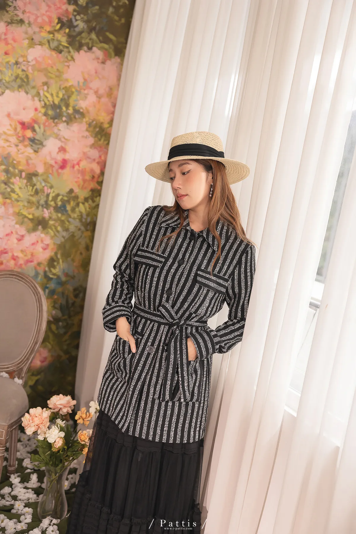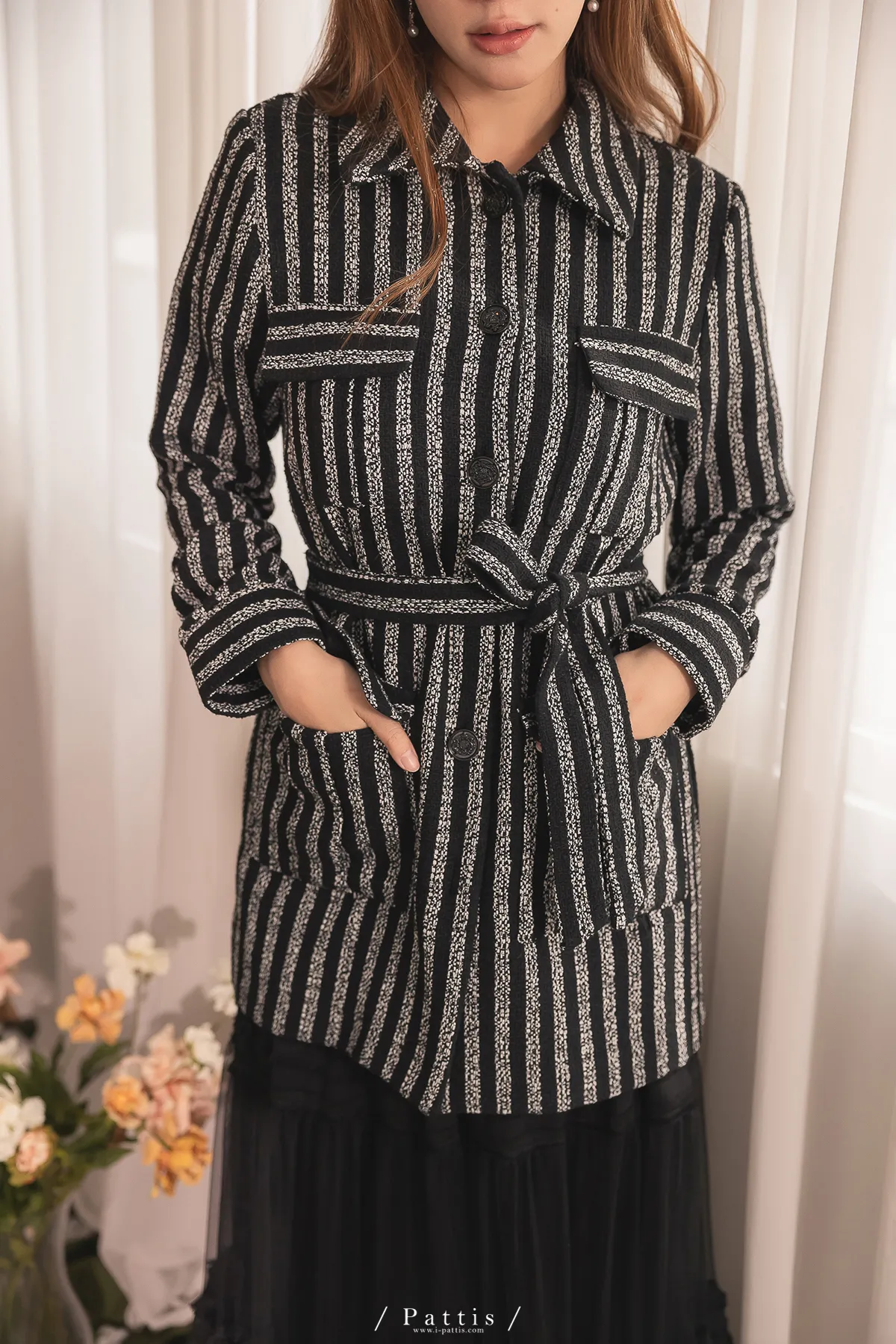 拿破崙條款 | 條紋軟毛呢繫帶風衣短洋裝(灰黑)