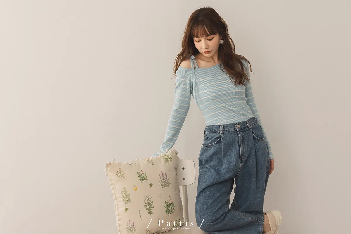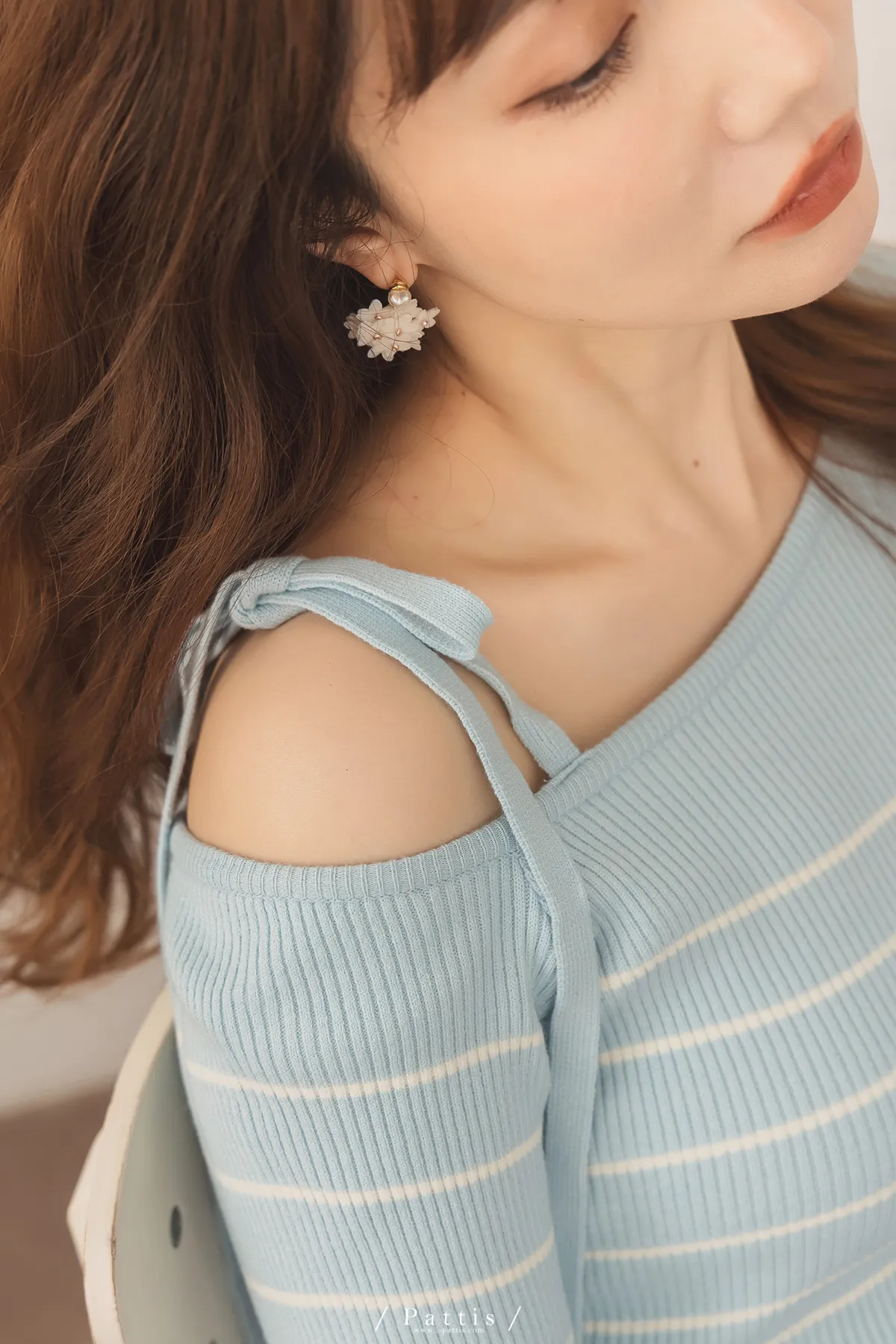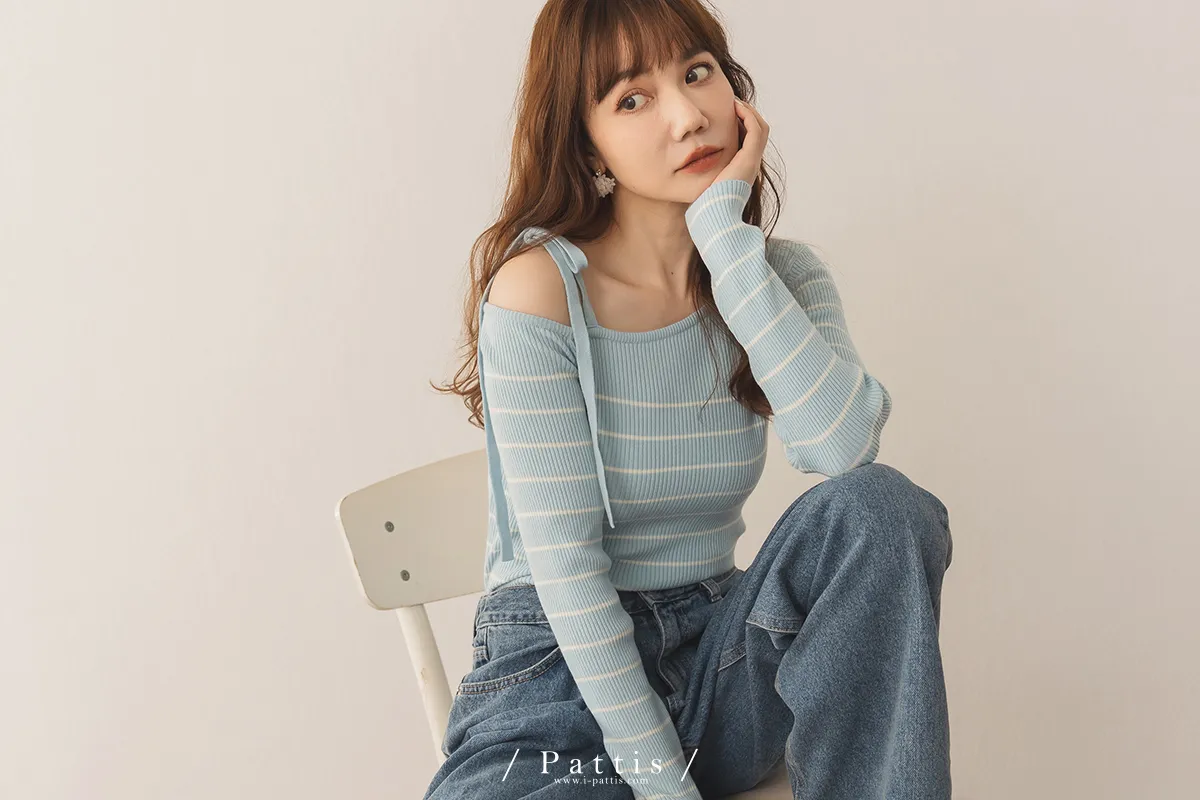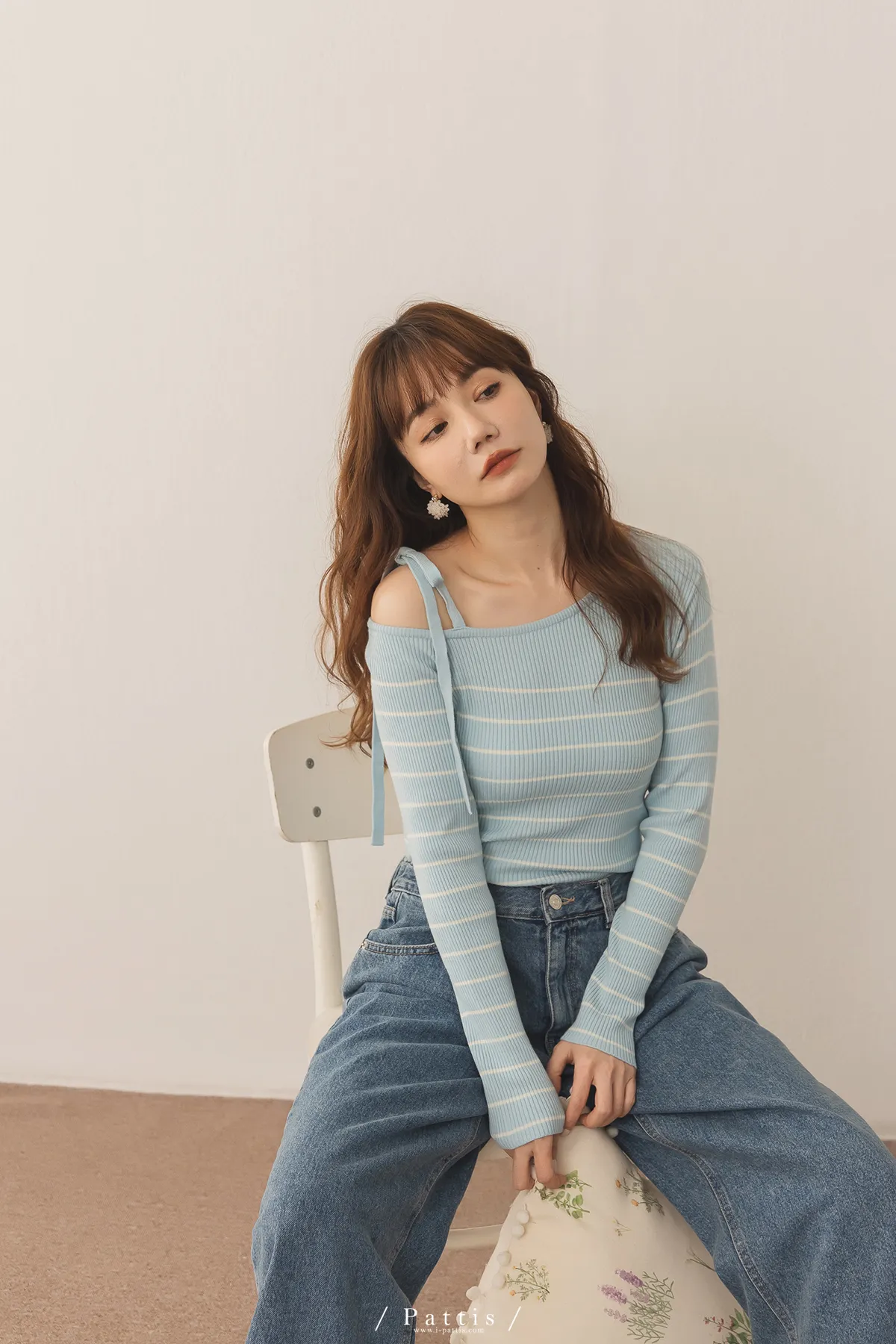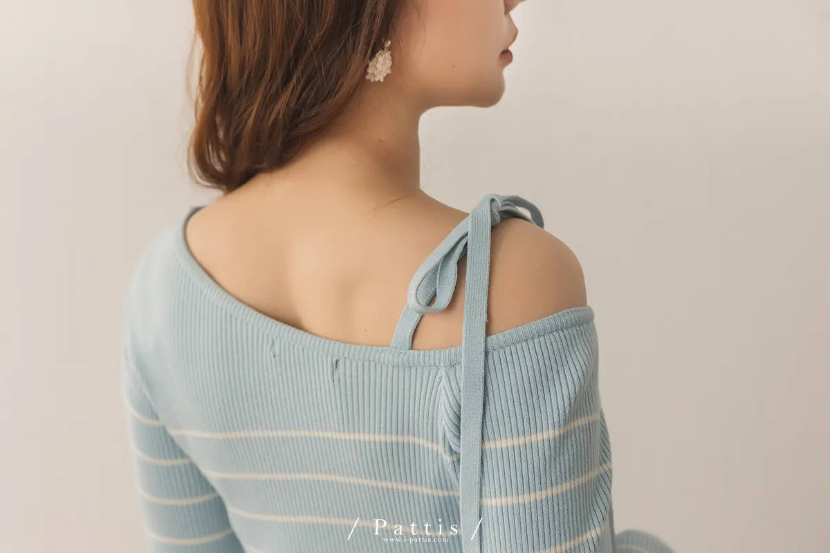 (現貨) 清晨的右肩吻 | 斜邊條紋蝴蝶結針織上衣(藍)