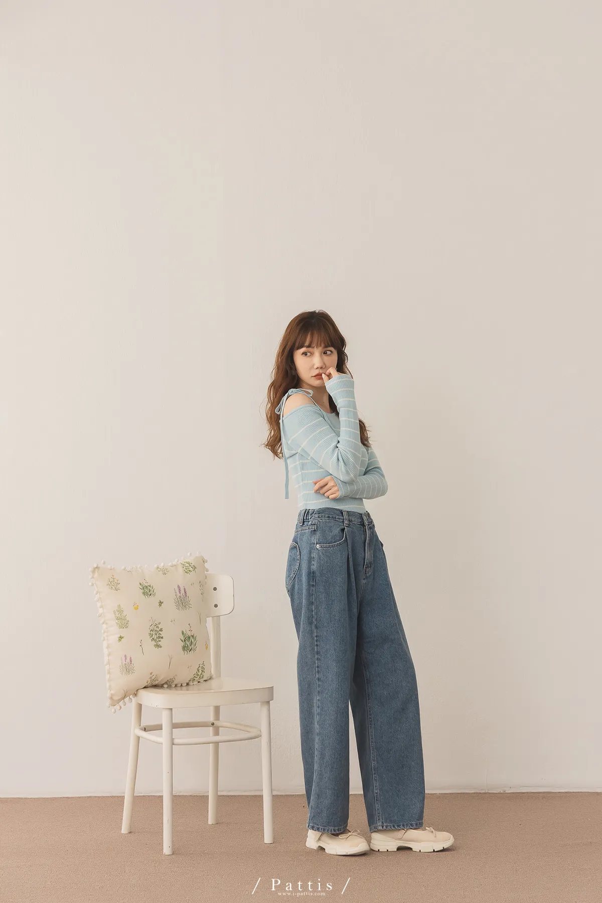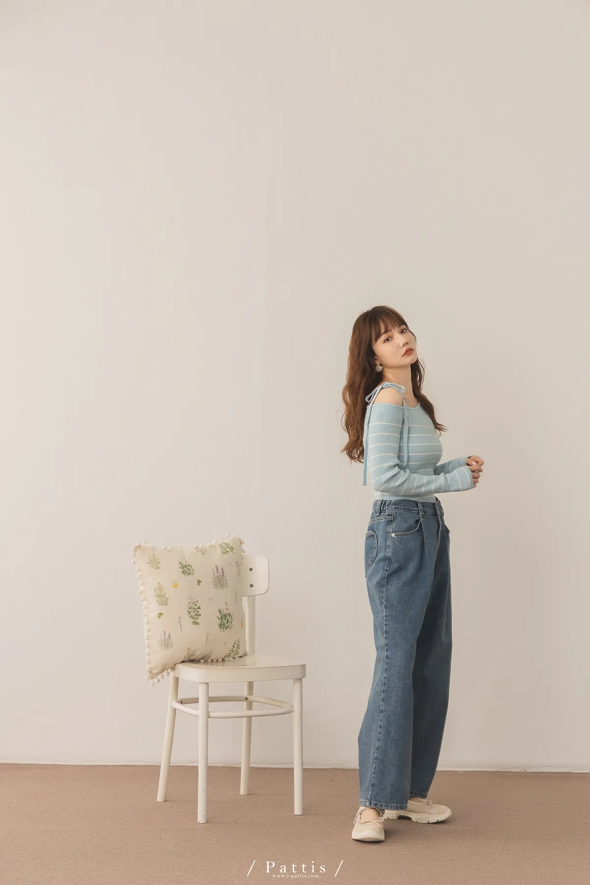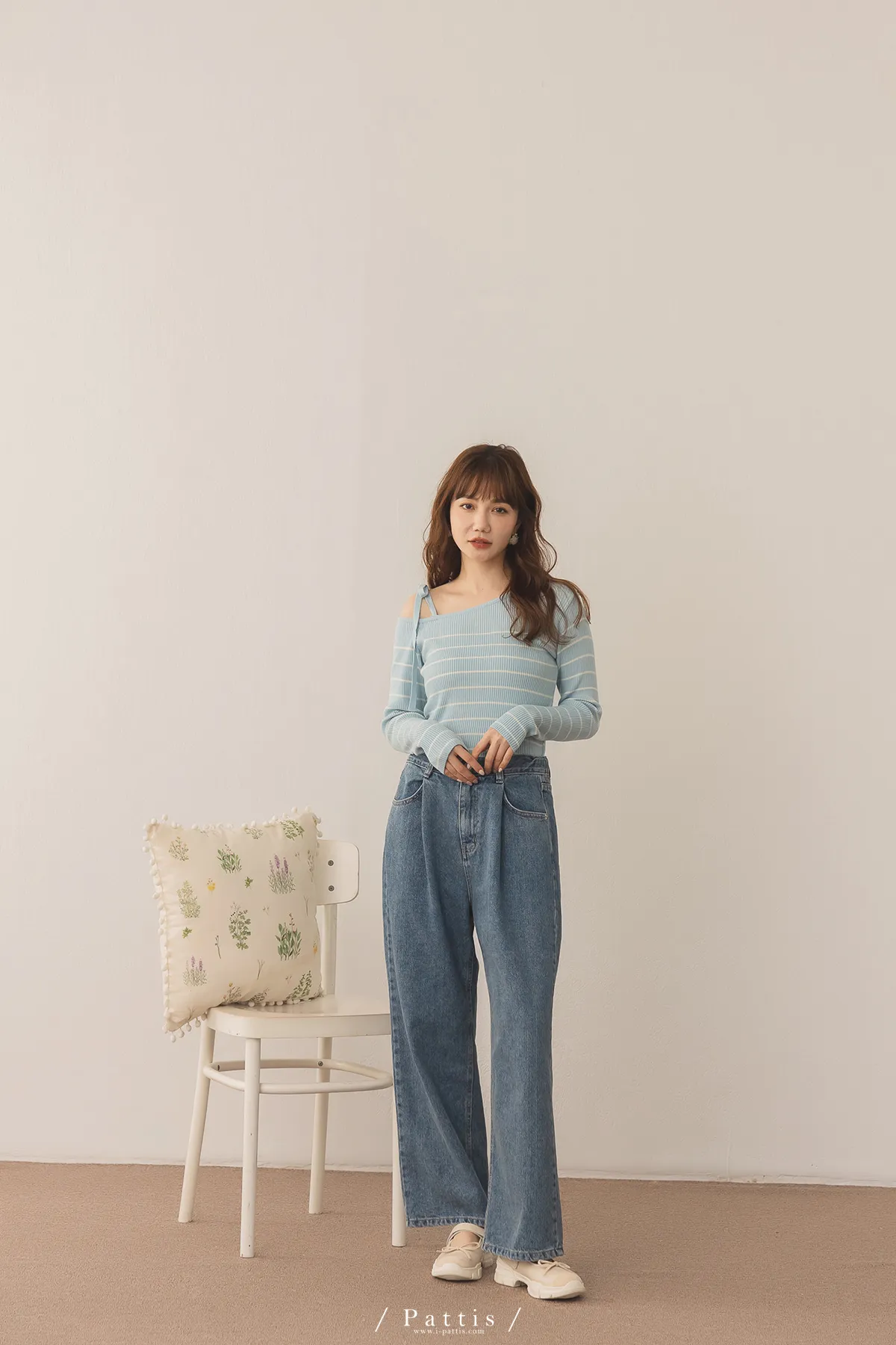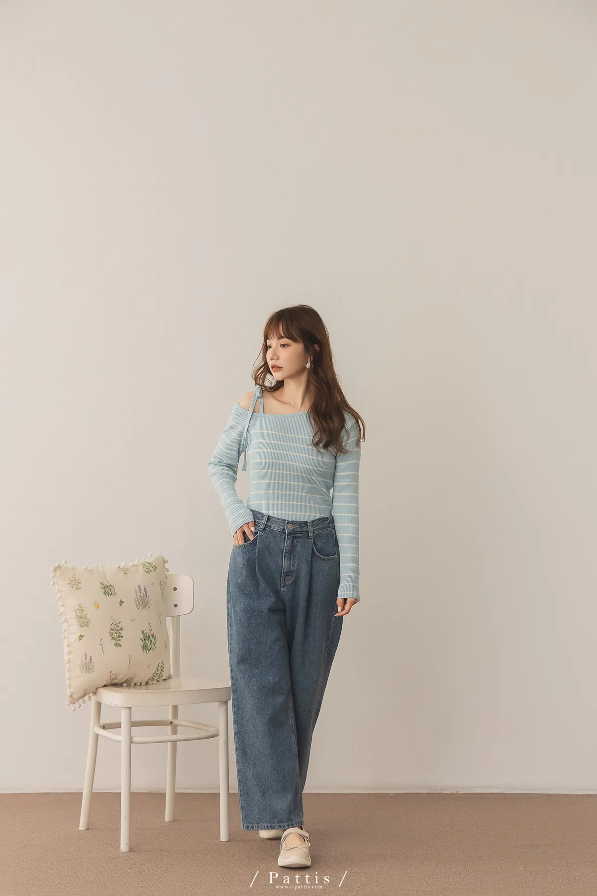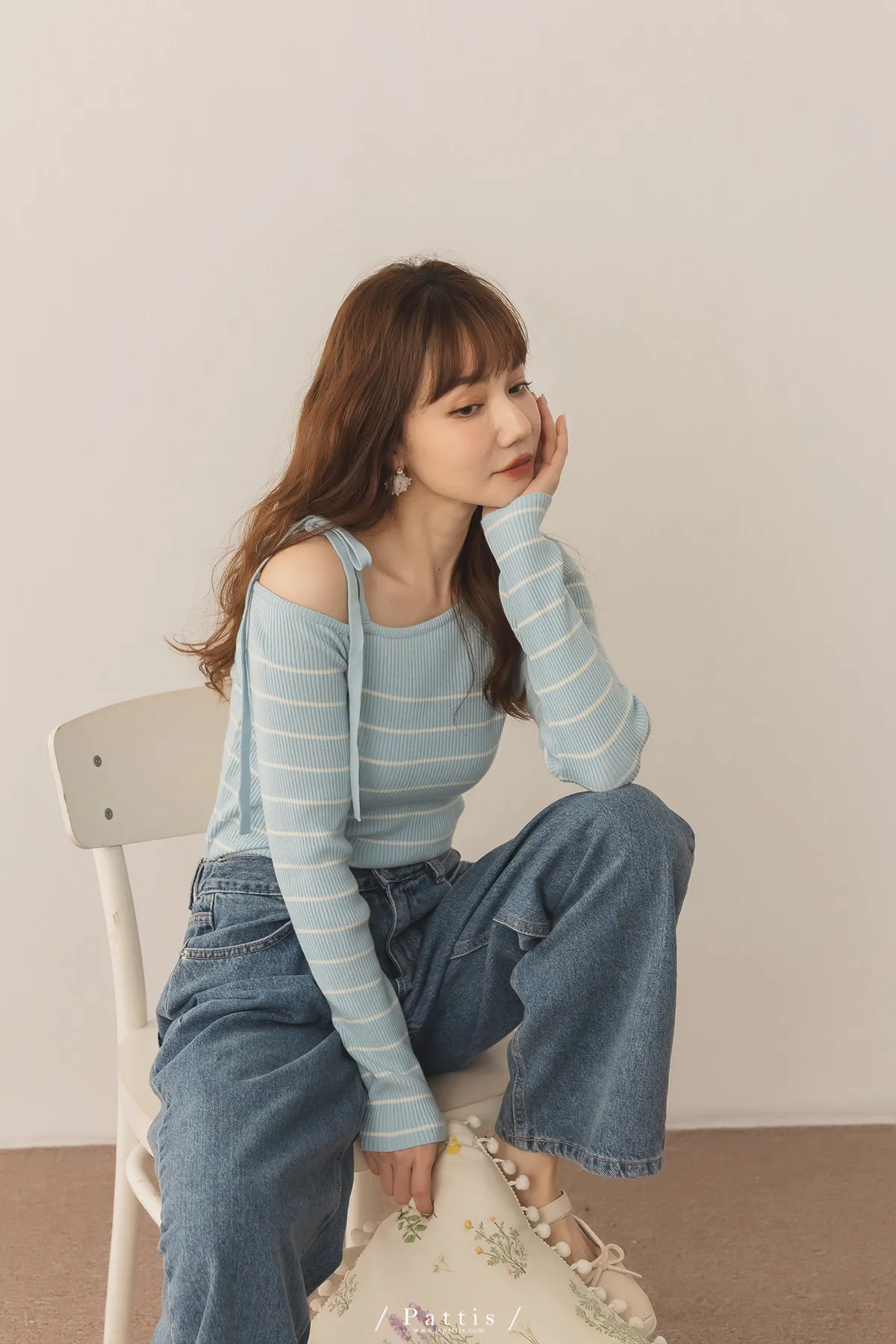 (現貨) 清晨的右肩吻 | 斜邊條紋蝴蝶結針織上衣(藍)