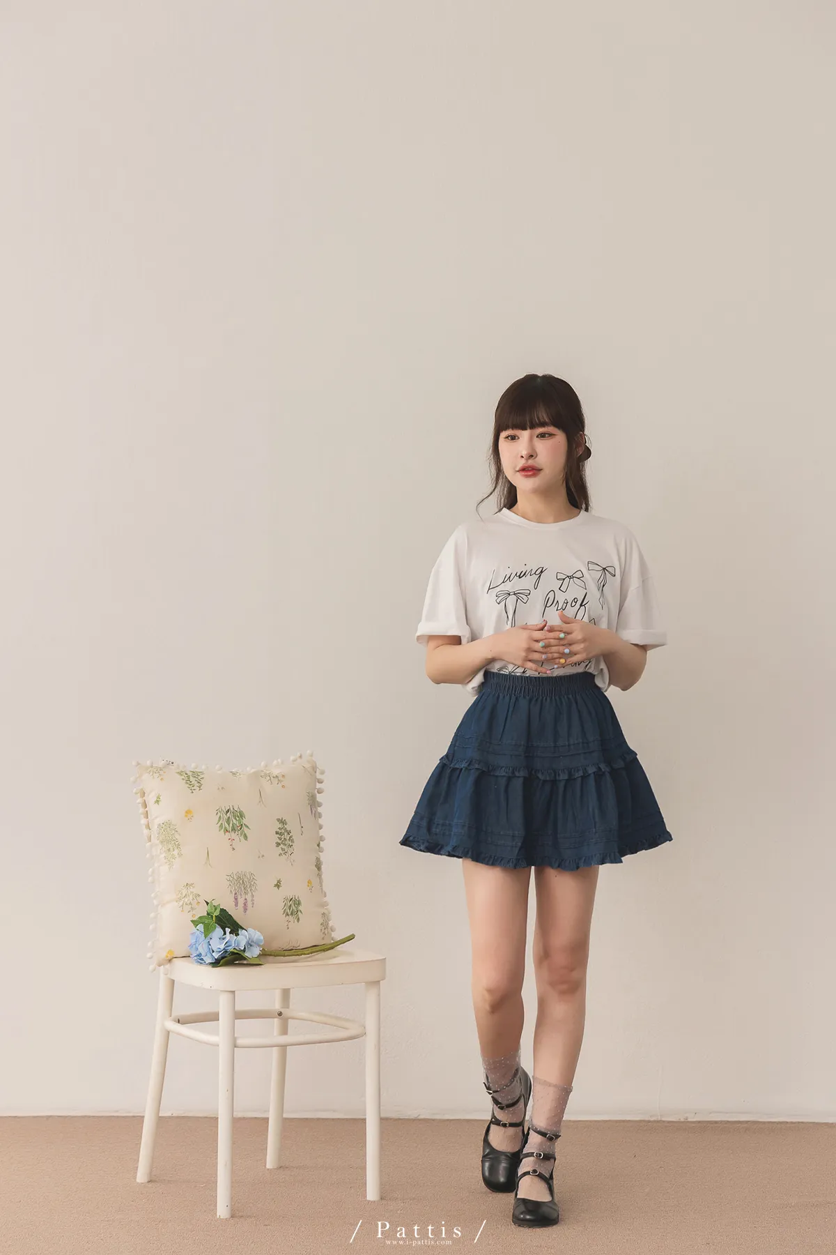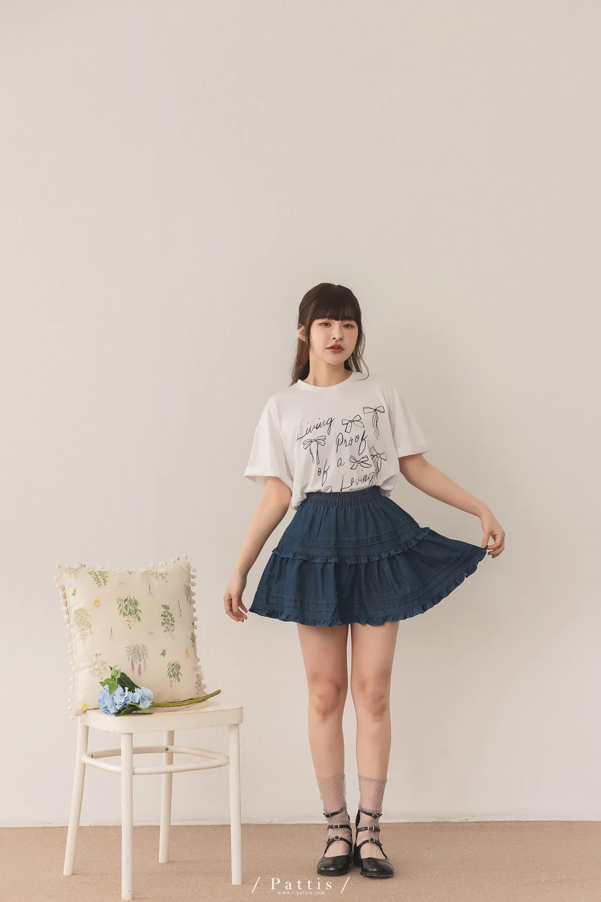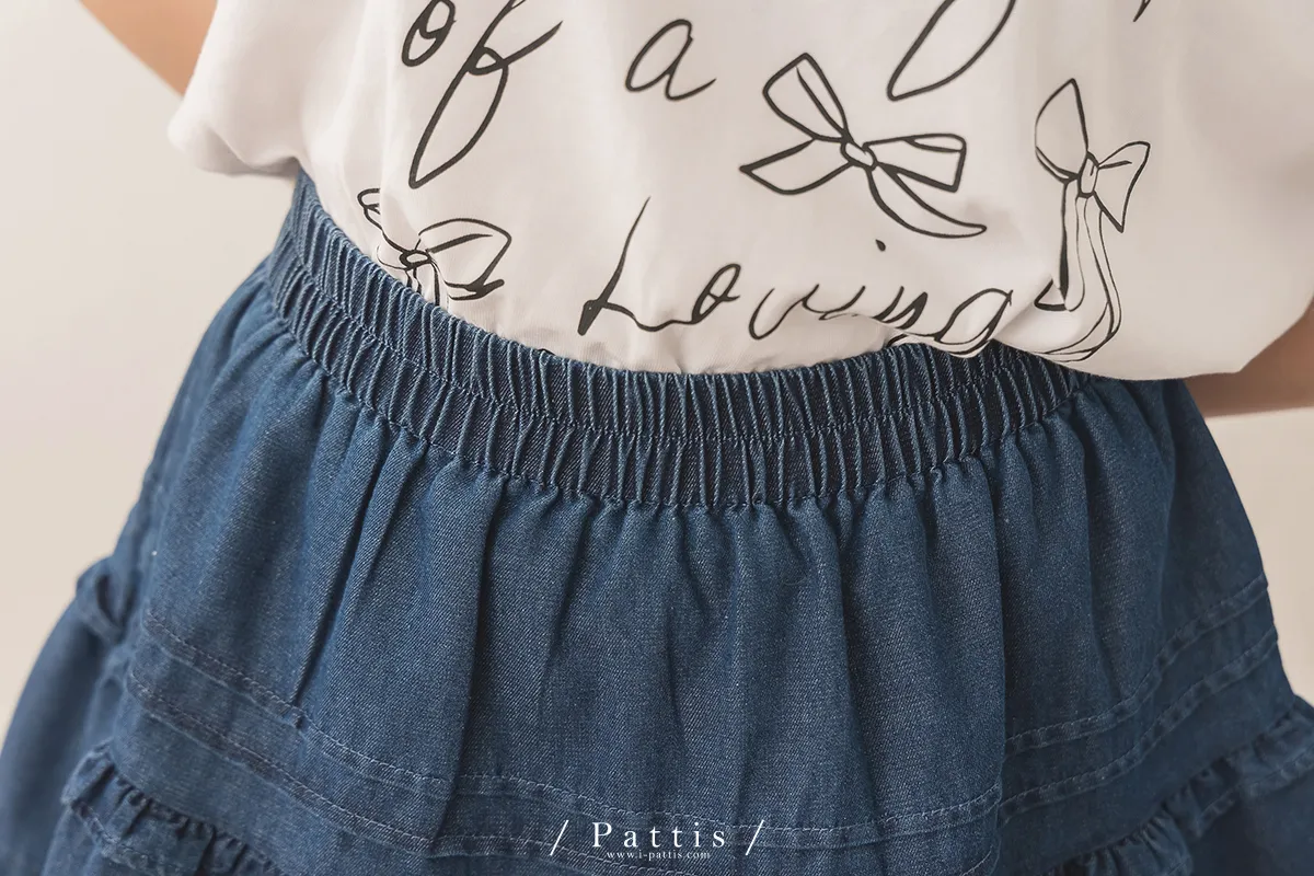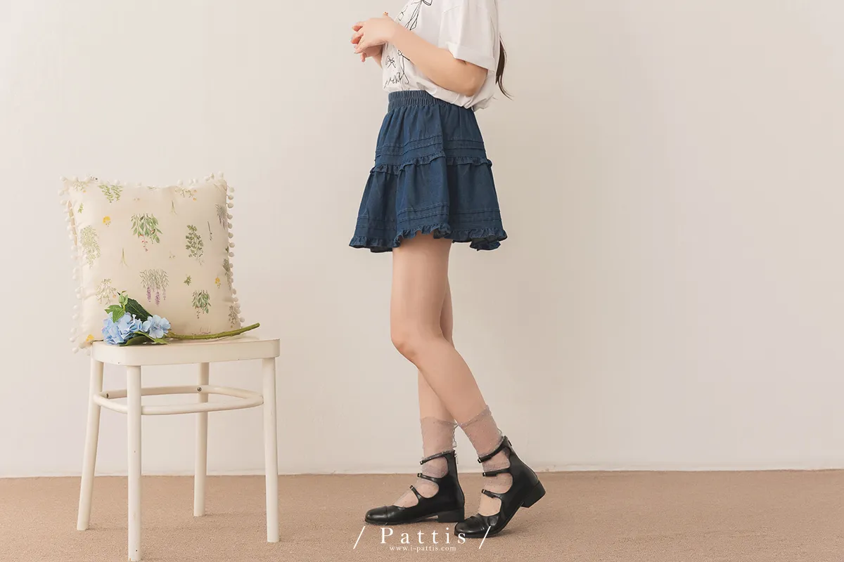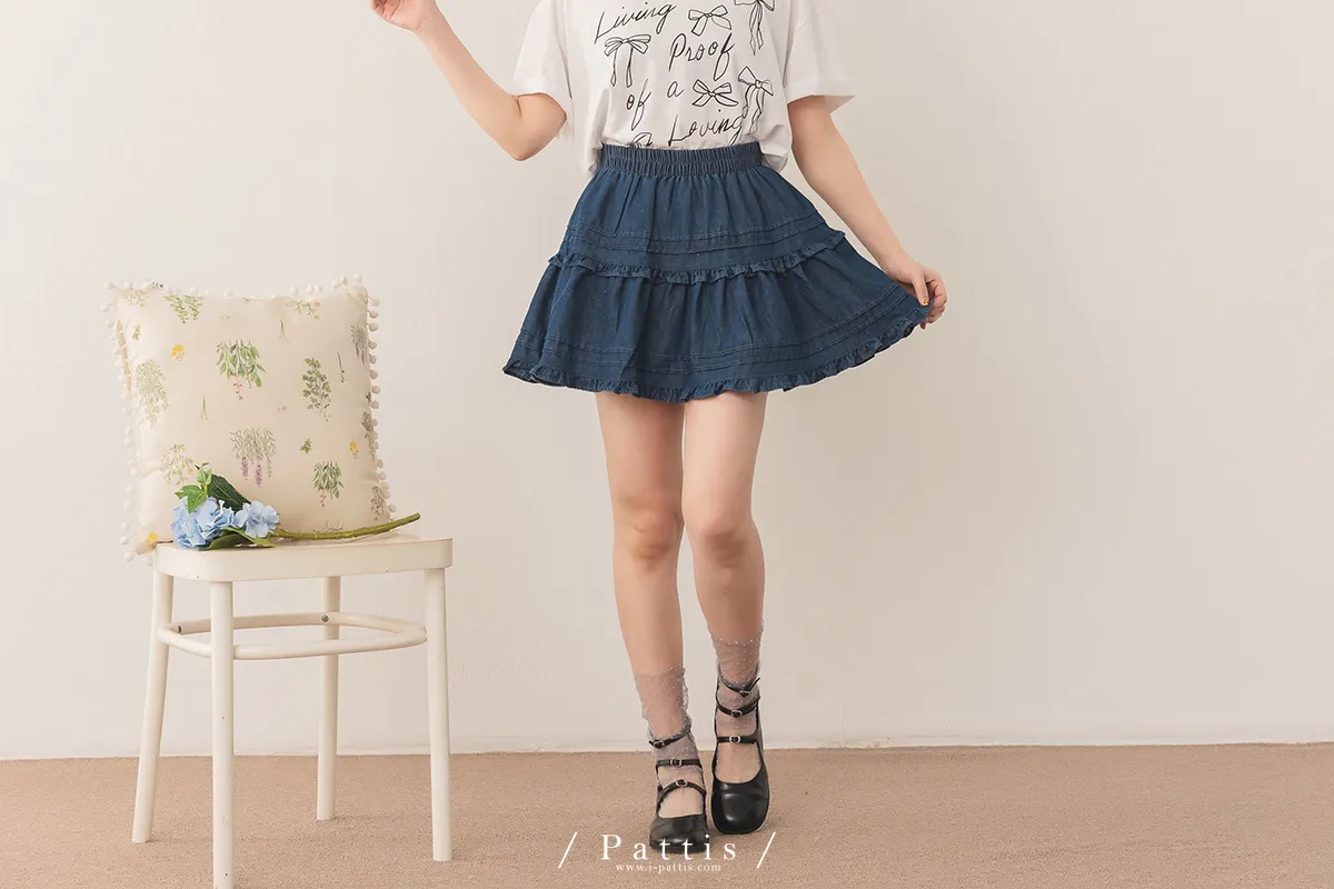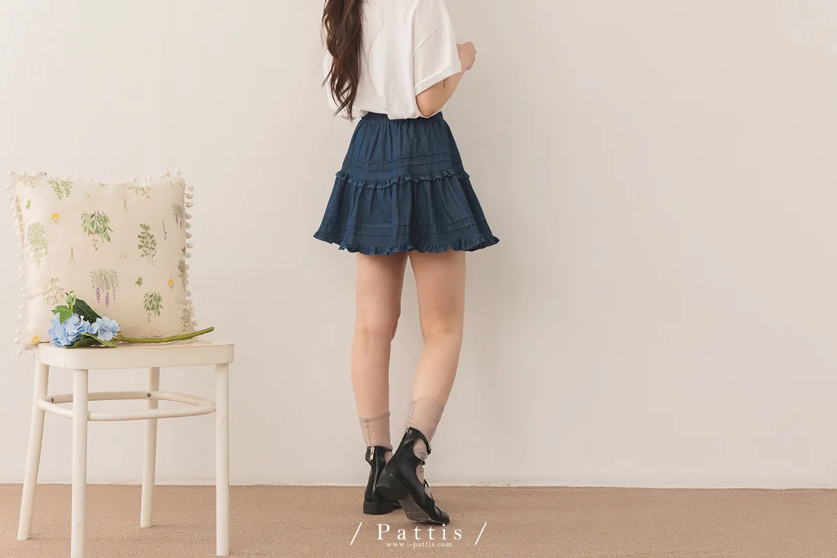 (現貨) 零時區 | 內短襯褲壓褶拼接荷葉丹寧短裙(深藍)