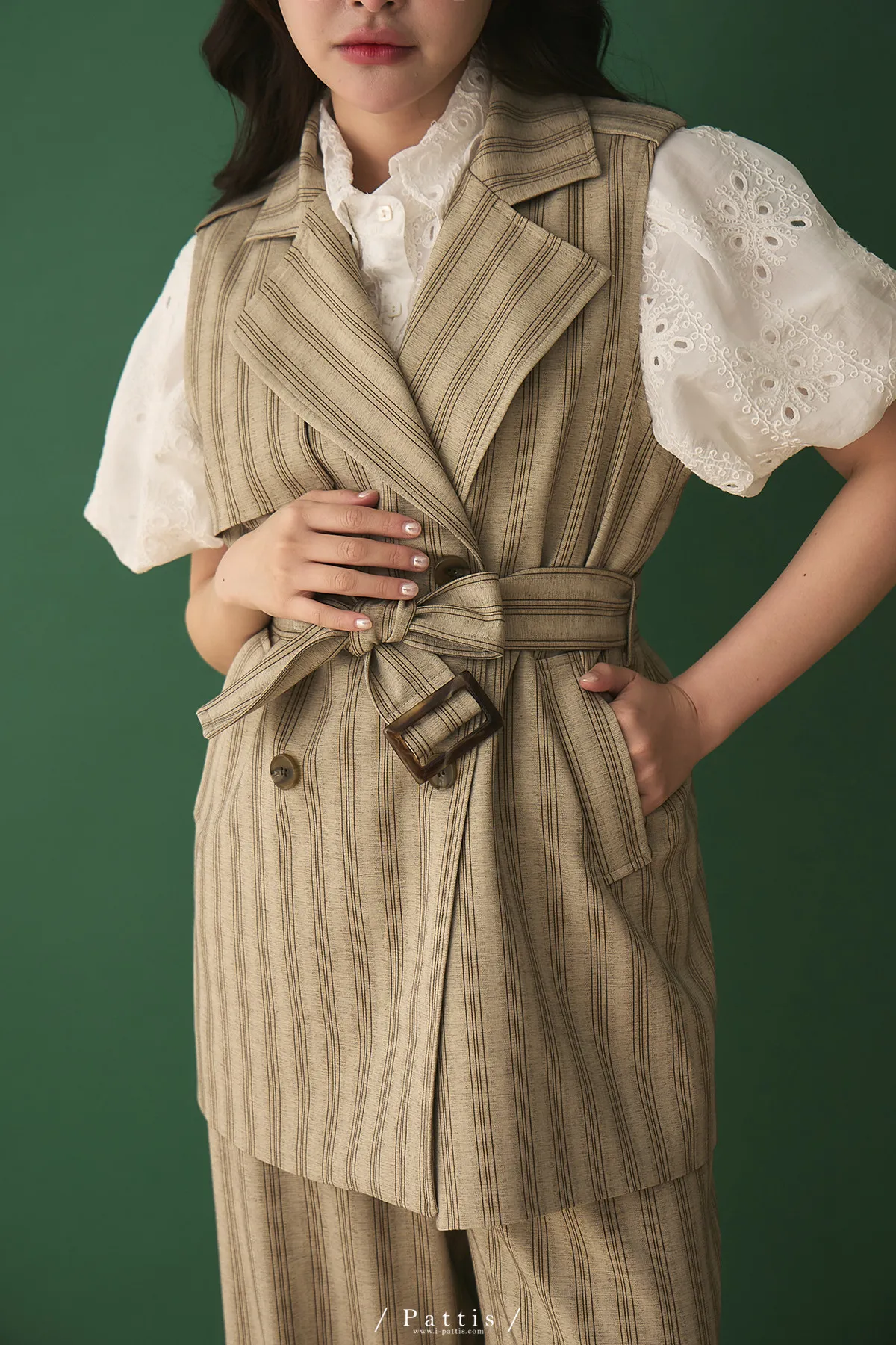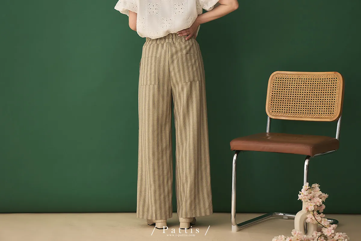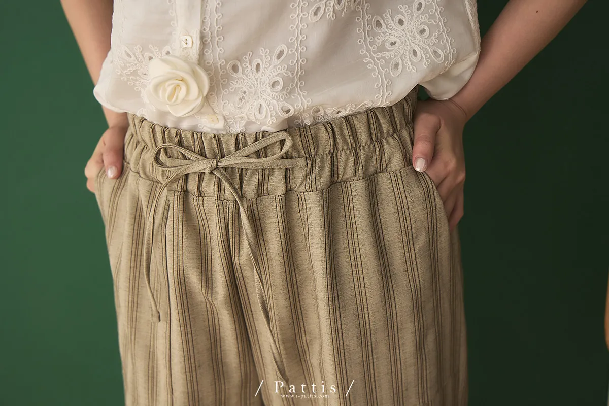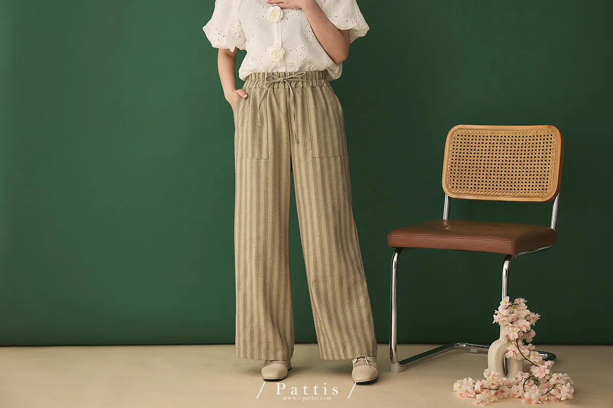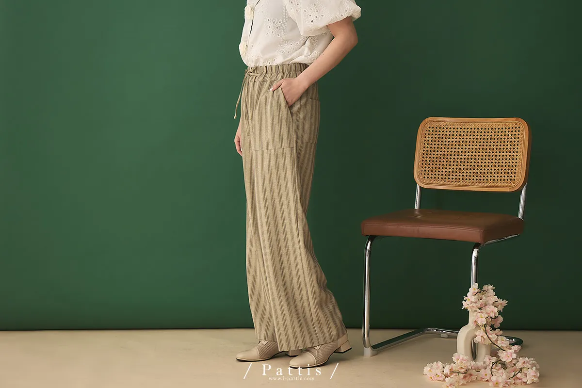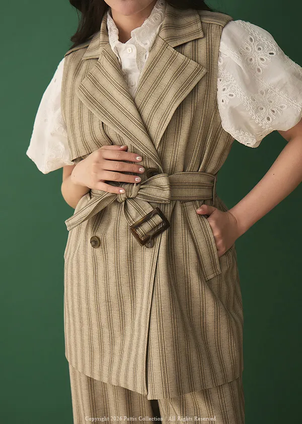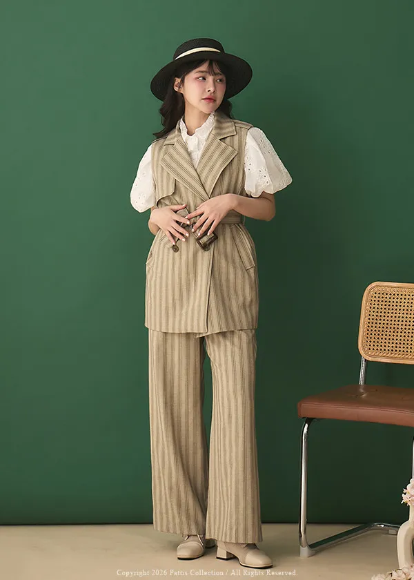 晨光帶點傲氣 | (可分售)條紋繫帶西裝背心+口袋綁帶寬褲set(米杏)