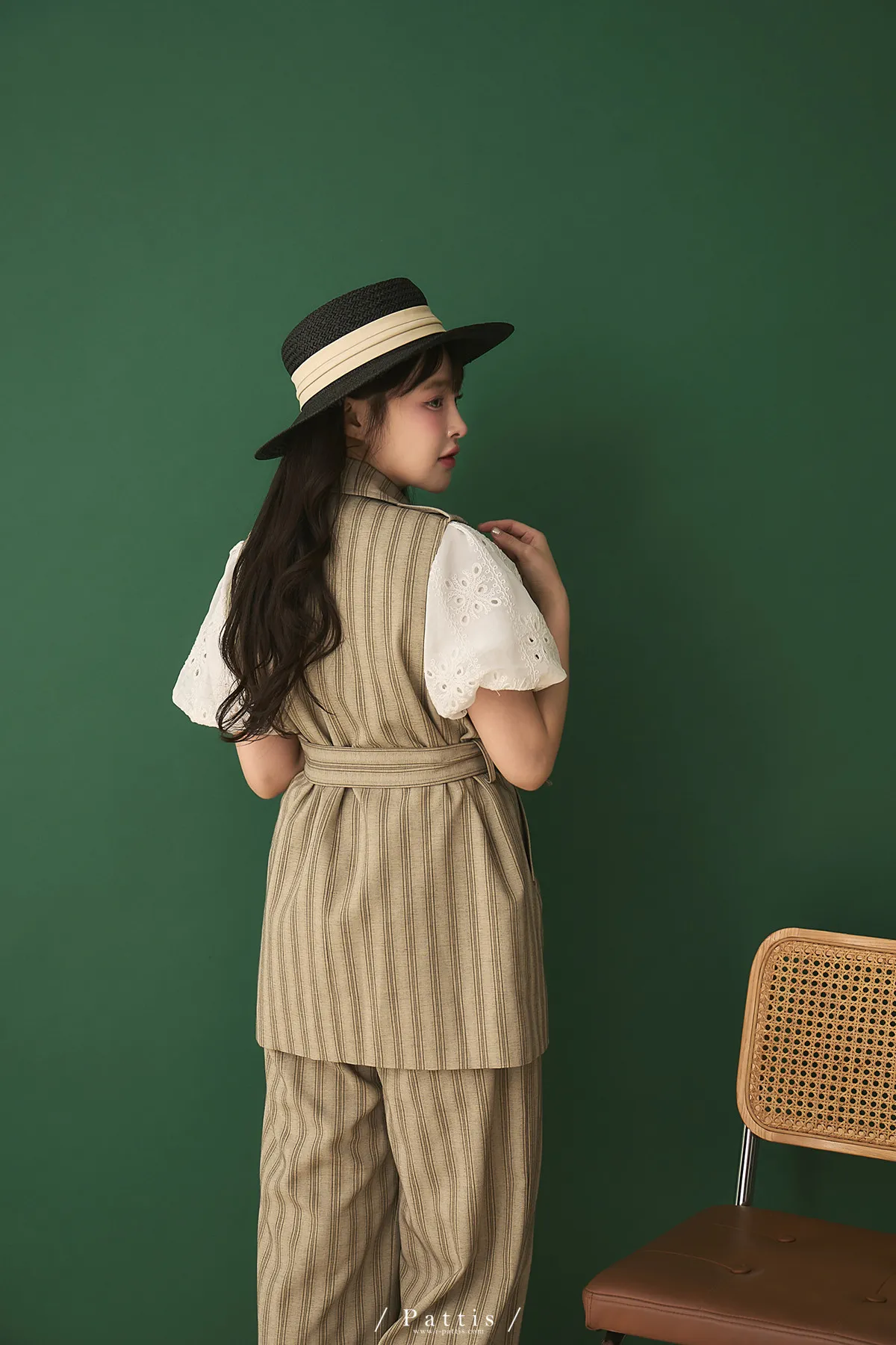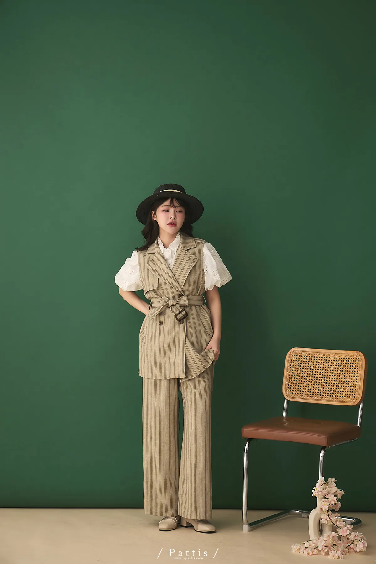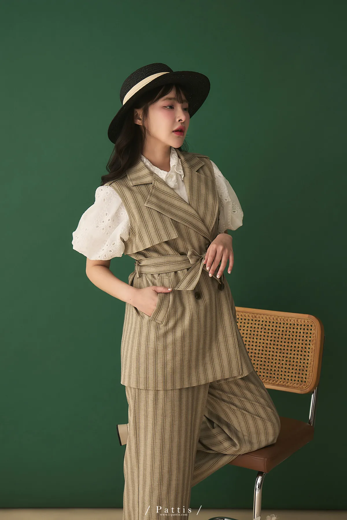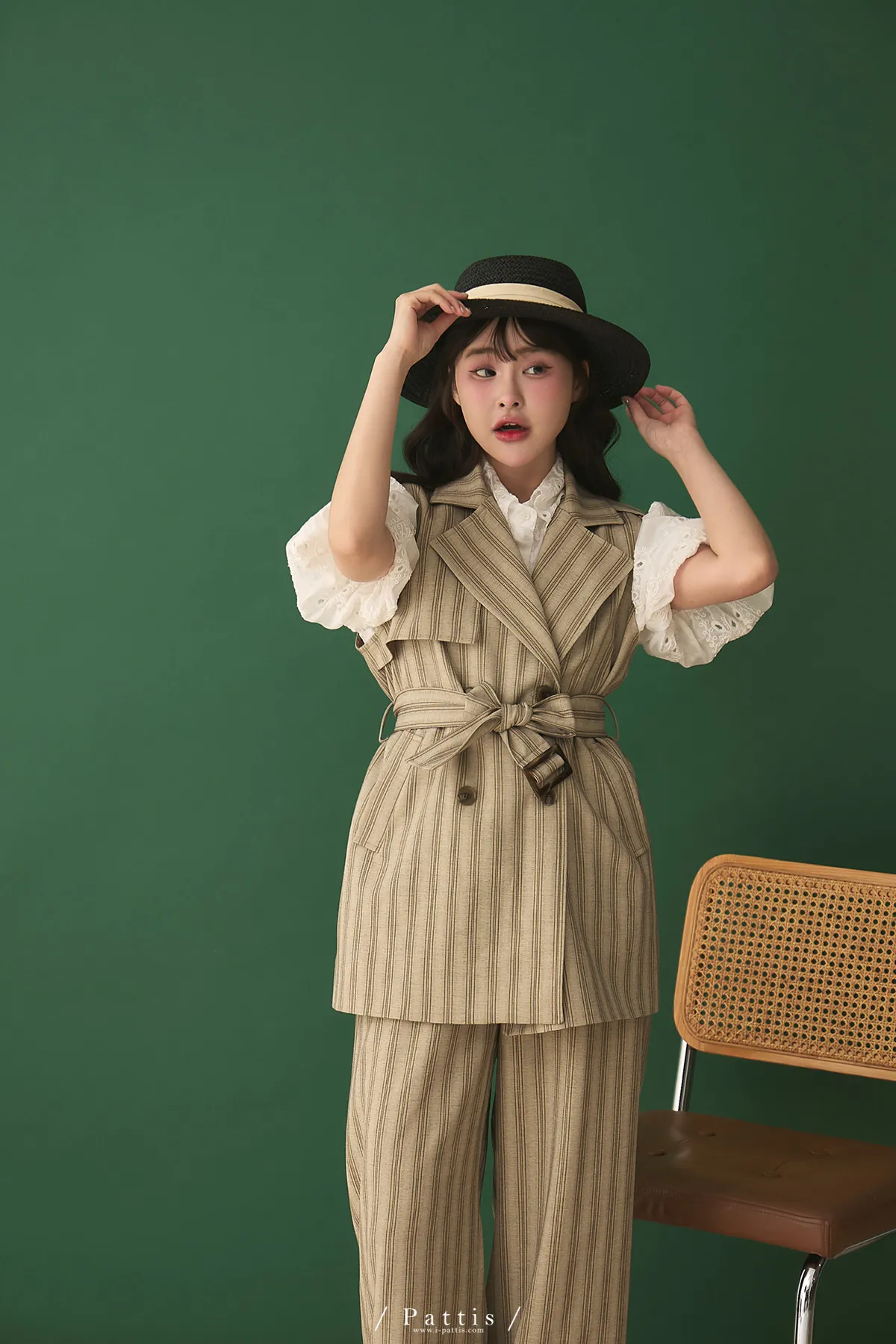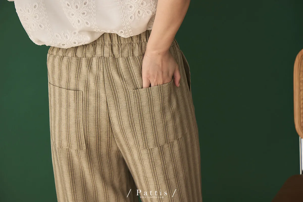 晨光帶點傲氣 | (可分售)條紋繫帶西裝背心+口袋綁帶寬褲set(米杏)