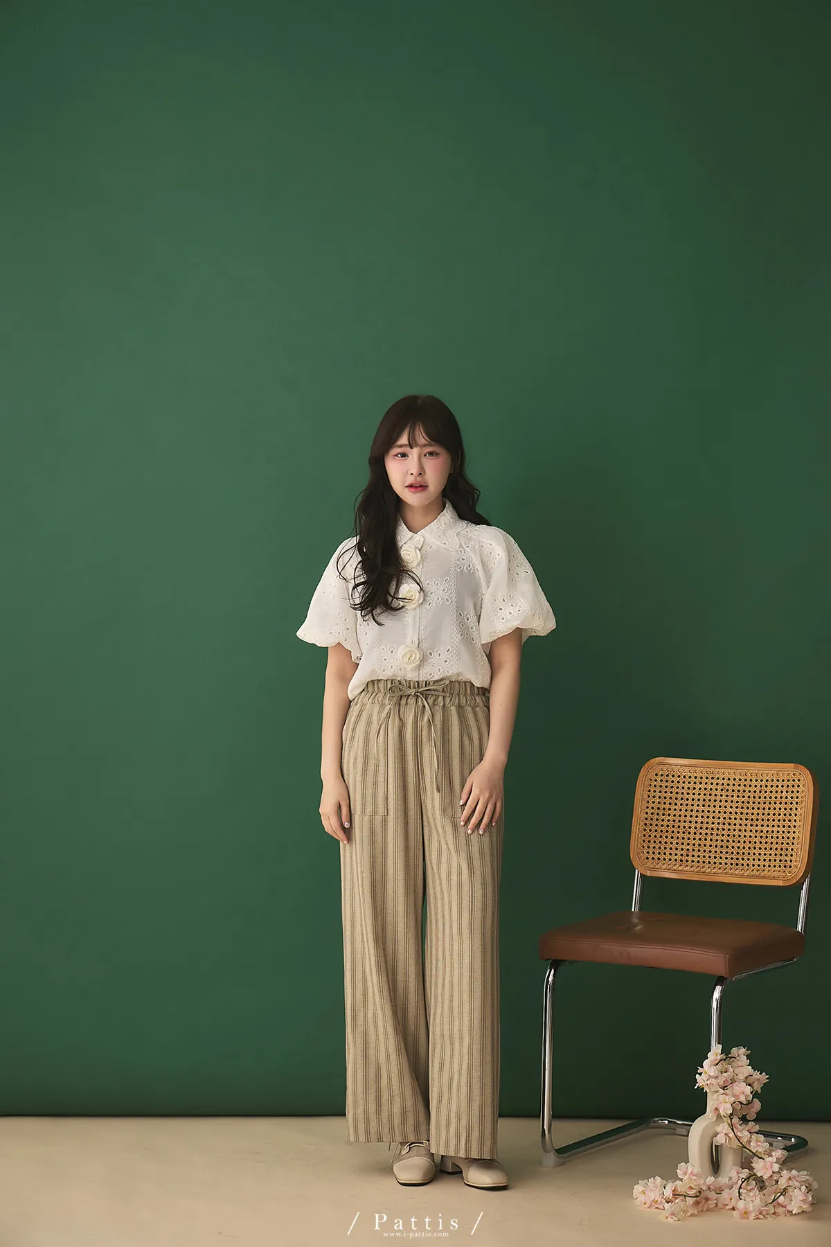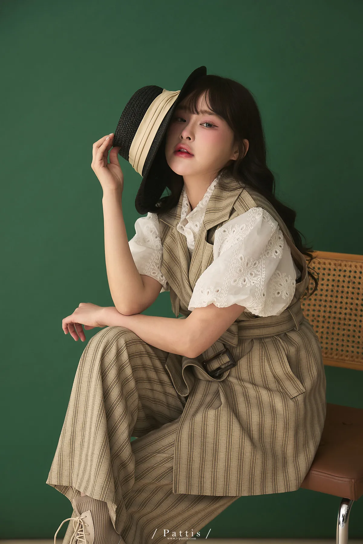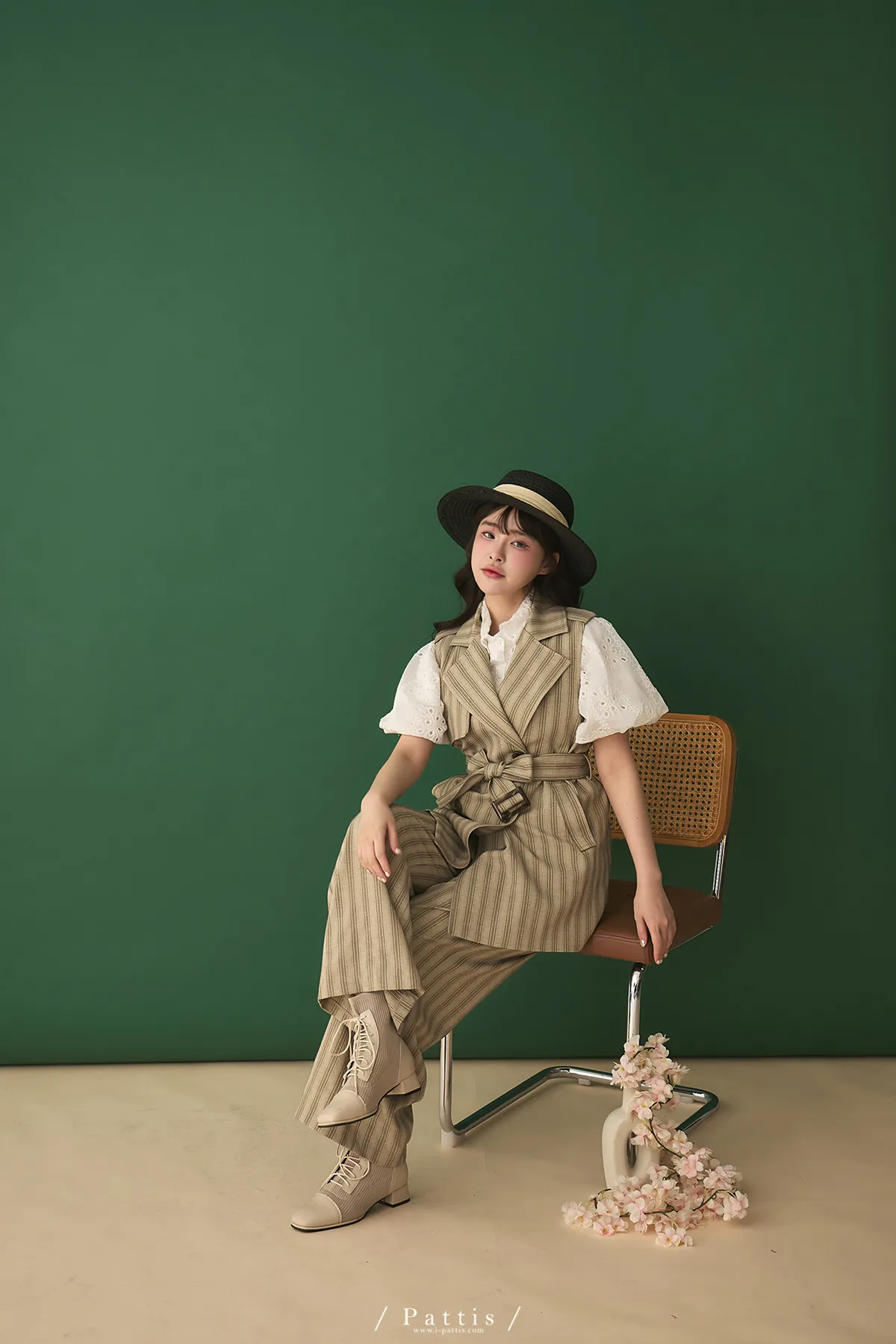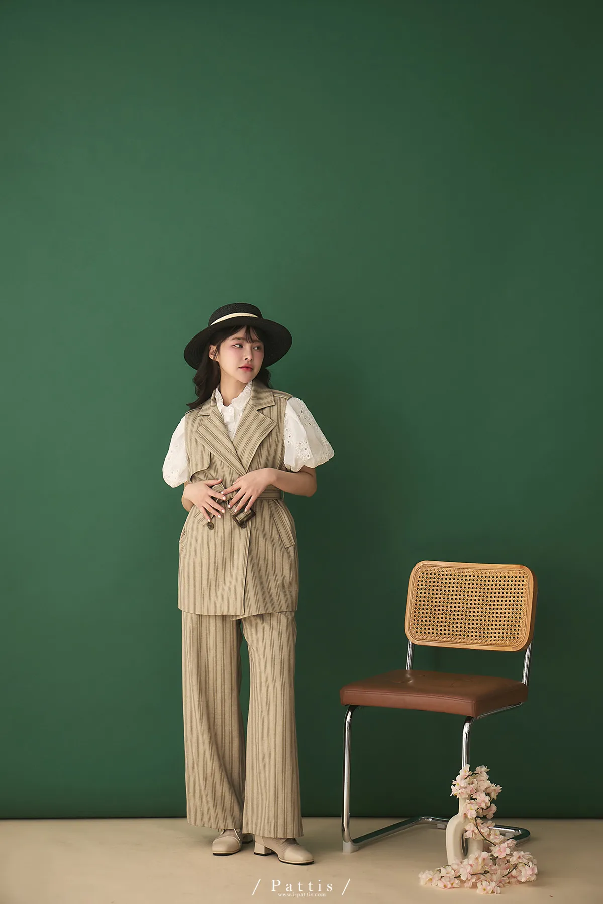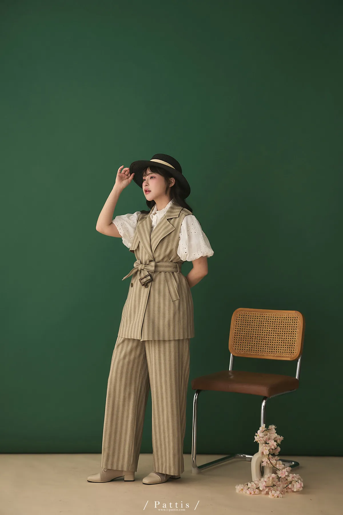 晨光帶點傲氣 | (可分售)條紋繫帶西裝背心+口袋綁帶寬褲set(米杏)