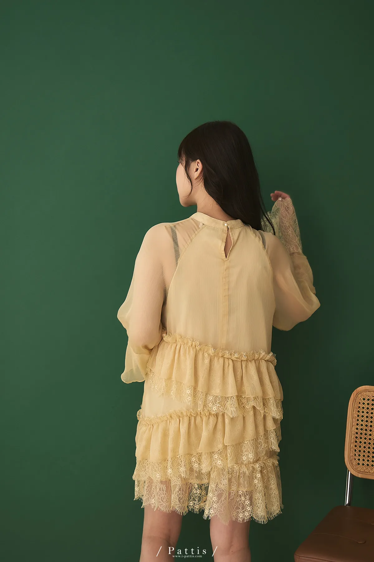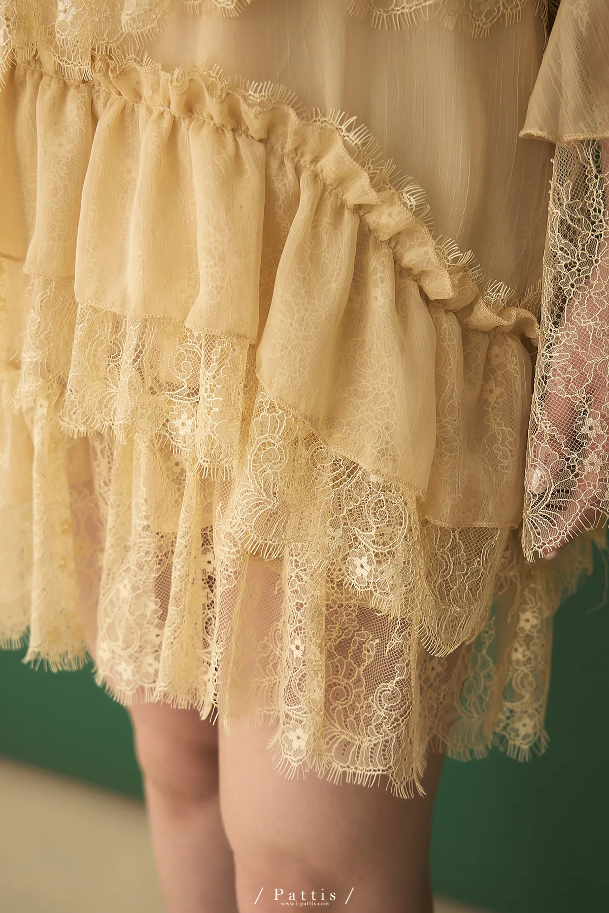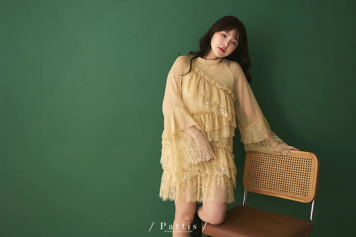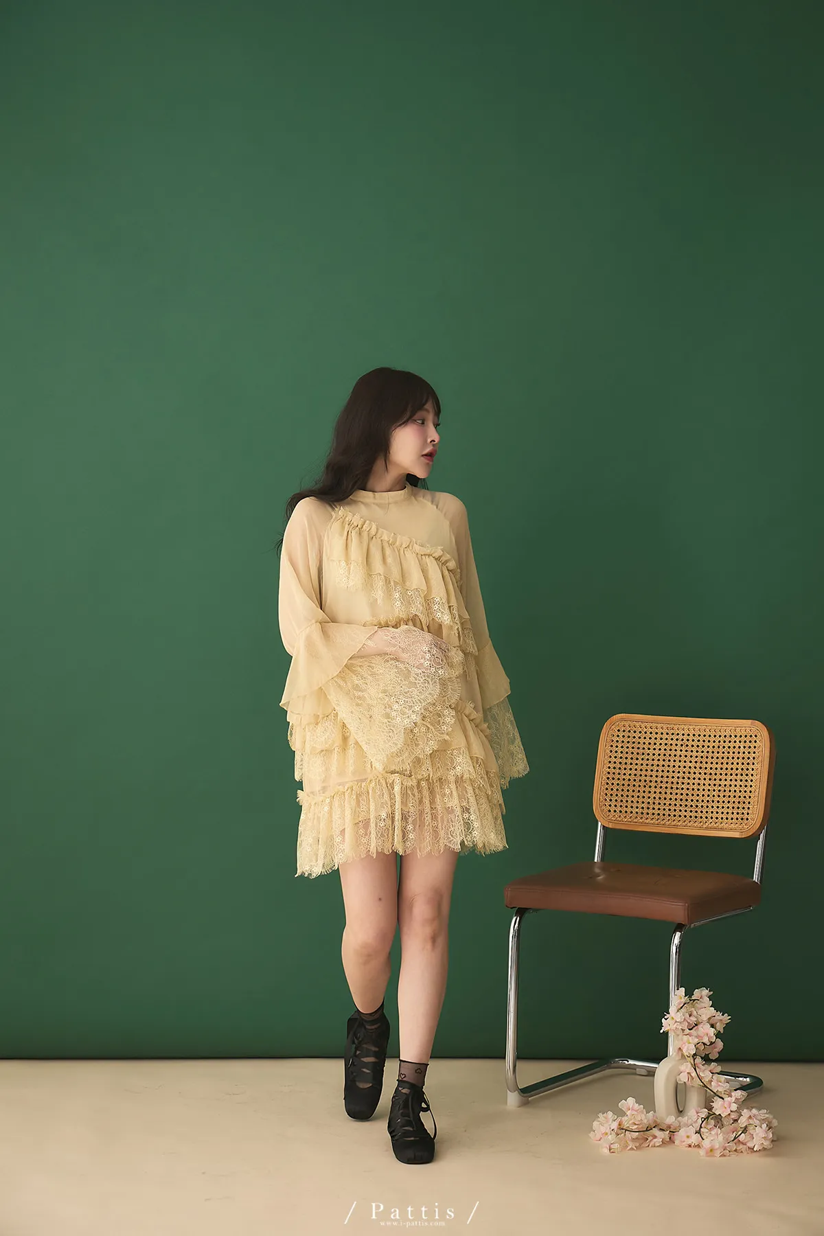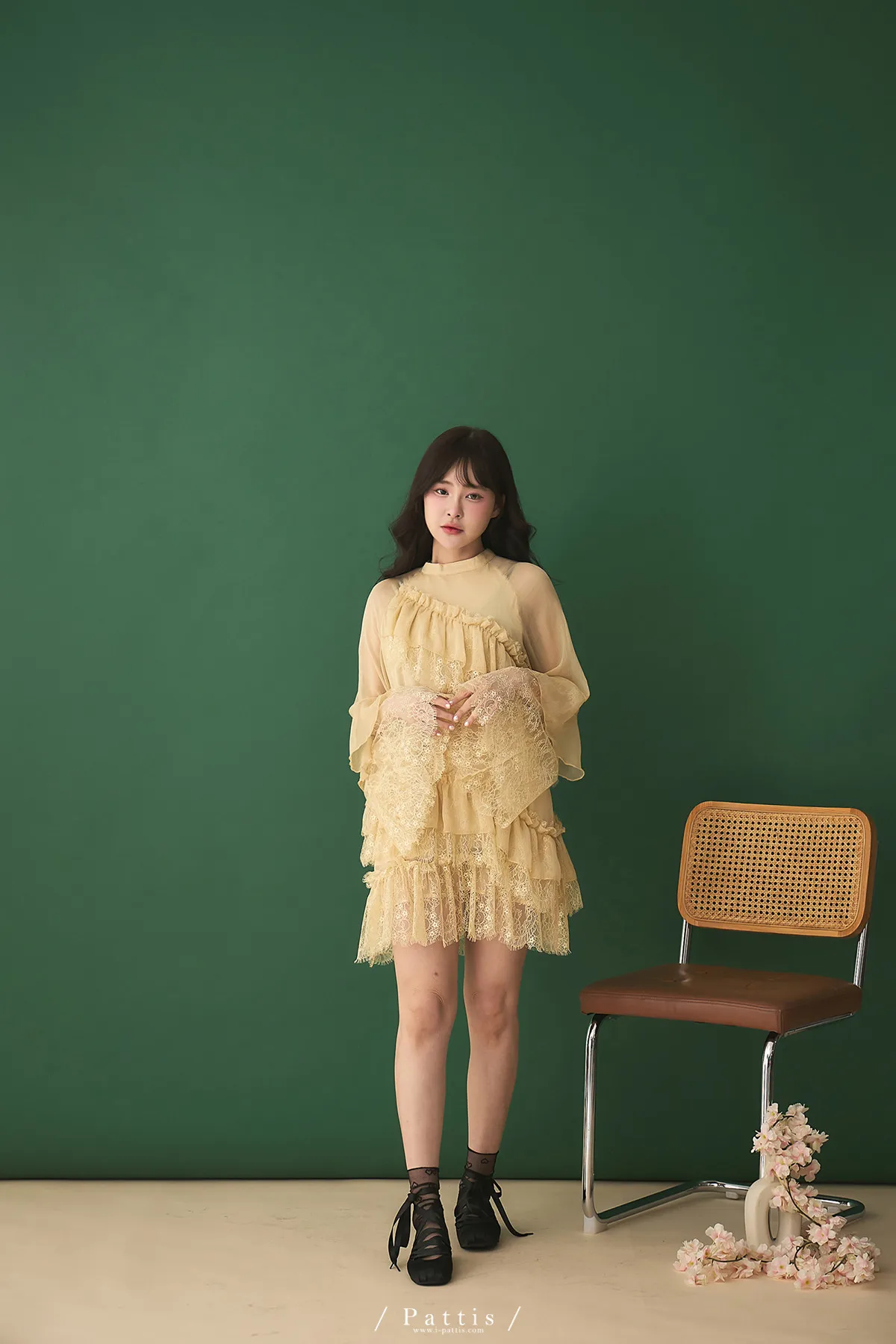 (現貨)*特*/廣州選品/ 古董蕾絲荷葉斜拼接短洋裝(黃杏)