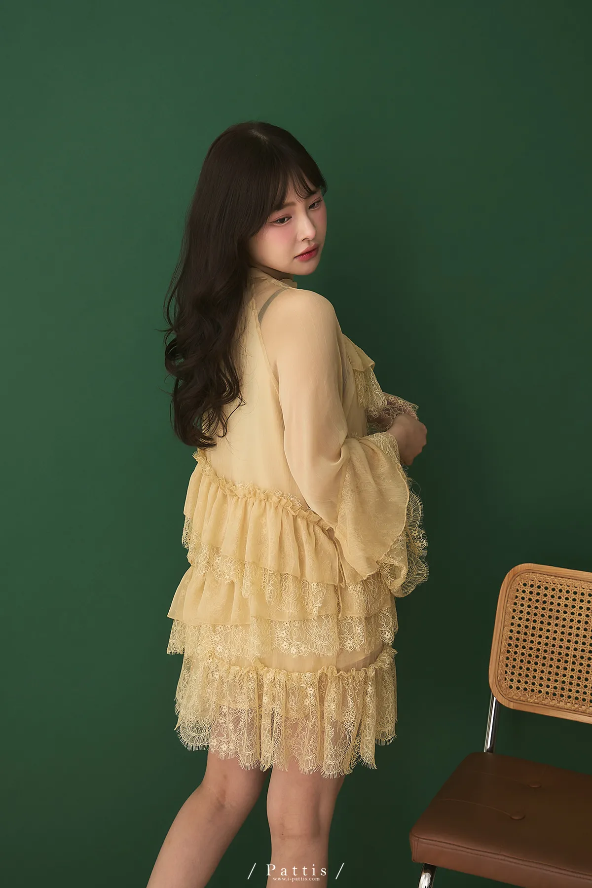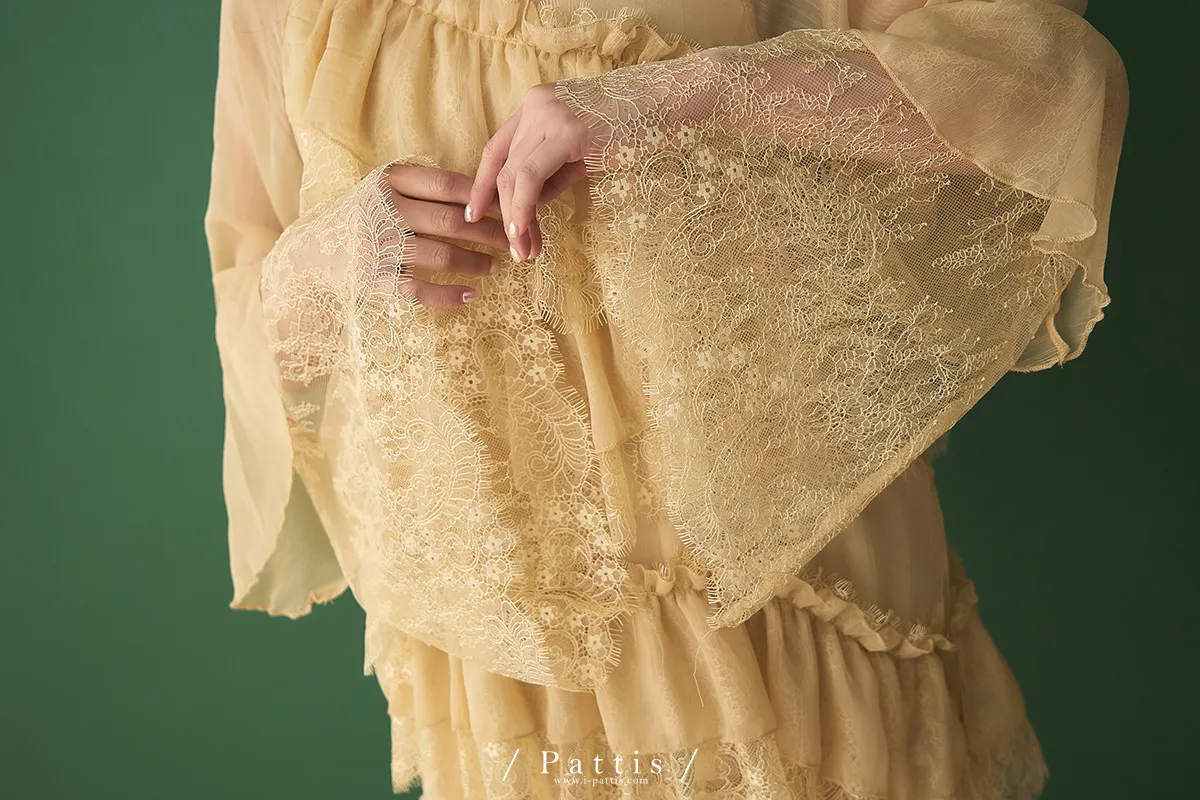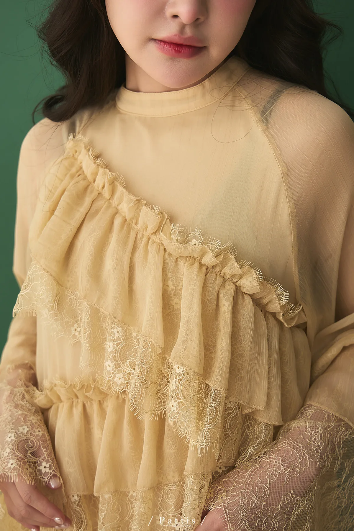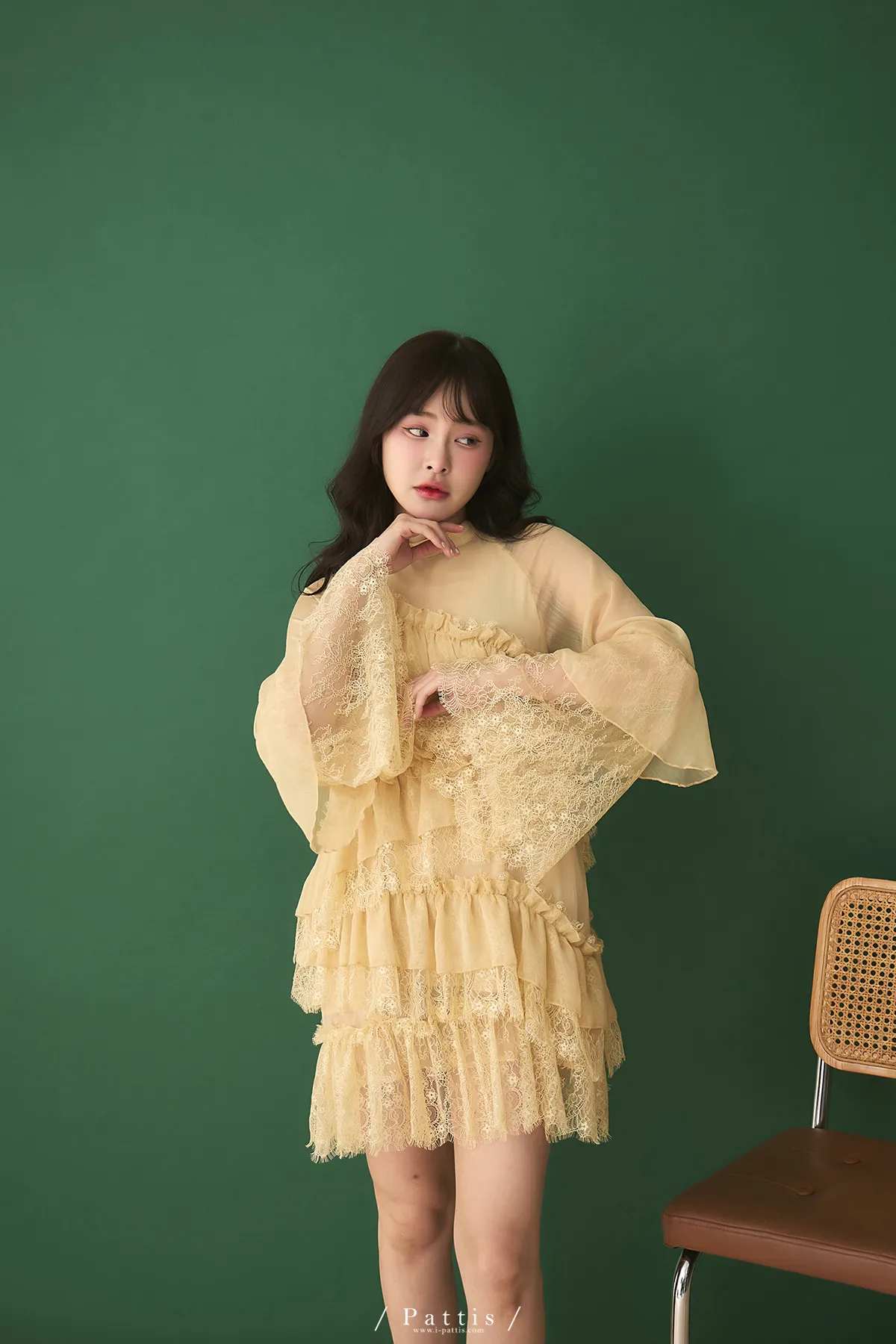 (現貨)*特*/廣州選品/ 古董蕾絲荷葉斜拼接短洋裝(黃杏)